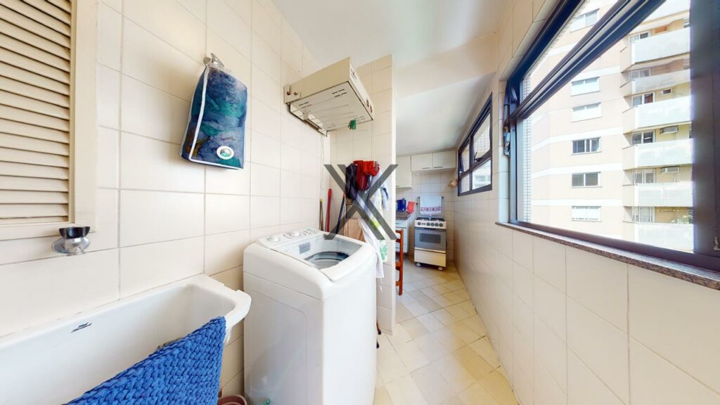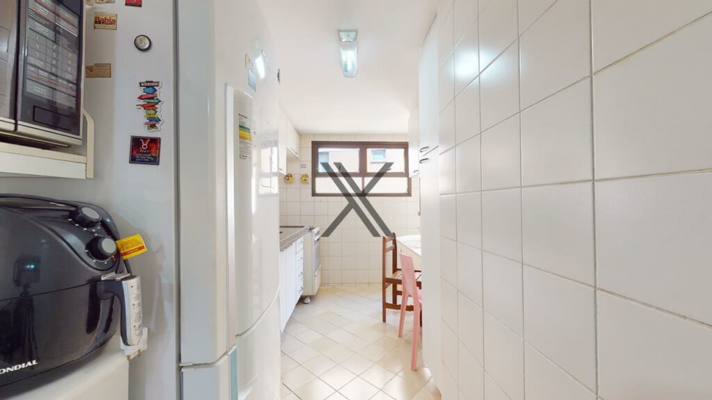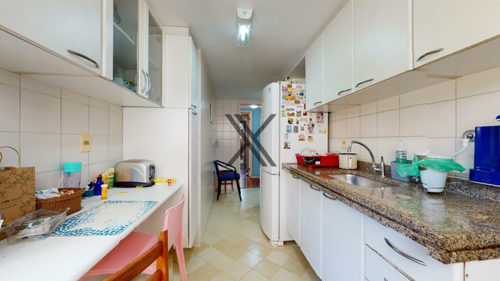 A cozinha tem um bom tamanho, possui uma pequena área para copa e uma ótima iluminação. Em anexo, estão a área de serviço e uma dependência completa para empregada, que pode ser revertida e integrada à sala ou usada como escritório.
