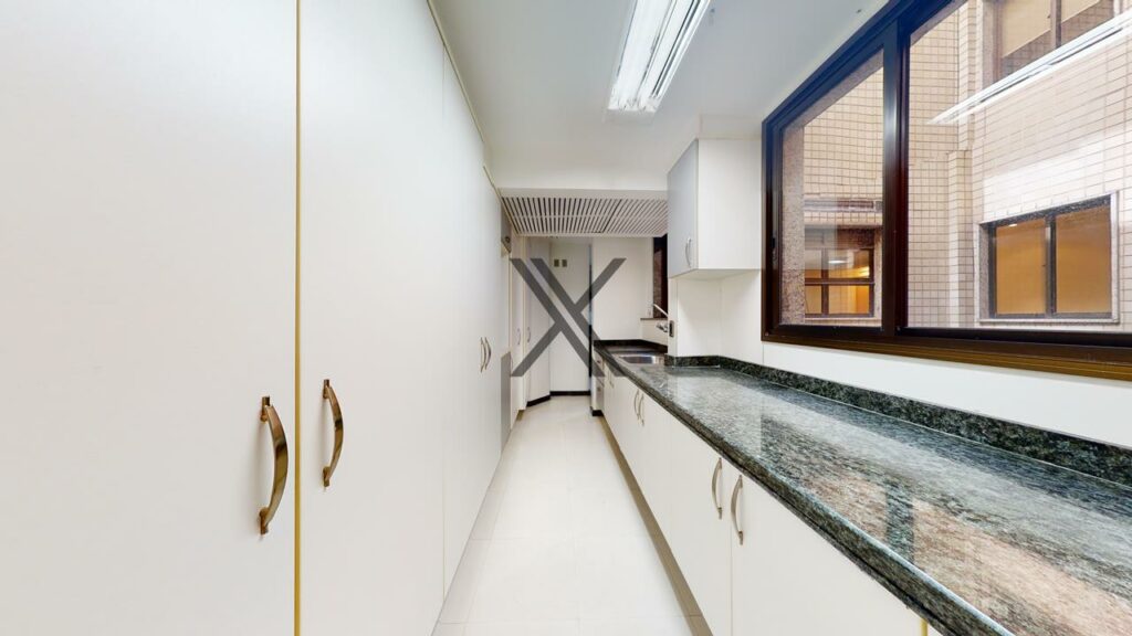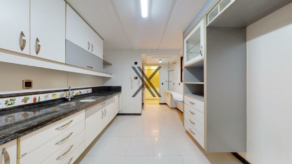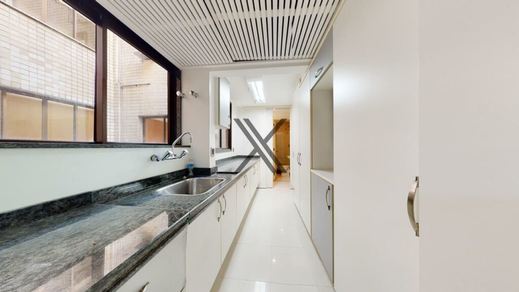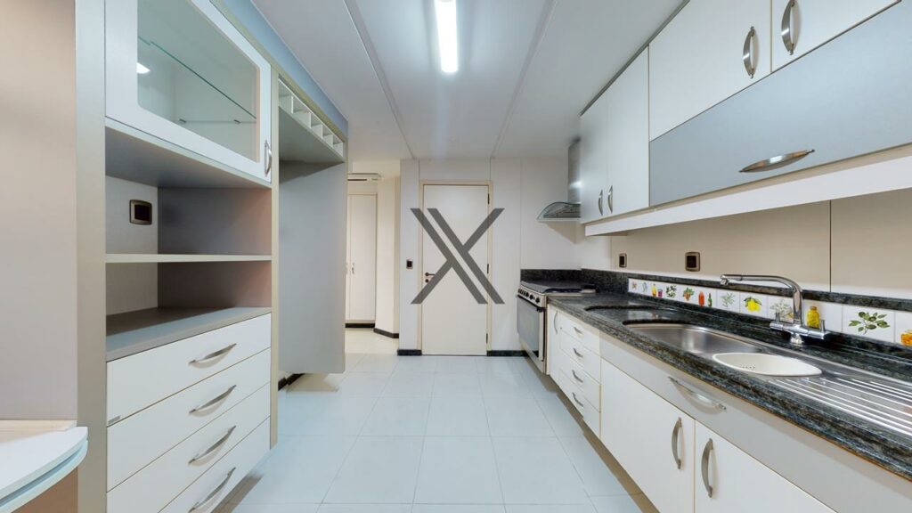A cozinha possui uma copa para a praticidade do cotidiano, um grande espaço para armários e bancadas longas para apoio e organização. A área de serviço é separada da cozinha e oferece acesso ao banheiro dos funcionários.