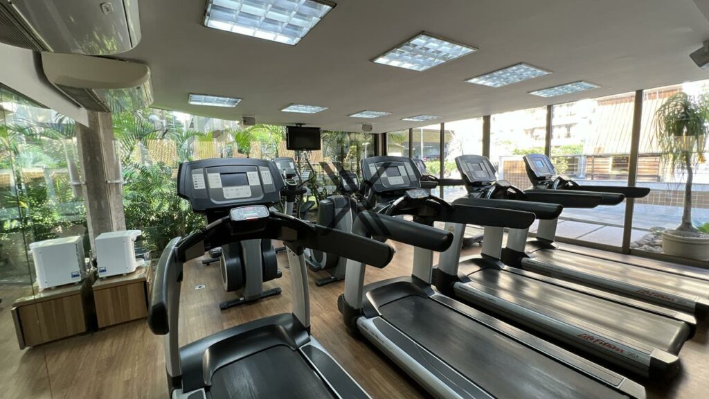 Todos os ambientes contam com aparelhos de ar-condicionado split instalados, em um projeto que visa o conforto térmico em todo o imóvel. Os acabamentos são de altíssimo padrão e de muito bom gosto. Desse modo, o apartamento conta com mármore na área social e com piso em madeira de lei na parte íntima.