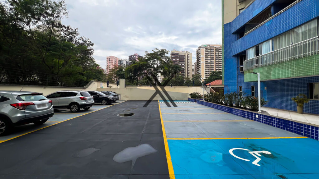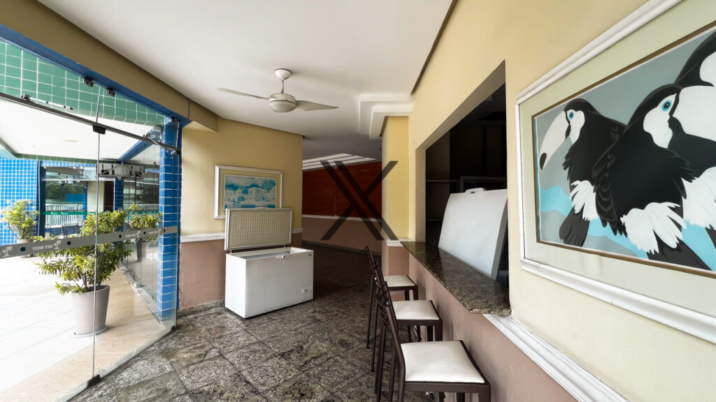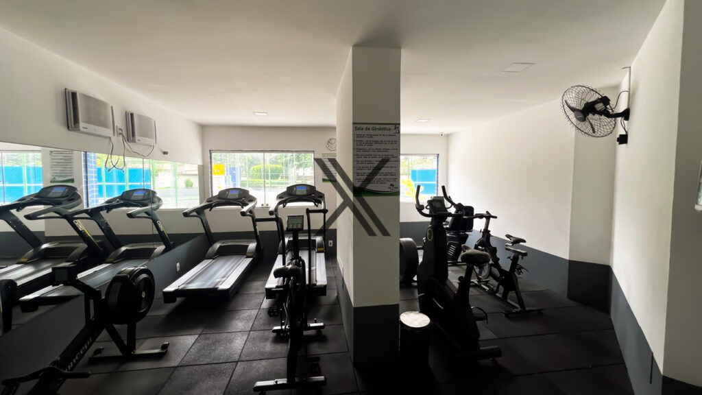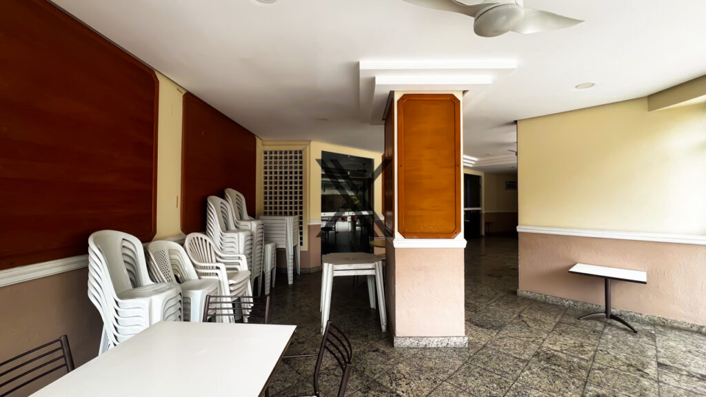 A área social é composta por uma boa sala em 2 ambientes com ventiladores de teto e ar-condicionado, além de varanda integrada. O imóvel conta com iluminação e ventilação naturais abundantes em todos os cômodos.
