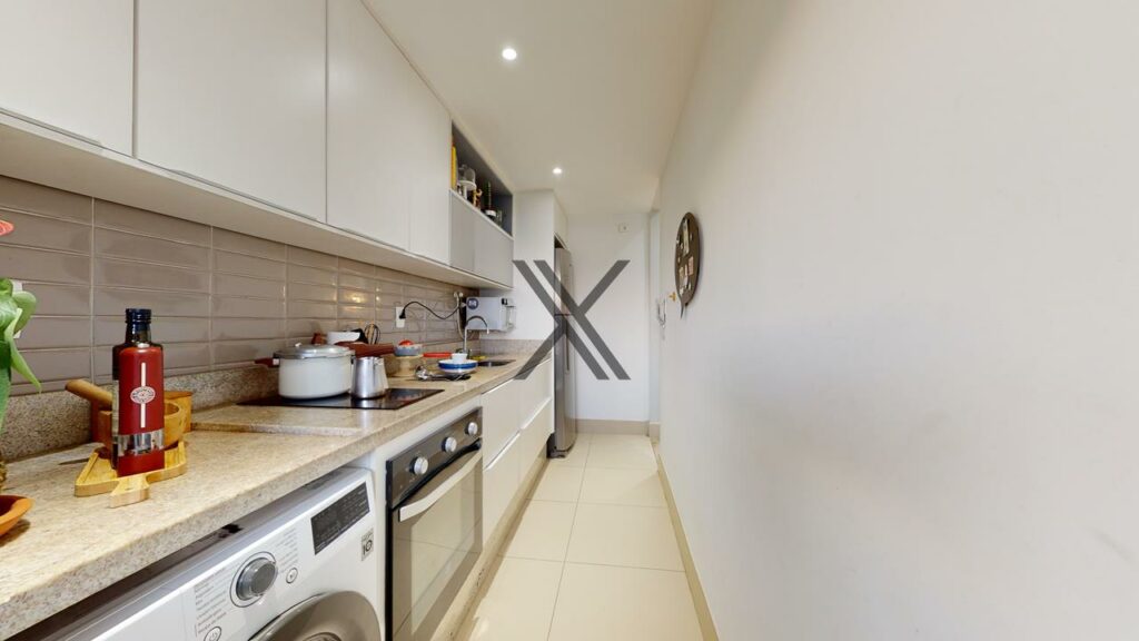 A cozinha é moderna e tem uma boa quantidade de armários planejados. Ela também dispõe de uma área de serviço integrada.