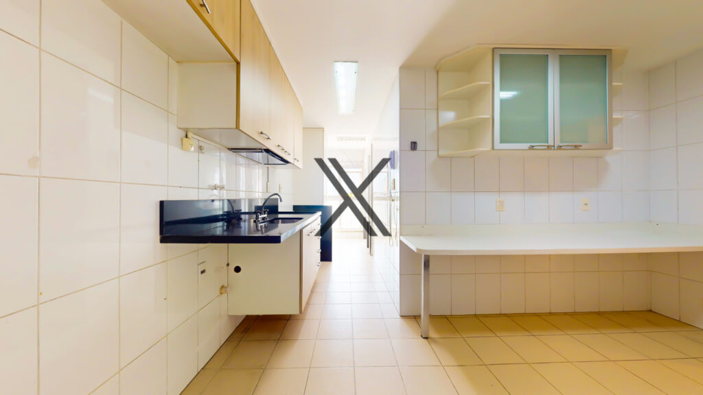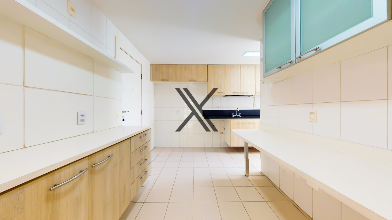 A cozinha tem uma ótima distribuição e conta com área de copa, muitos armários e longas bancadas para apoio e organização. Em anexo, área de serviço e uma dependência completa para funcionários que pode ser usada como despensa também.