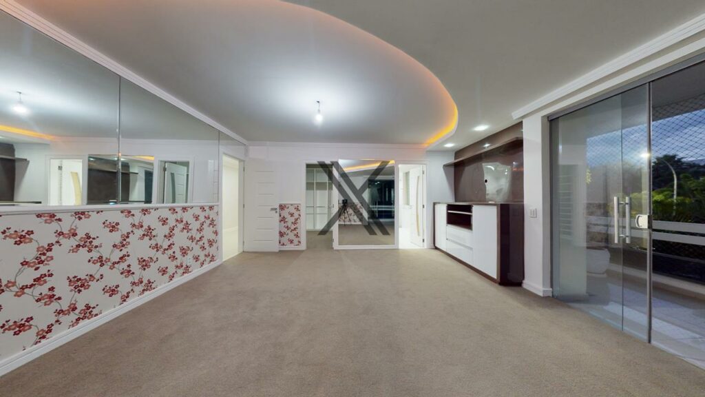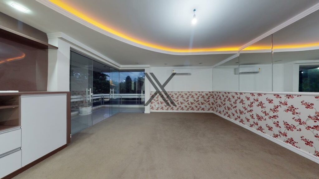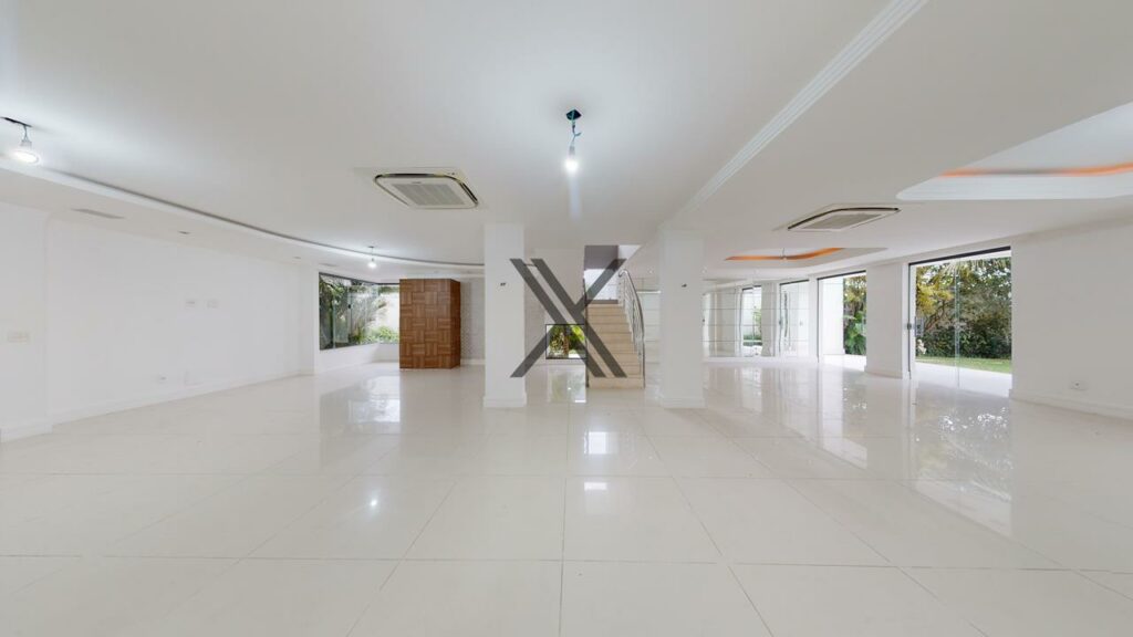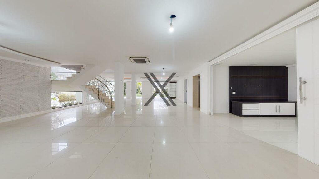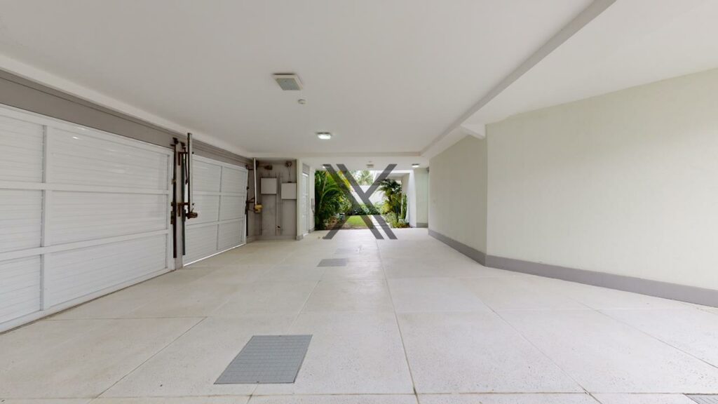 Na entrada da casa, acessada por meio de portões eletrônicos, que dão passagem à garagem, há um hall espaçoso com jardim, que leva ao espaçoso living. O cômodo é composto por sala de estar, sala de jantar e por uma sala intima de TV com grandes portas, que isolam os ambientes para maior conforto. As amplas portas em vidro oferecem vista para a extensa área de lazer com um belo jardim. No living, também estão disponíveis 2 ares-condicionados, cassete e split, e um lavabo.