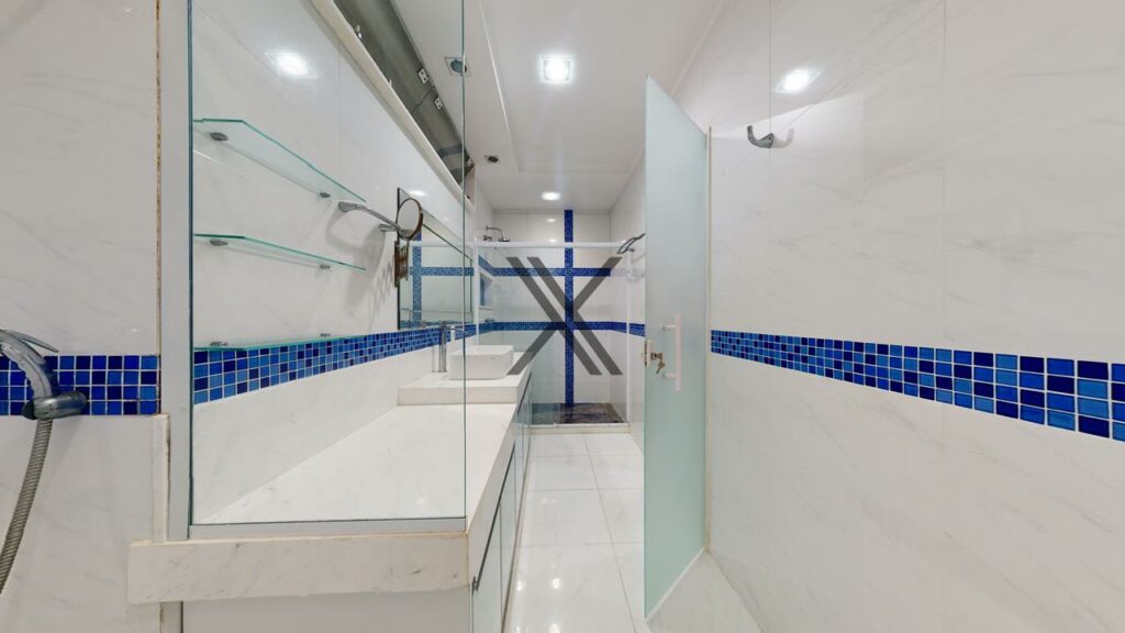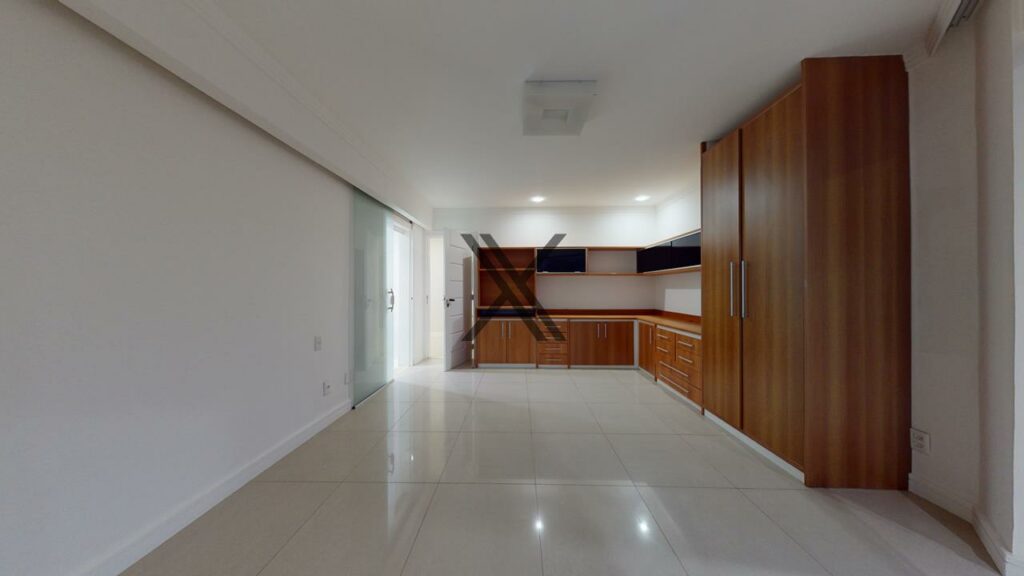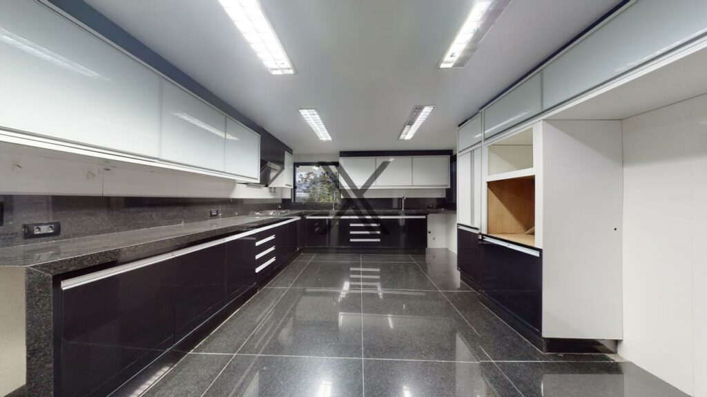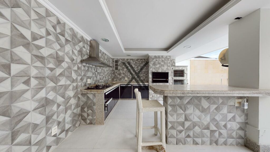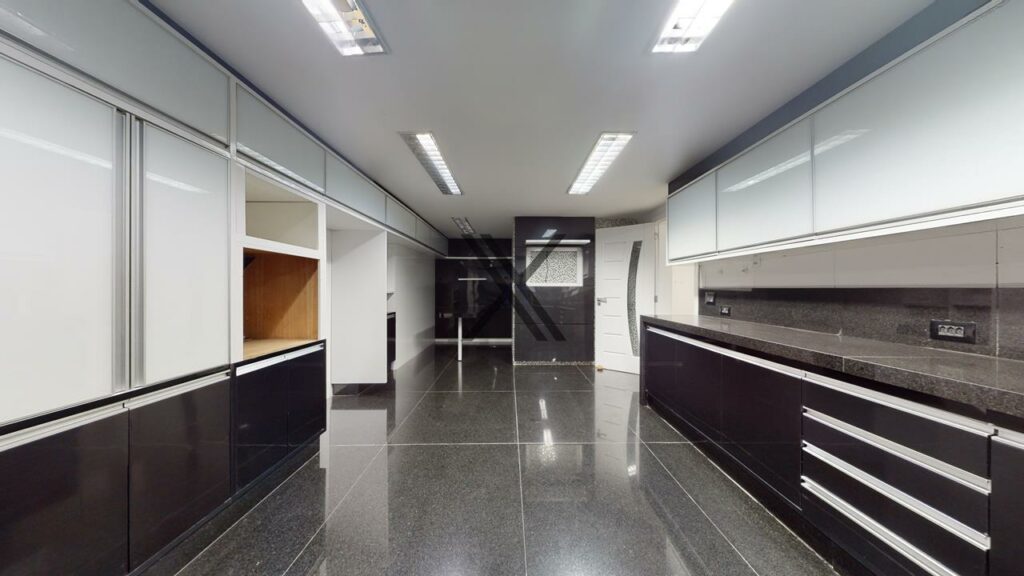 Localizada neste primeiro pavimento, a cozinha é luxuosa, equipada com aparelhos modernos e armários novos, seguindo paletas de cores que tornam o projeto ainda mais bonito, além de ter bancadas em granito que proporcionam praticidade e elegância.