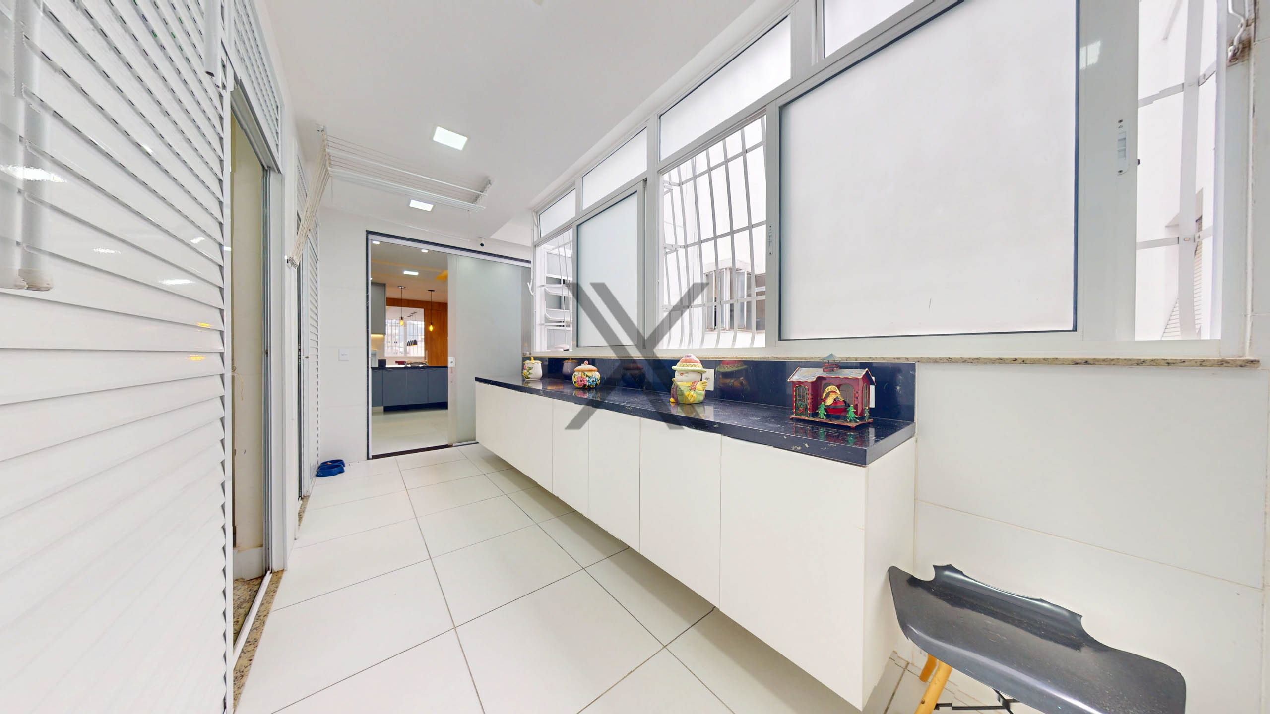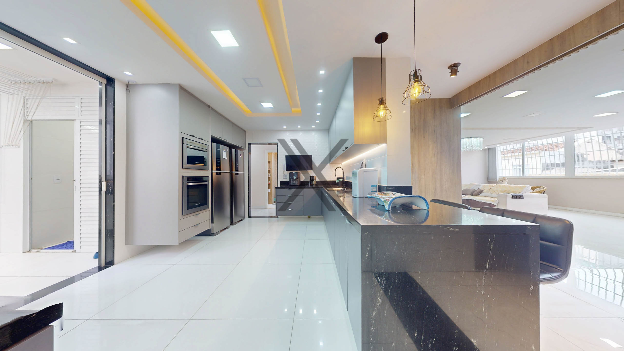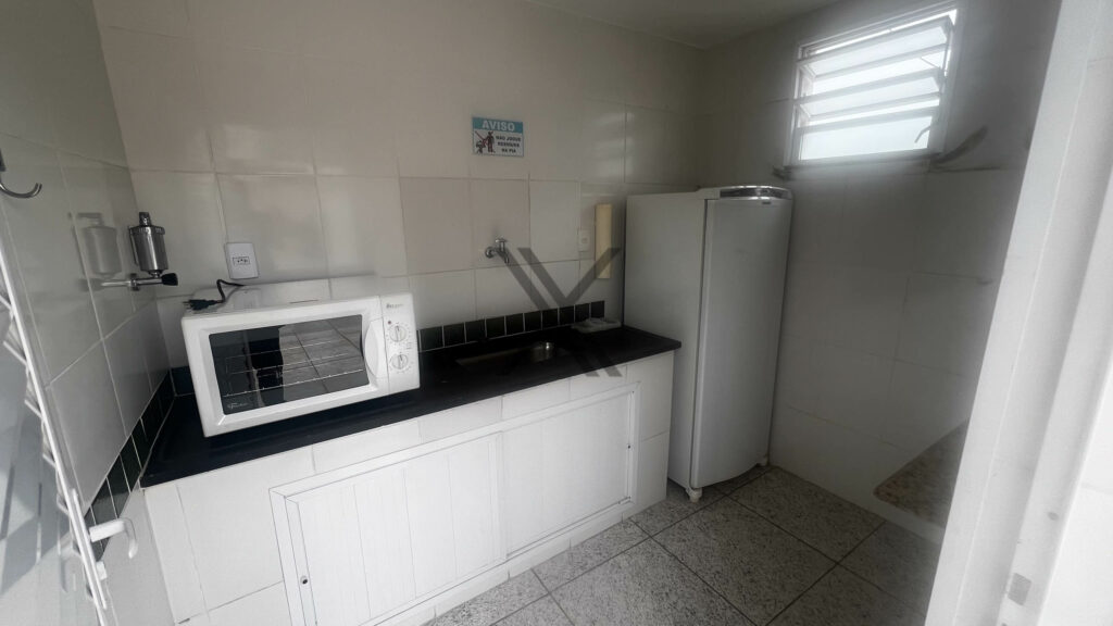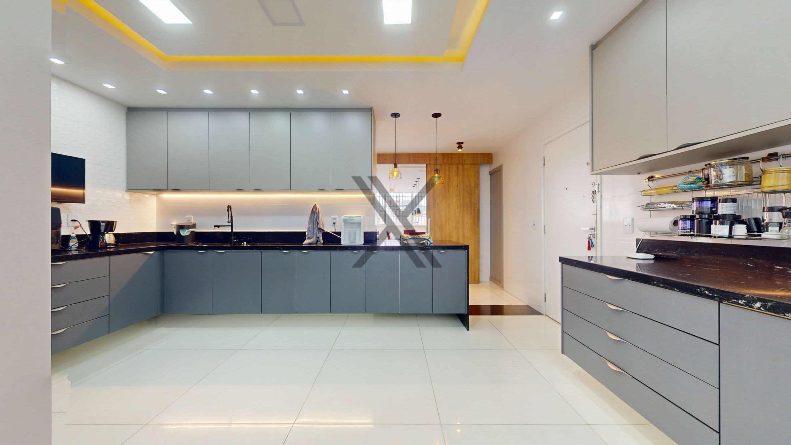 A cozinha apresenta um conceito semiaberto podendo ser integrada com a sala. O ambiente conta com bastante área de armazenagem, por contas de armários planejados, espaço para pequenas refeições, cooktop, forno elétrico e microondas. Em anexo, estão a área de serviço com lavanderia e dependência completa para funcionários.