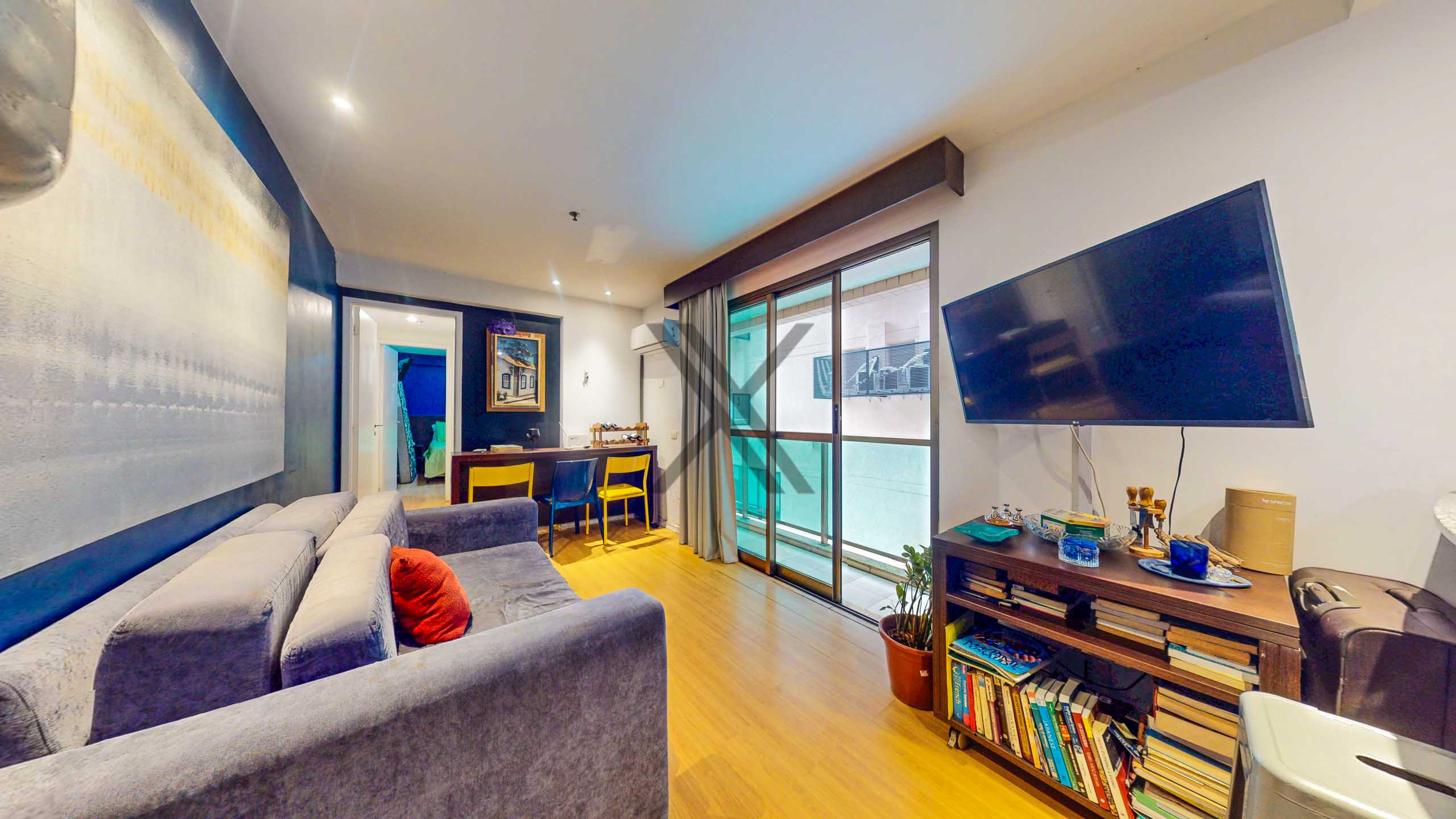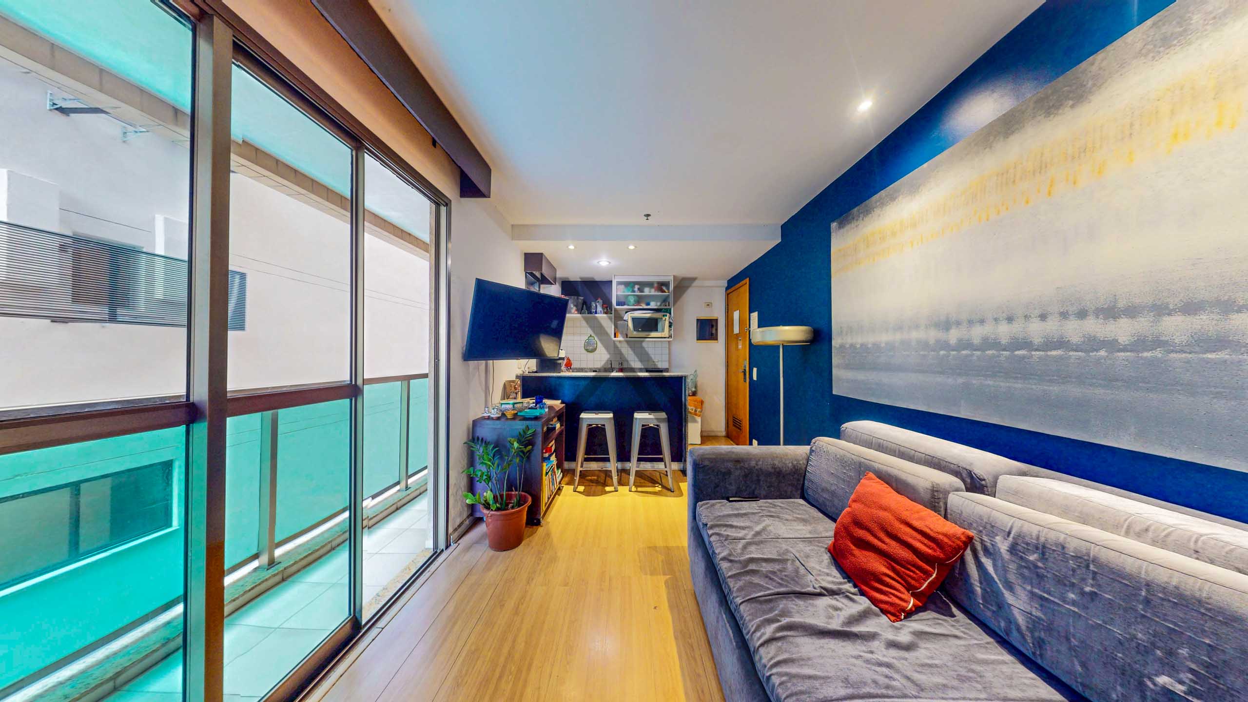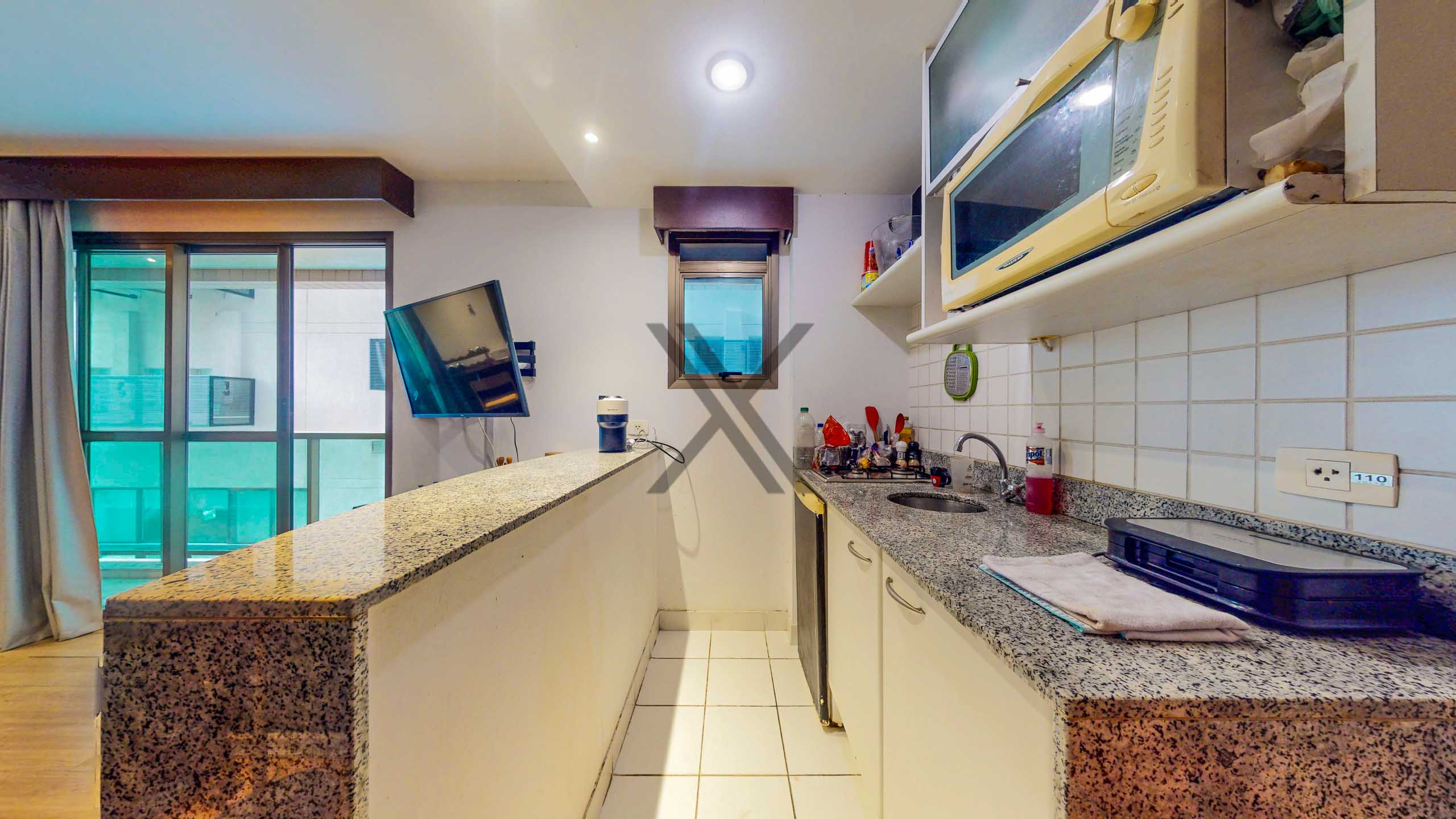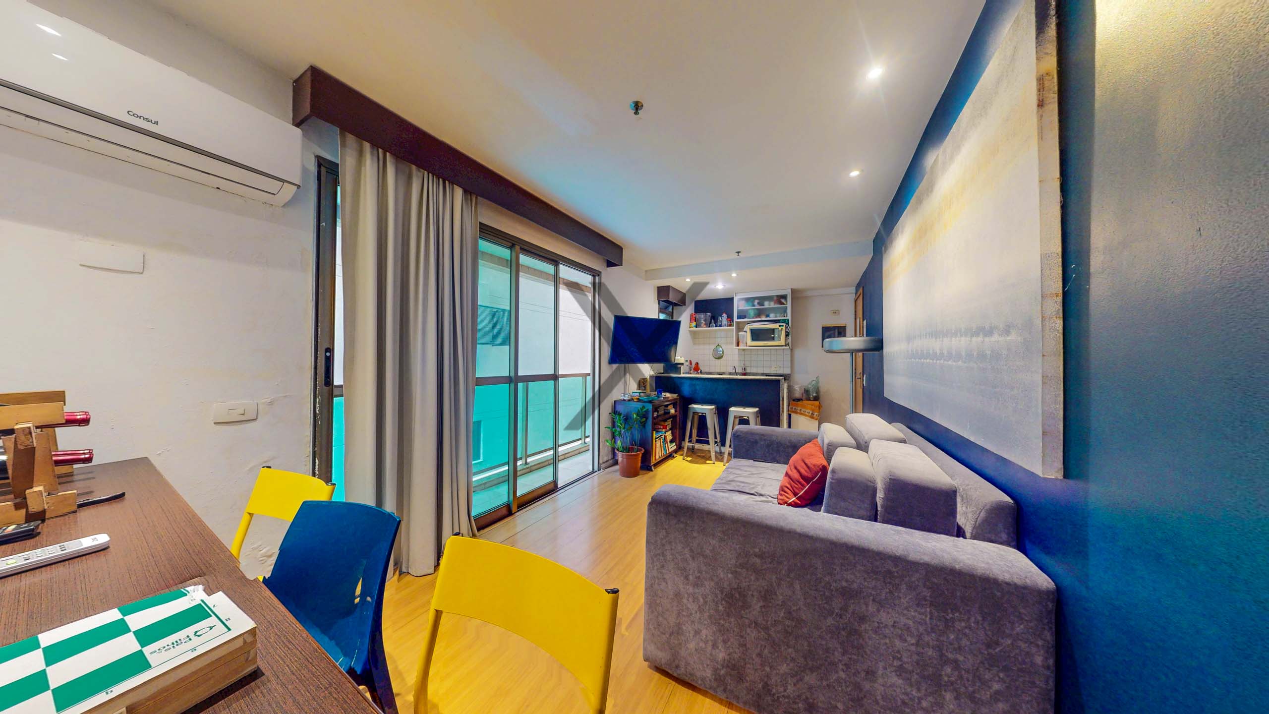 O apartamento conta com uma sala em dois ambientes com cozinha americana super funcional que dá acesso a uma varanda com vista para a piscina. O ambiente possui também um ar condicionado split instalado.