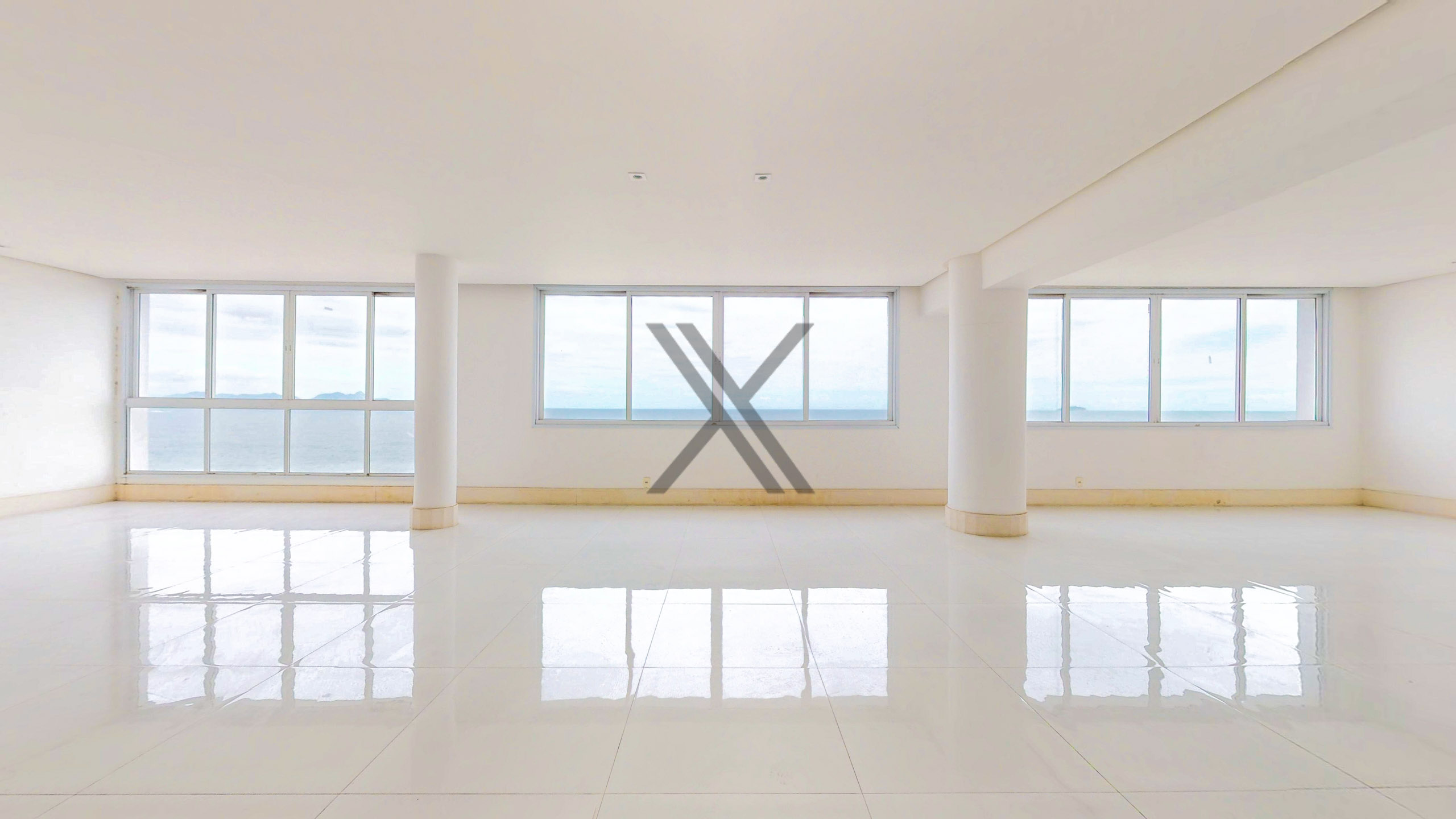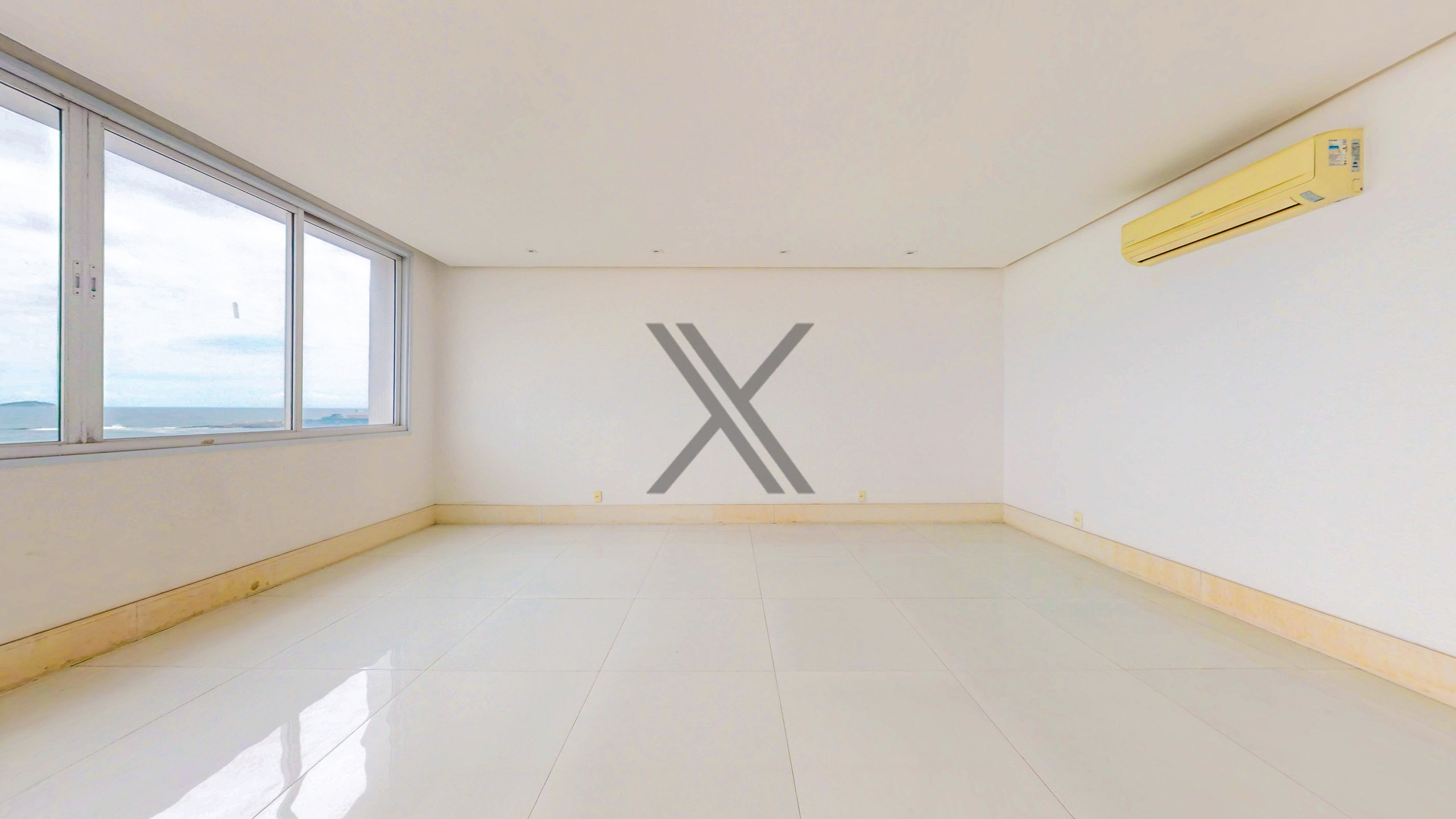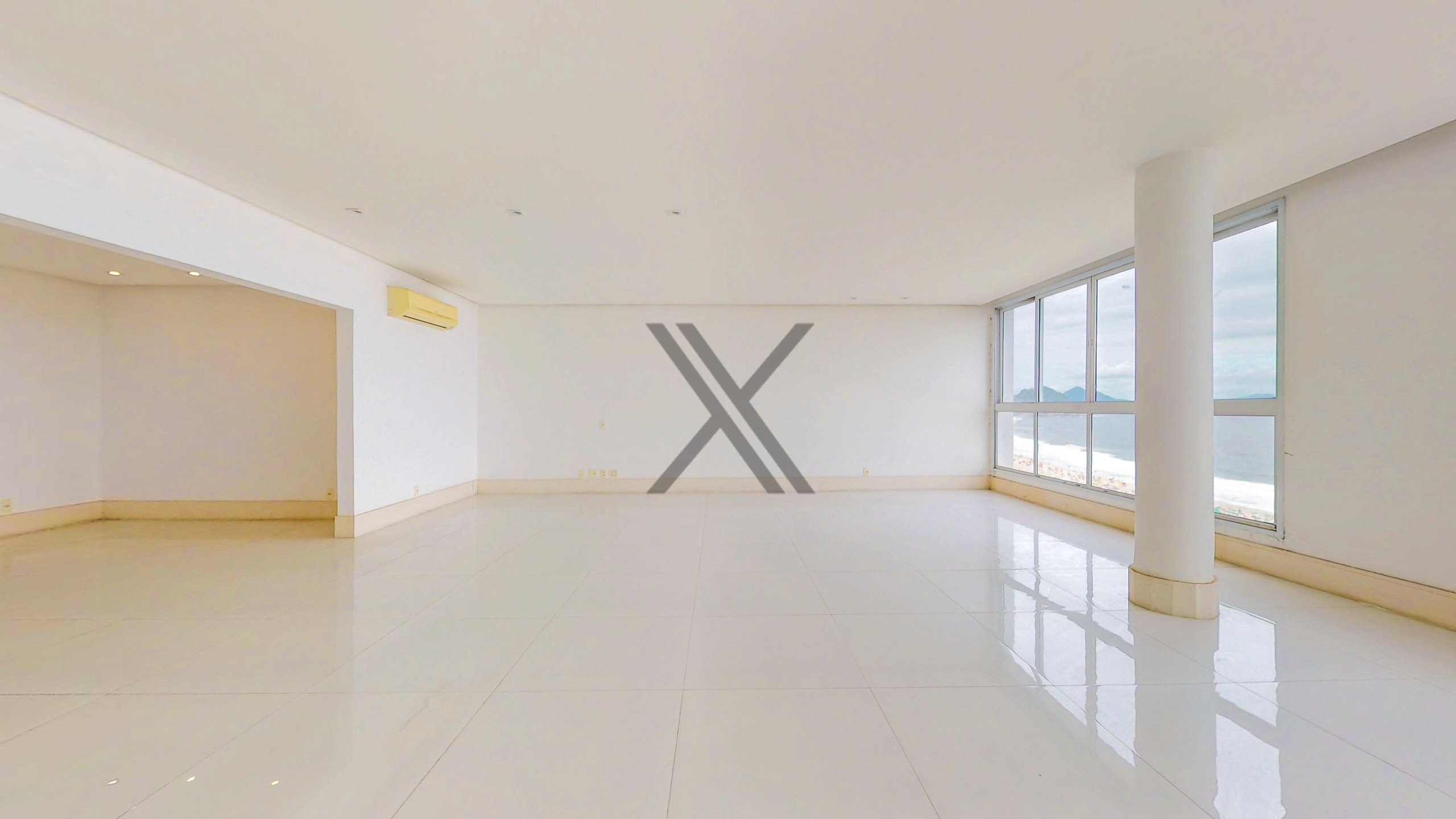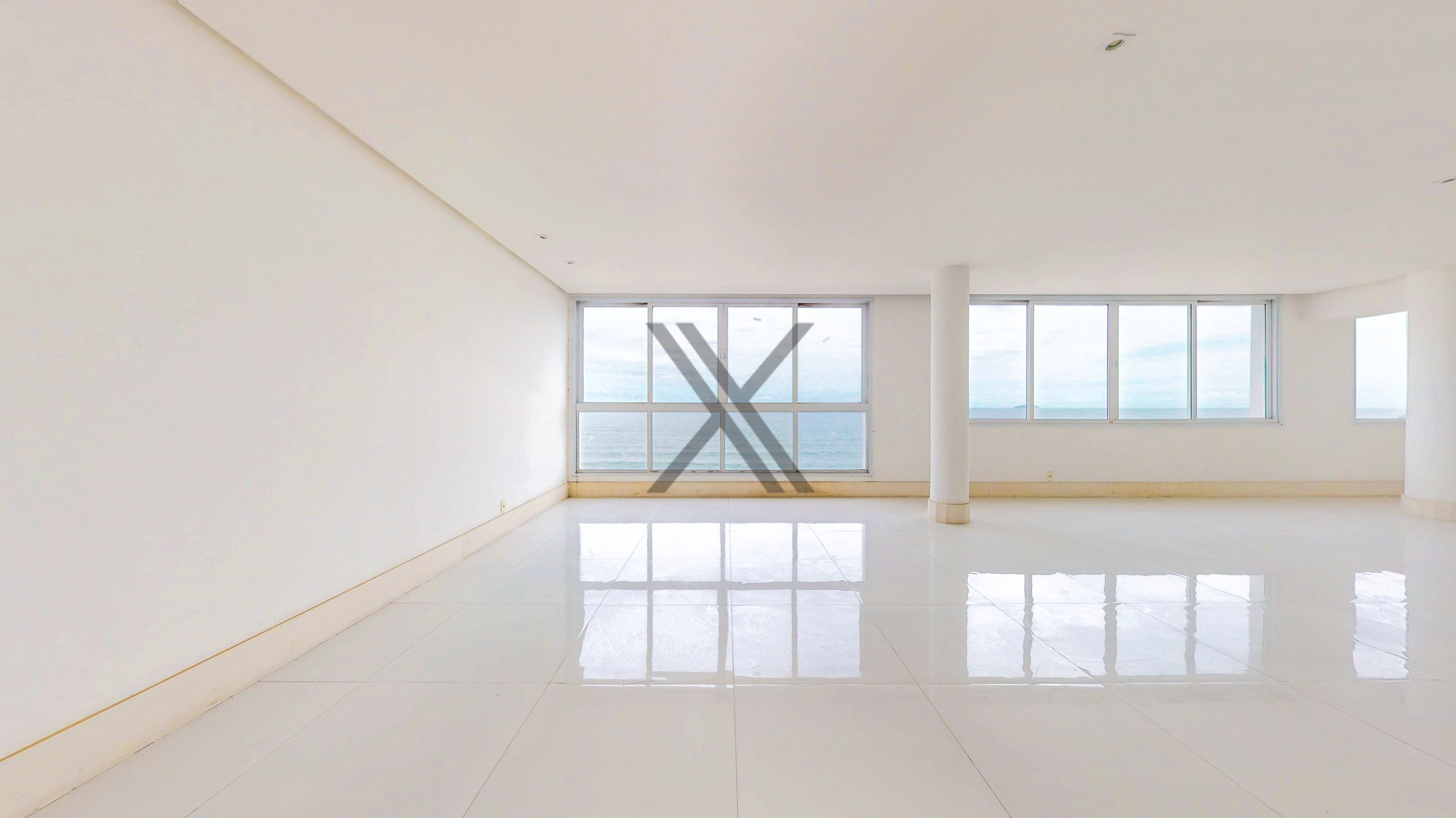 A área social apresenta uma exuberante sala, a qual pode ser dividida em 3 ambientes amplos, com excelentes iluminação e ventilação naturais devido às amplas janelas, além da vista eterna para o mar. Todo o ambiente conta com piso frio e ares condicionados splits para maior conforto térmico. No acesso à área privativa, temos um lavabo de apoio às visitas e espaço que pode ser utilizado como escritório.