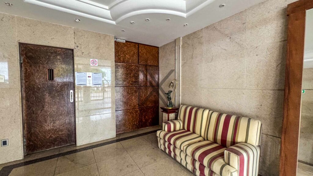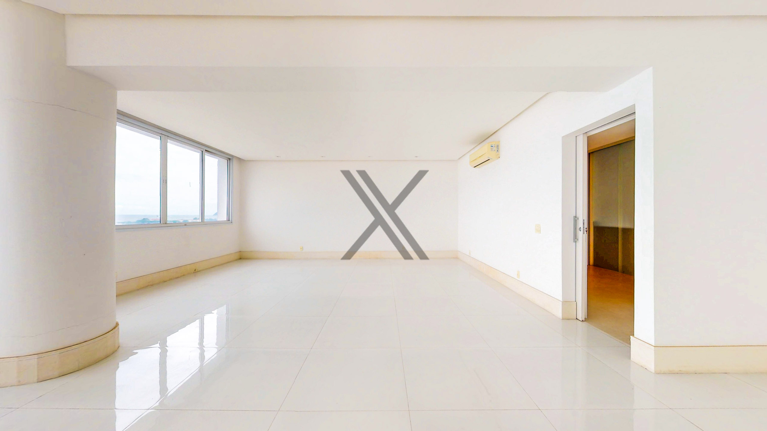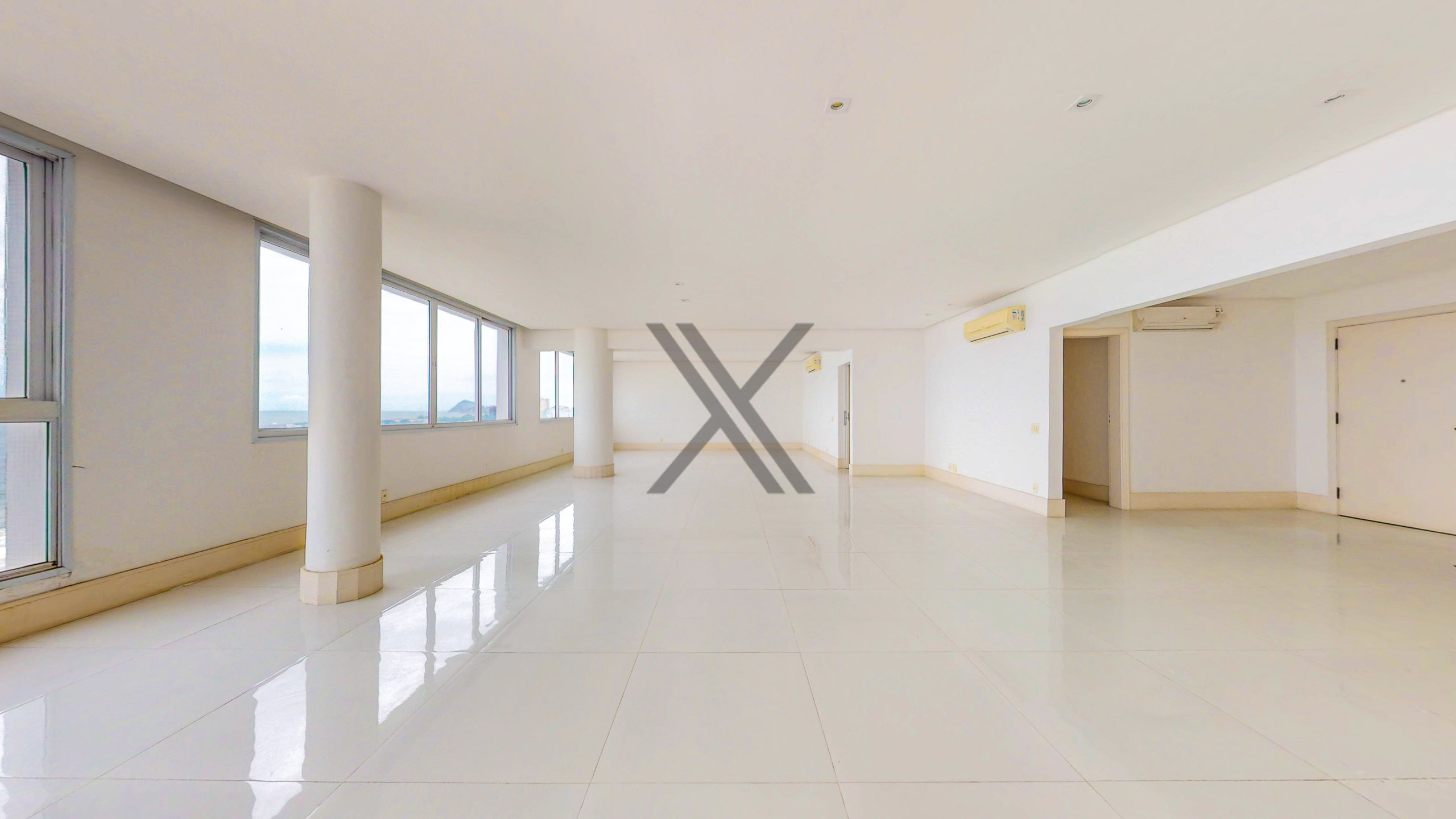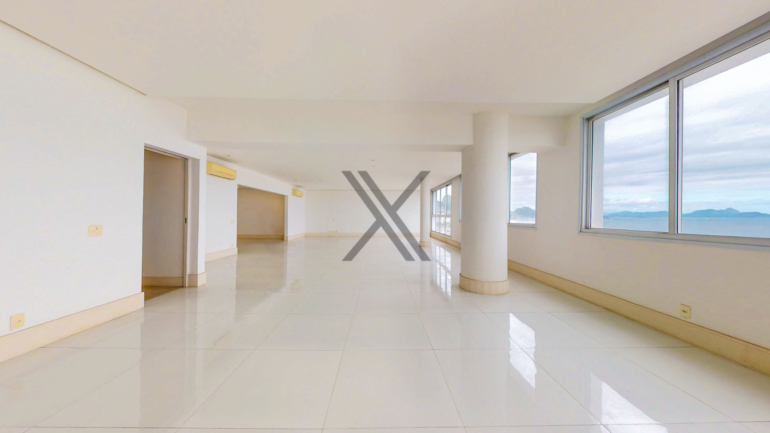 A área social apresenta uma exuberante sala, a qual pode ser dividida em 3 ambientes amplos, com excelentes iluminação e ventilação naturais devido às amplas janelas, além da vista eterna para o mar. Todo o ambiente conta com piso frio e ares condicionados splits para maior conforto térmico. No acesso à área privativa, temos um lavabo de apoio às visitas e espaço que pode ser utilizado como escritório.