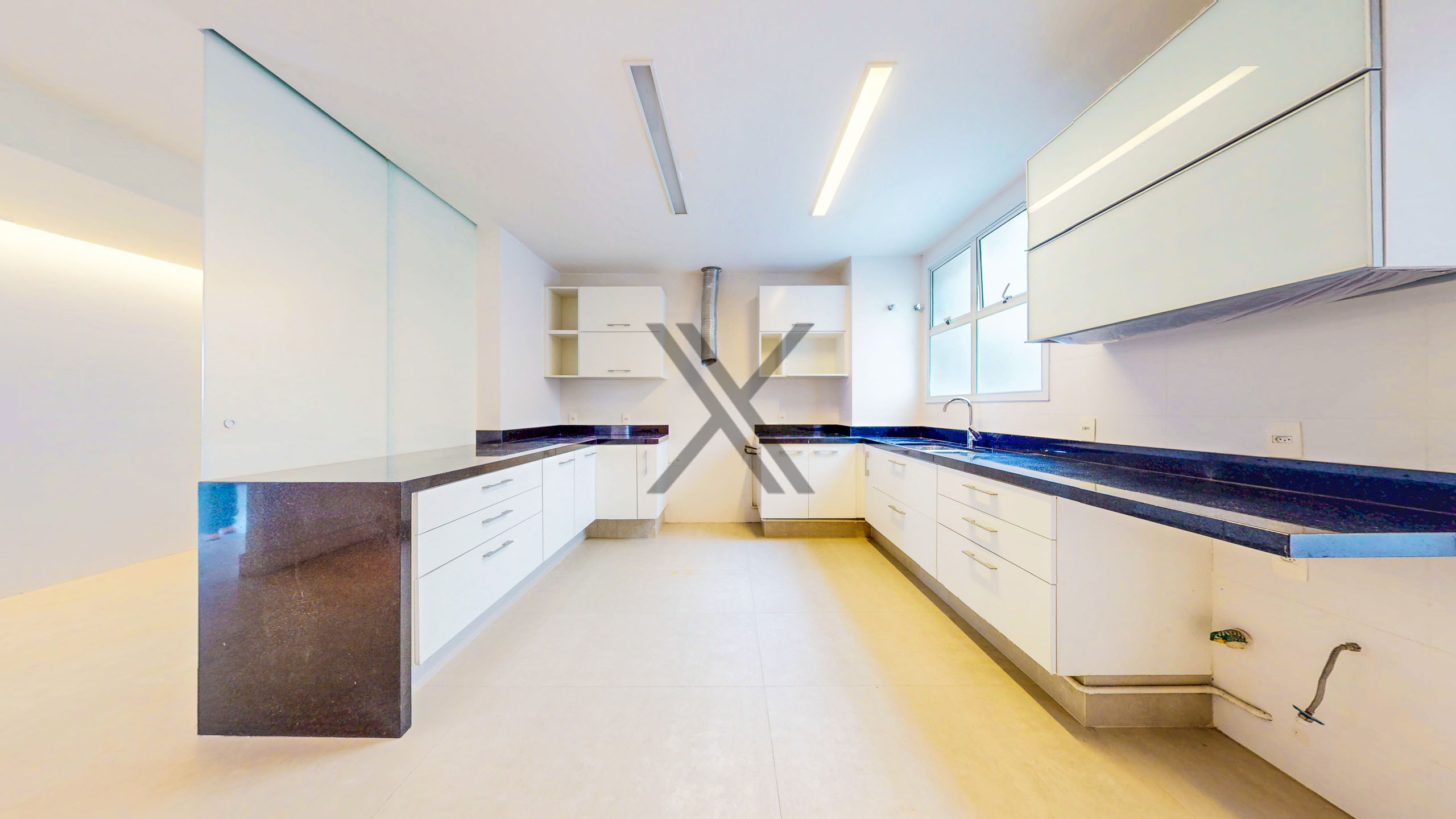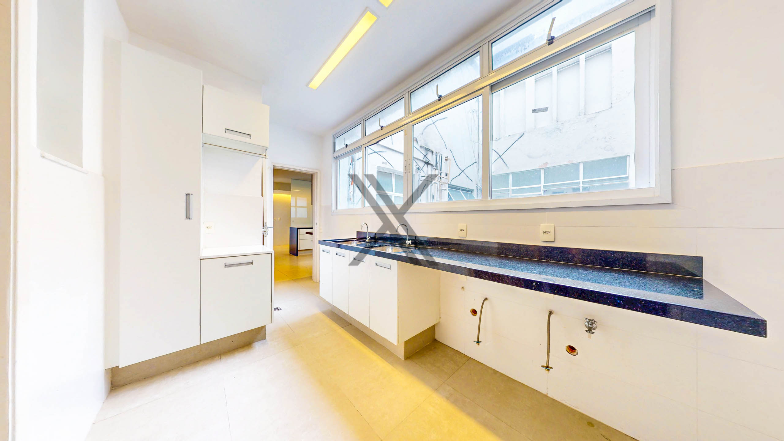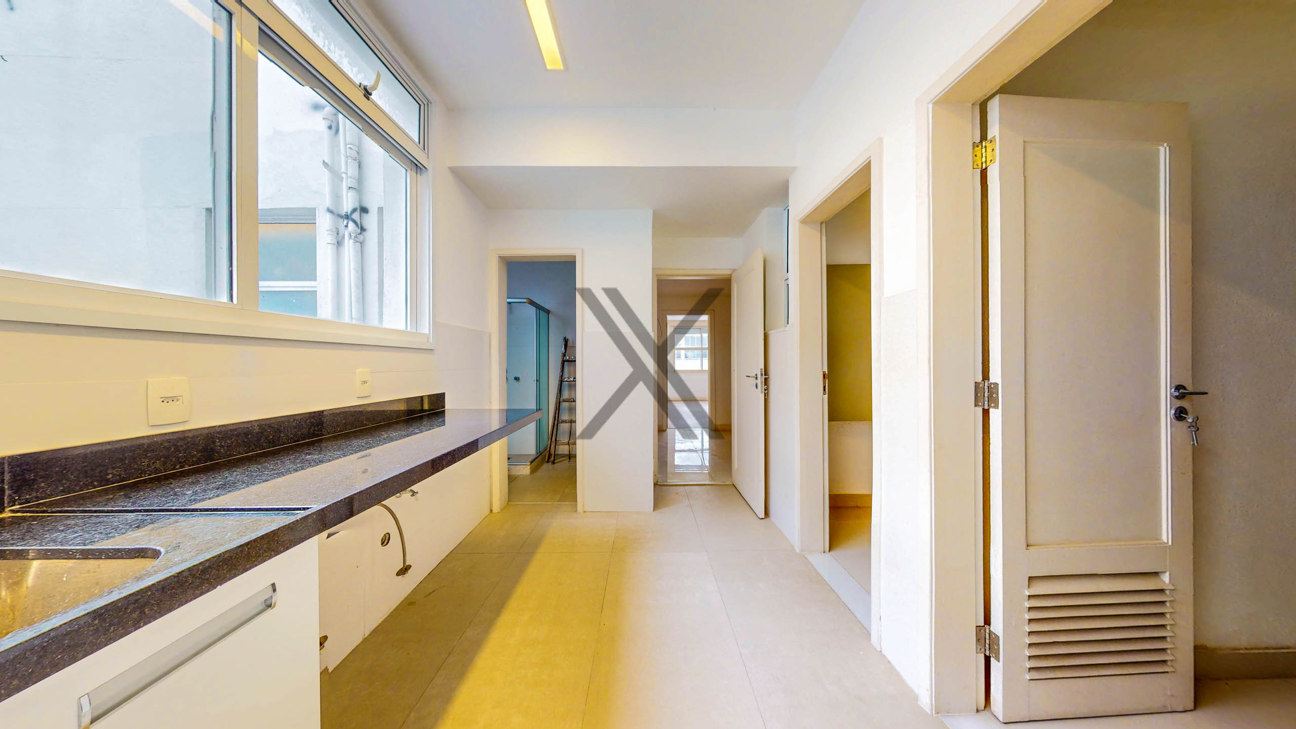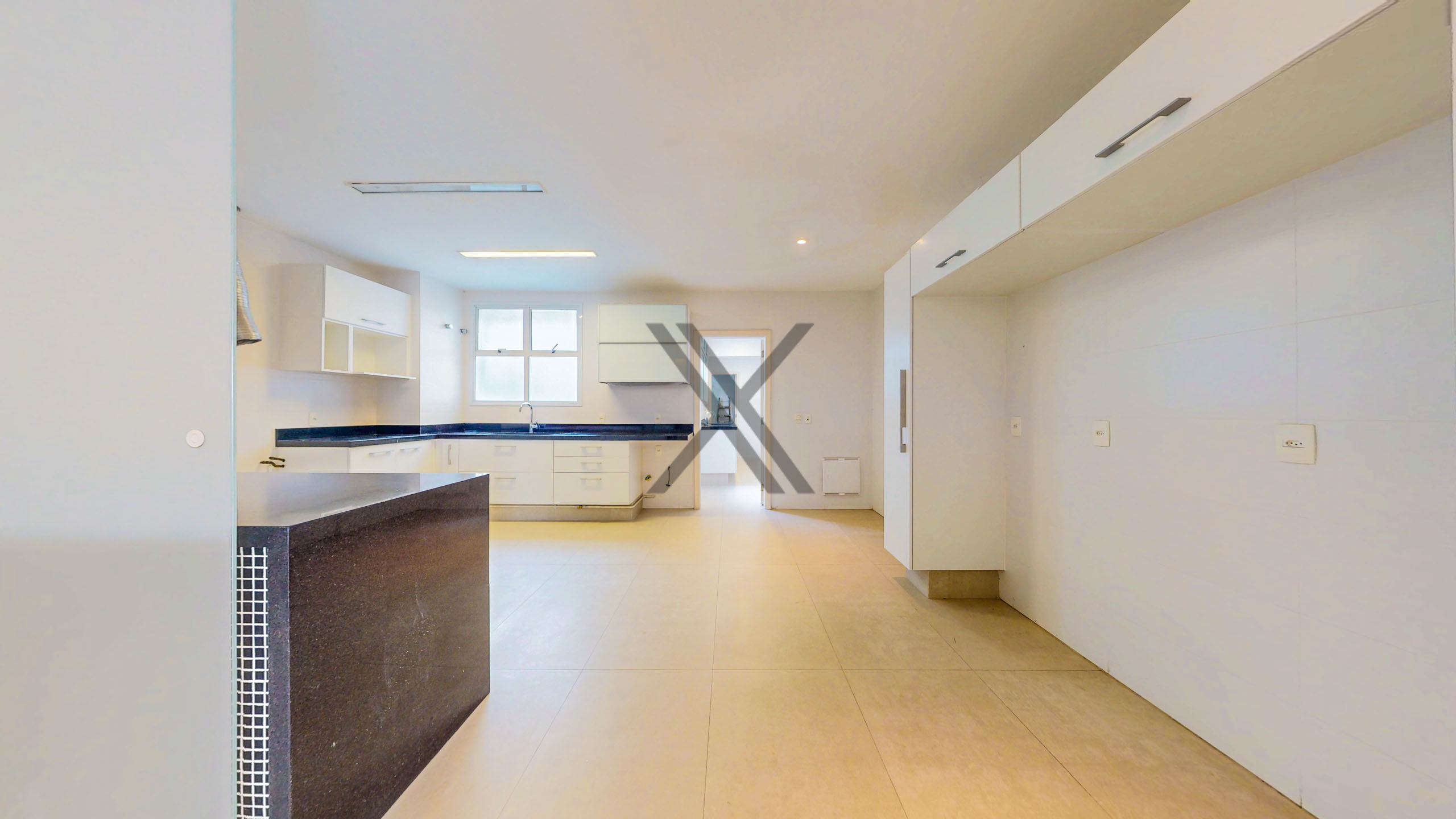 A cozinha tem um generoso espaço, com área de copa para a praticidade do dia a dia dos moradores, boa quantidade de armários e bancadas longas para apoio e organização. Em anexo ao cômodo estão a área de serviço e duas dependências completas para funcionários.