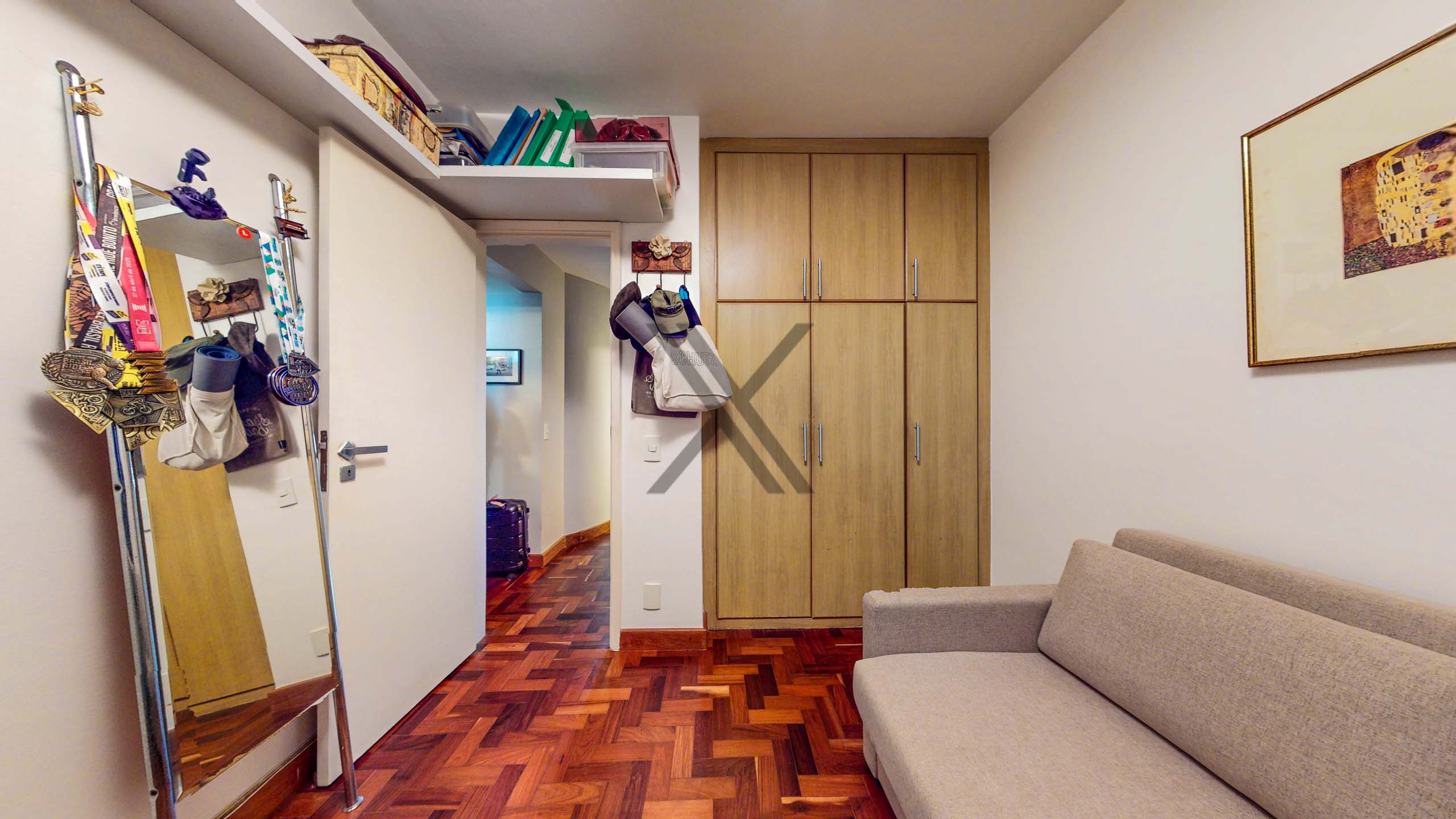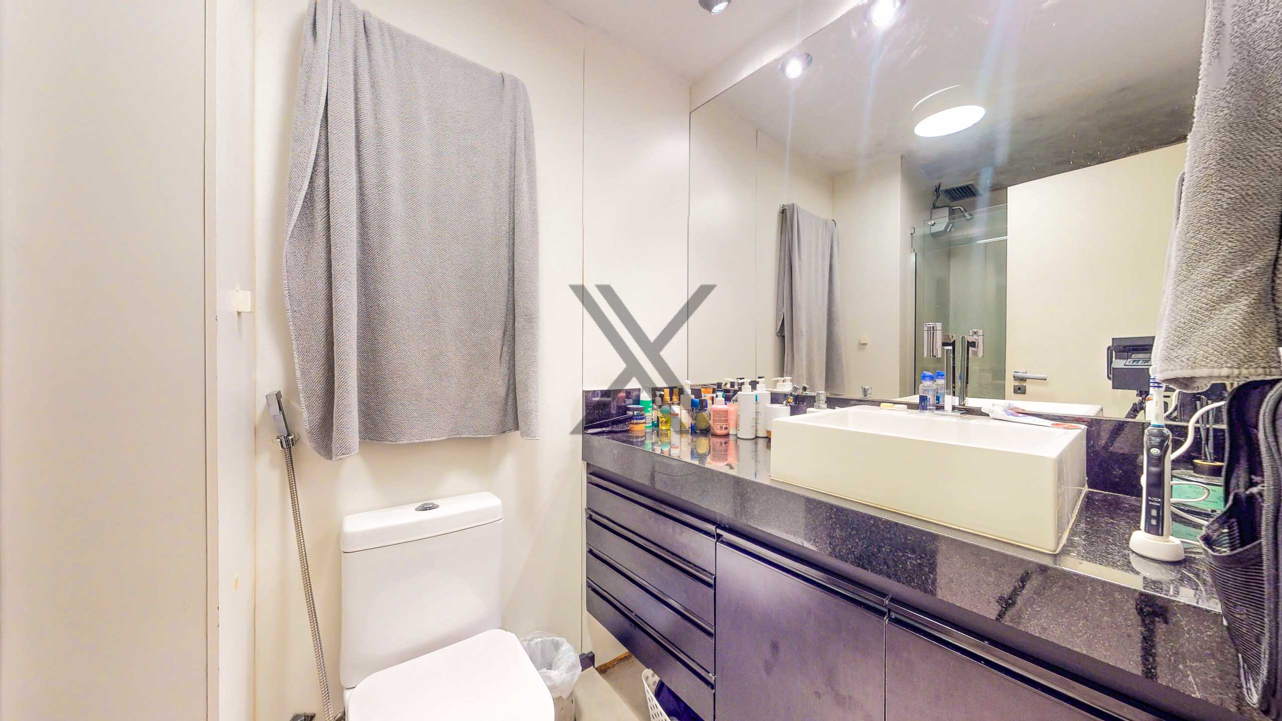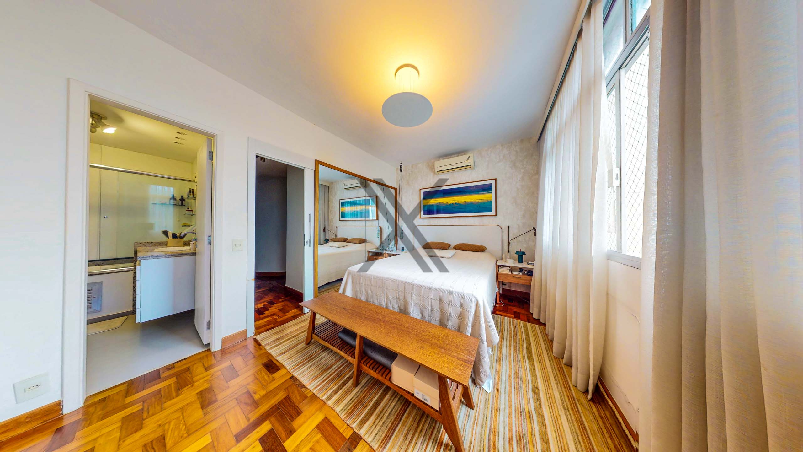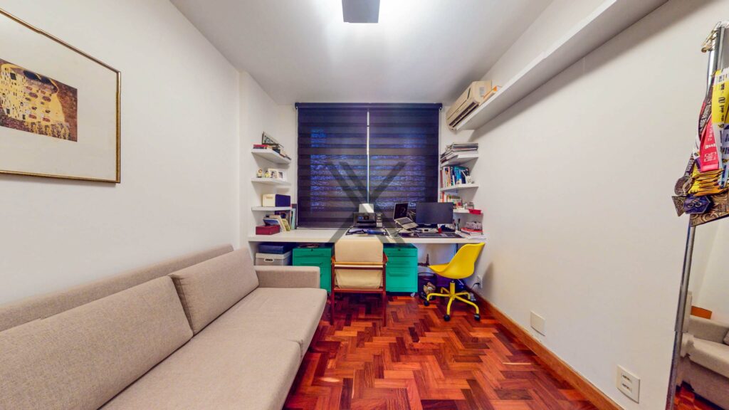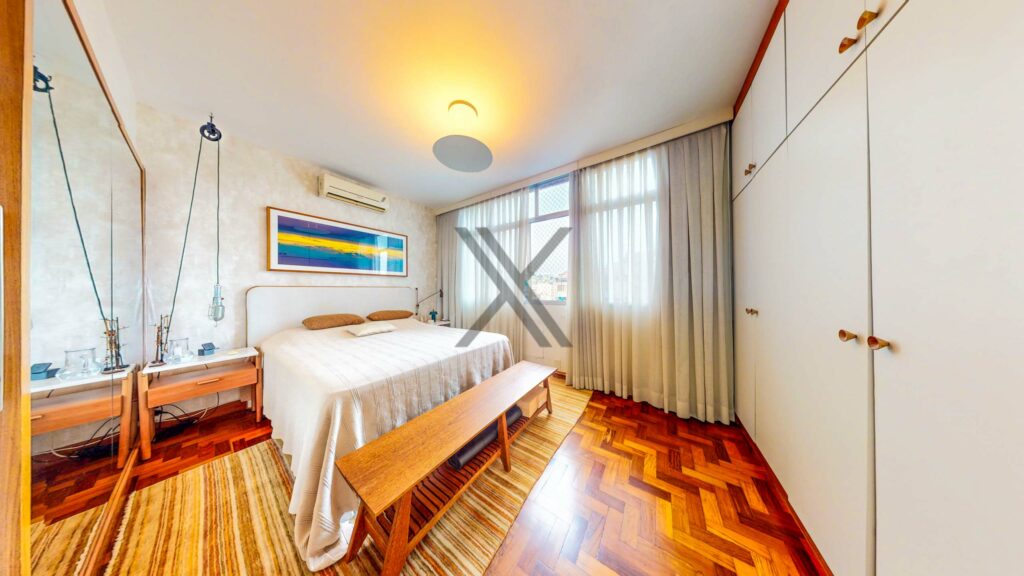 A parte privativa apresenta 3 quartos, sendo 1 suíte, ambos com boa iluminação, armários e ares-condicionados novos e instalados. Um banheiro social complementa o ambiente.