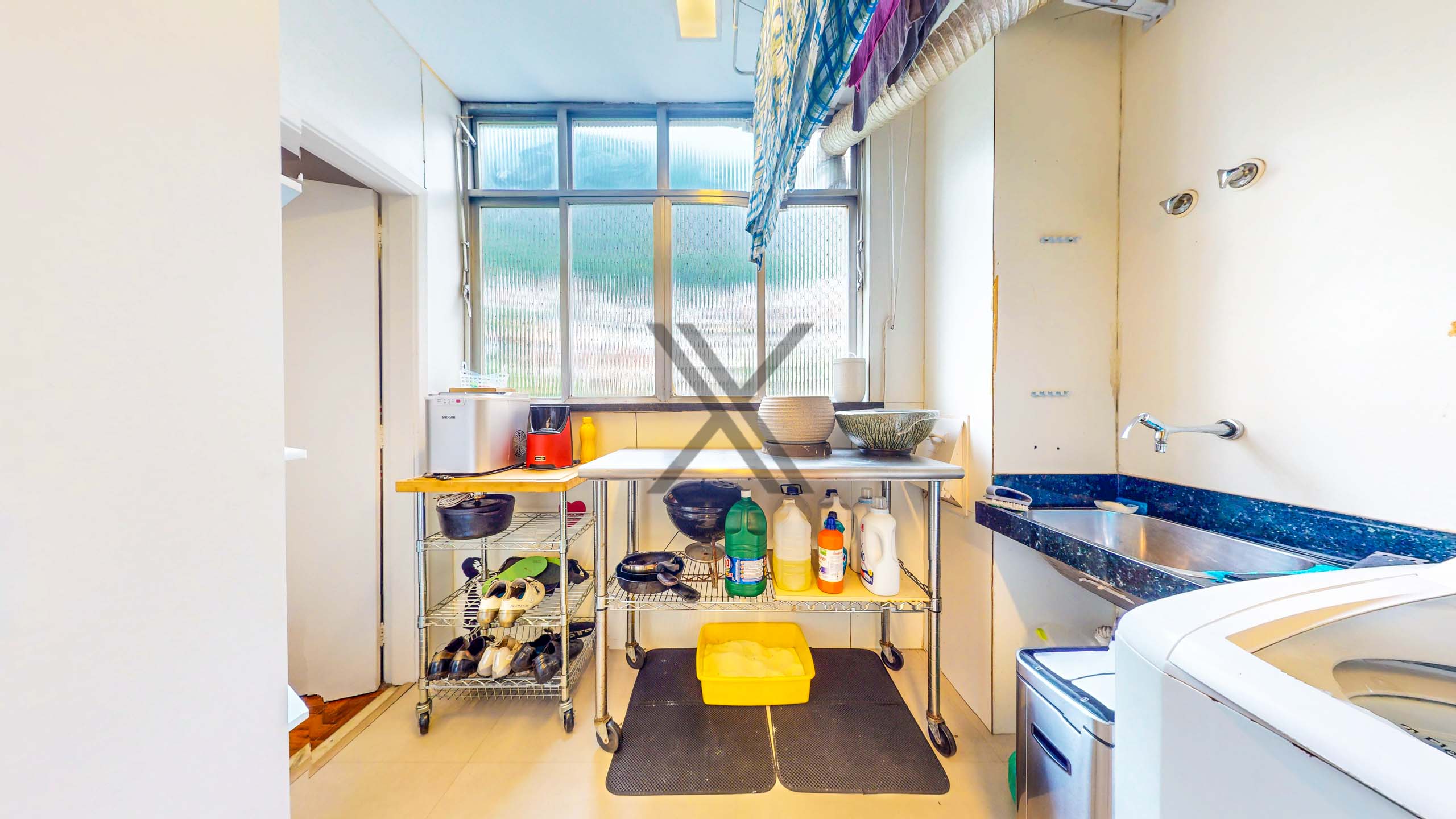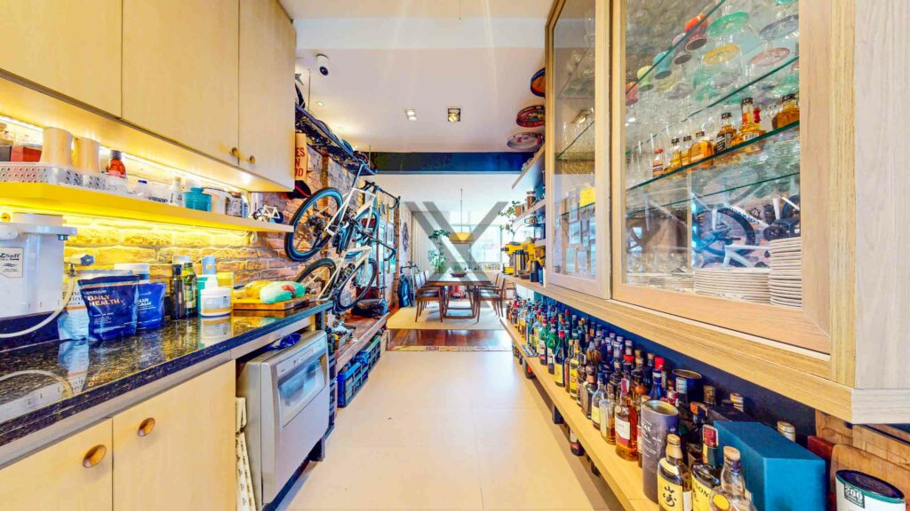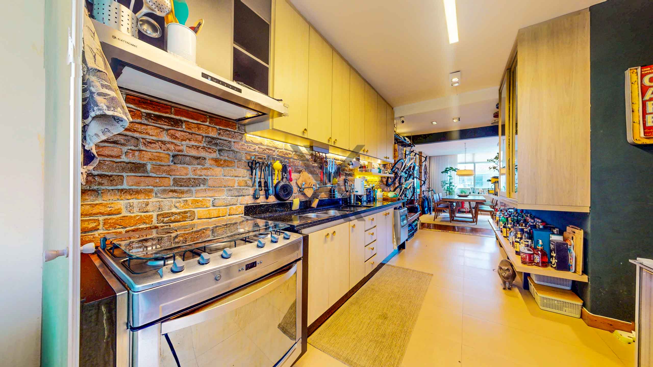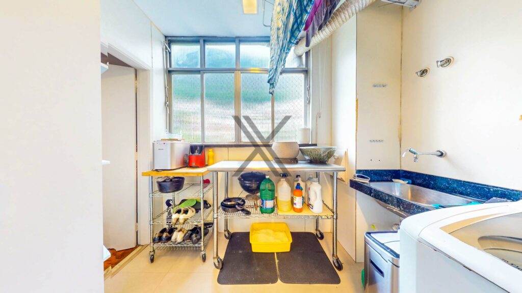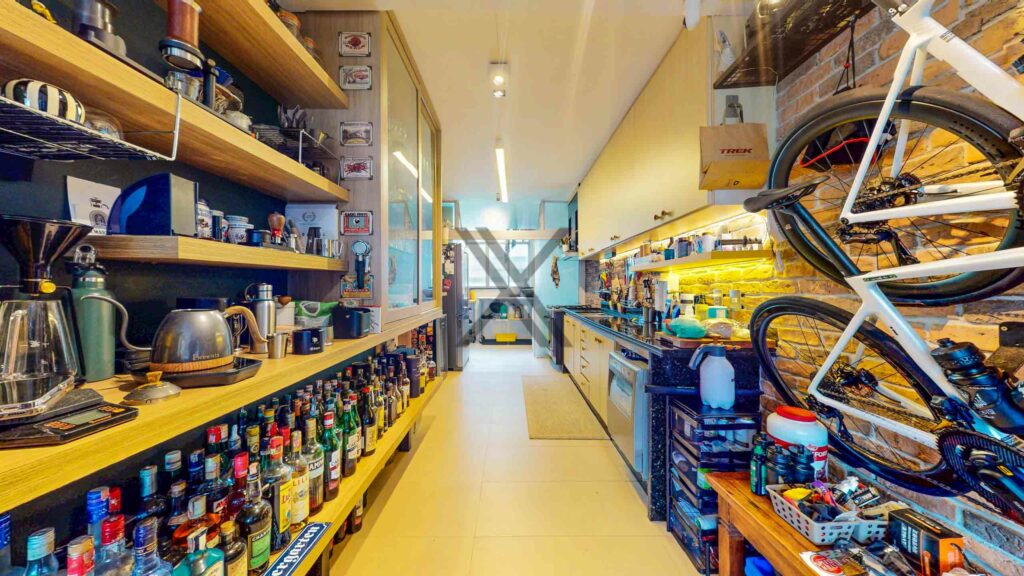 A cozinha, em conceito aberto, está integrada à área social e conta com muitos armários planejados, bancadas para apoio e organização, além de bom espaço de circulação. Ao lado, temos a lavanderia e uma dependência completa para funcionários.