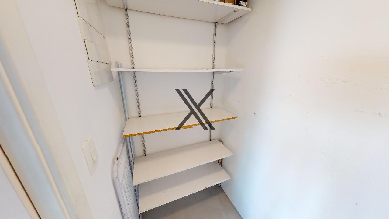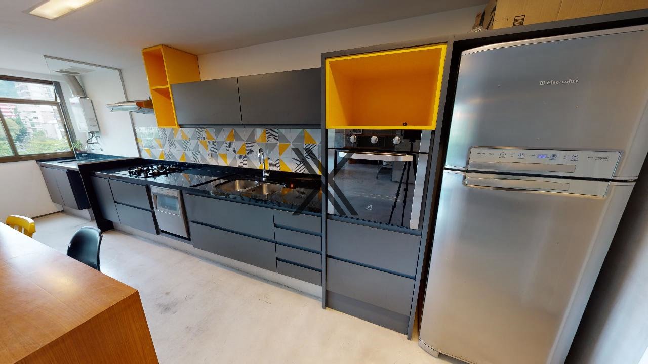 A sala está integrada a uma ampla e funcional cozinha, aberta para a sala e separada por uma bela mesa sob medida em madeira, facilitando aos moradores receber convidados com estilo. Os armários da cozinha foram feitos sob medida, assim como as bancadas em granito preto. O apartamento é equipado com geladeira, coifa, forno e cooktop instalados. A bancada está totalmente refeita e personalizada em granito preto, trazendo seriedade e melhor aproveitamento dos espaços, permitindo uma melhor integração com a área de serviço que também possui o mesmo acabamento em granito. O banheiro de serviço foi transformado em despensa, podendo ser revertido a qualquer momento de acordo com a preferência e necessidades dos moradores.