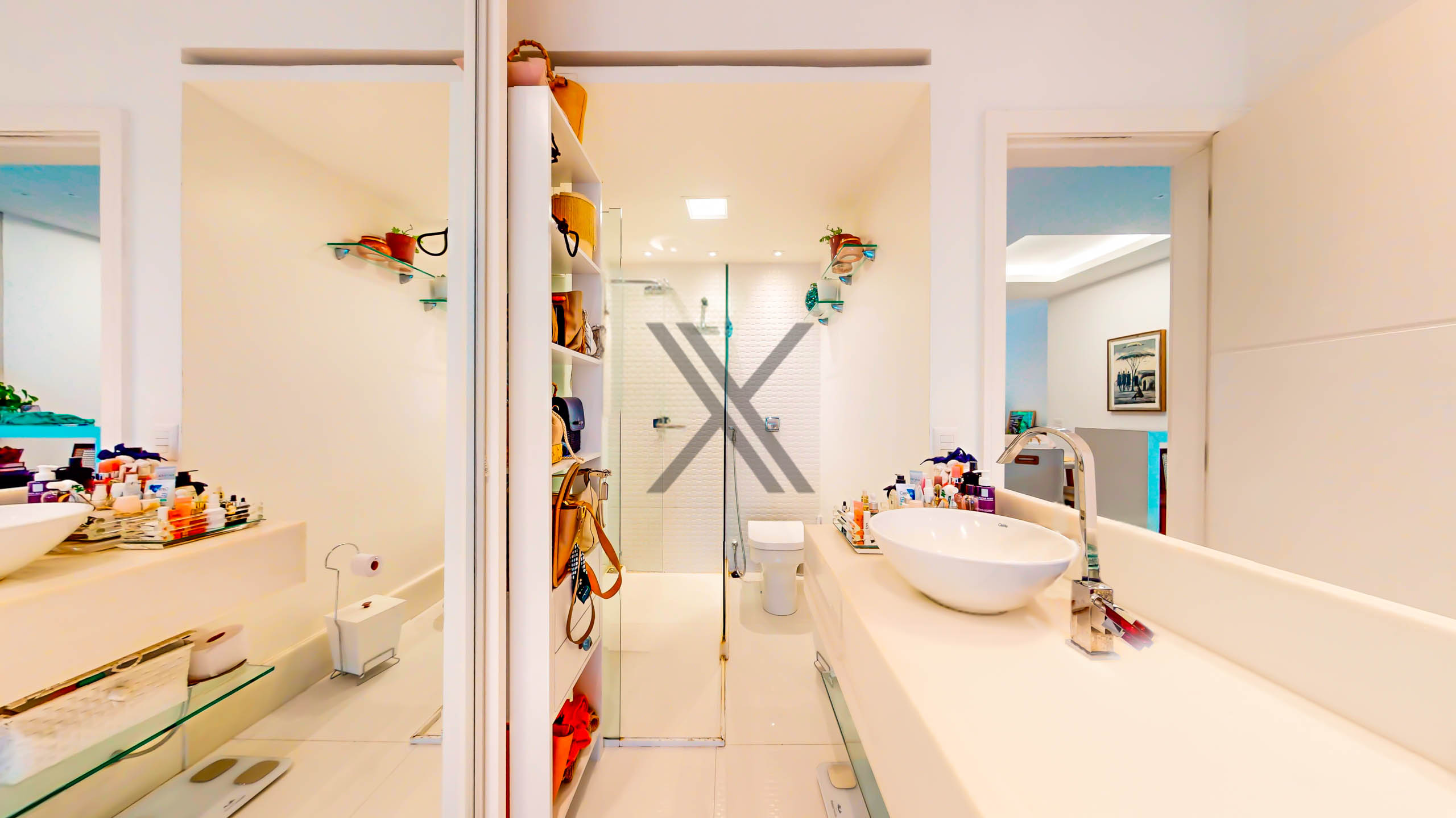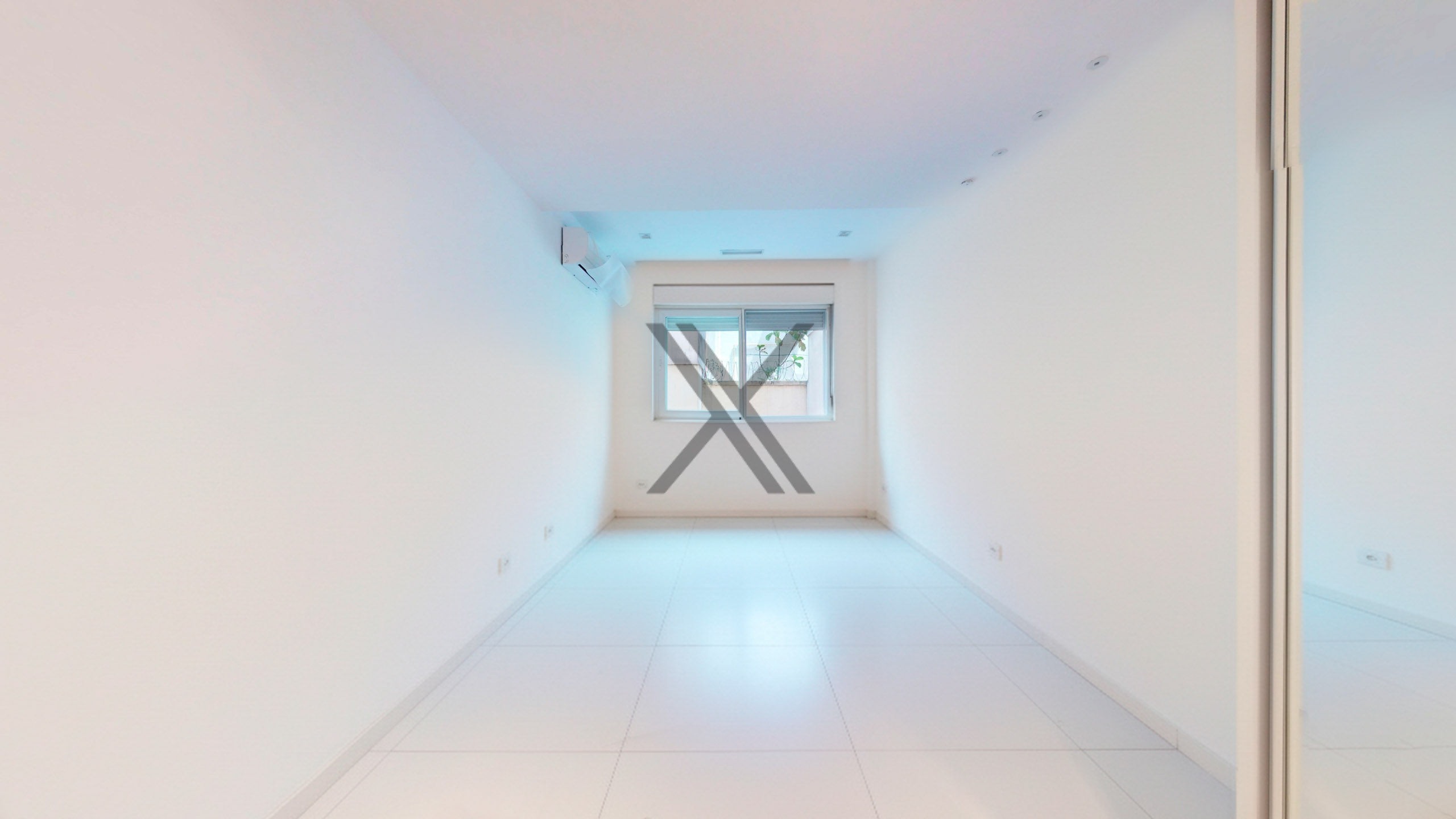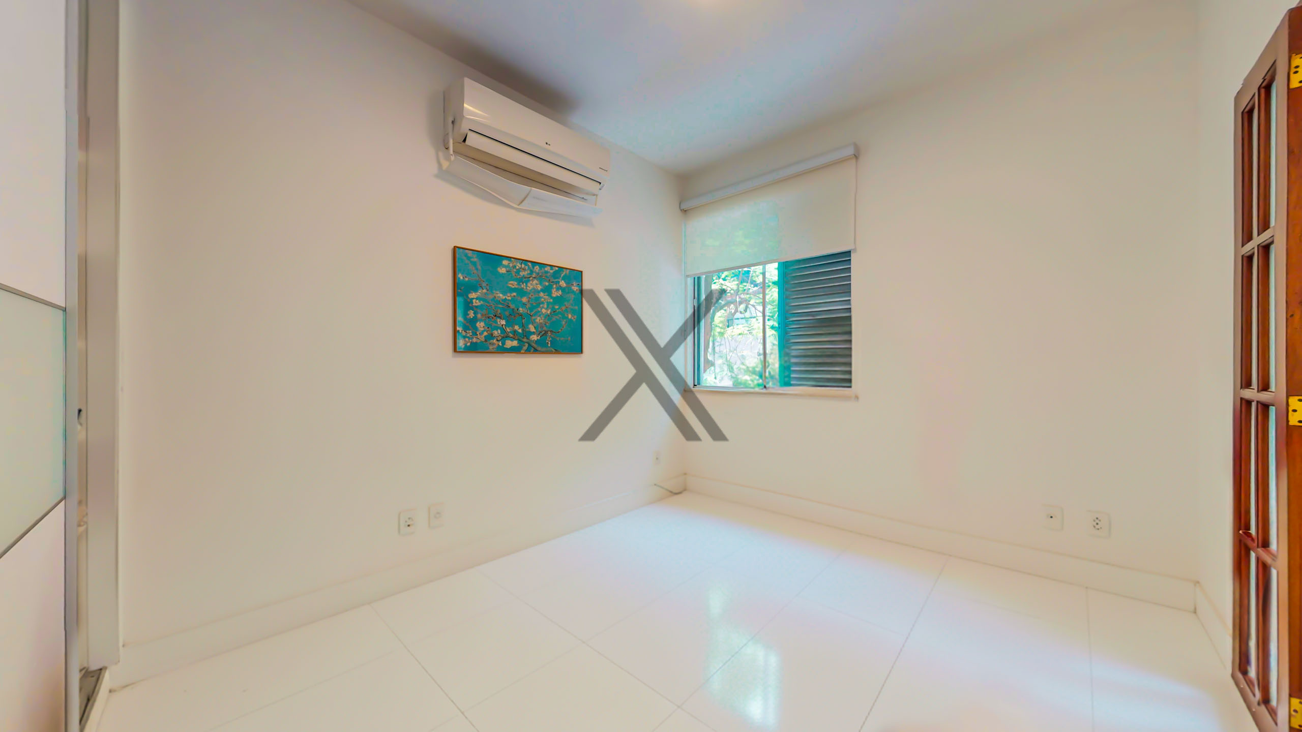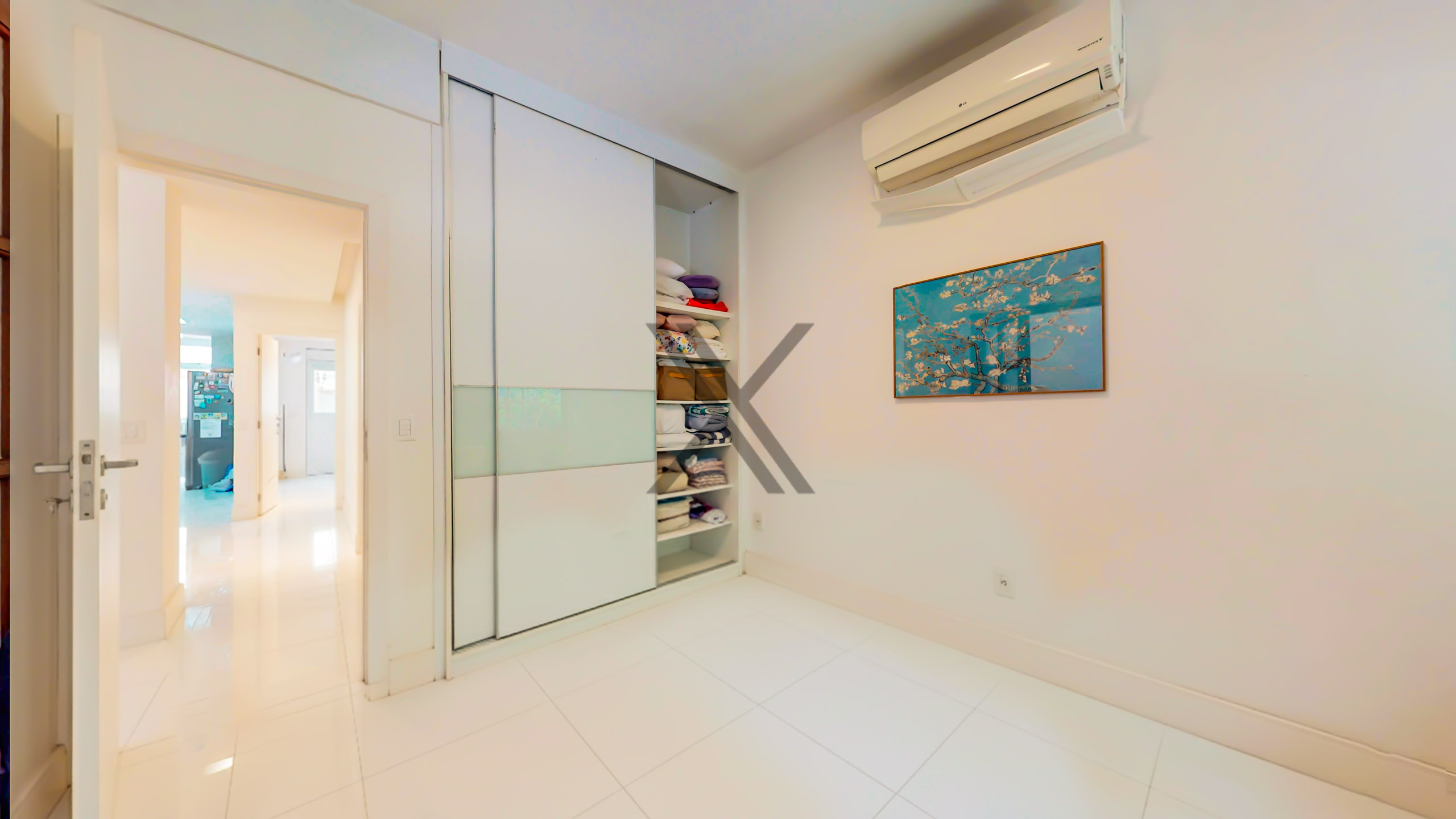 Na área privativa encontramos 2 quartos, sendo 1 suíte, ambos com armários e ar-condicionado split instalados. Um banheiro social serve de apoio ao quarto que não é suíte e à sala.