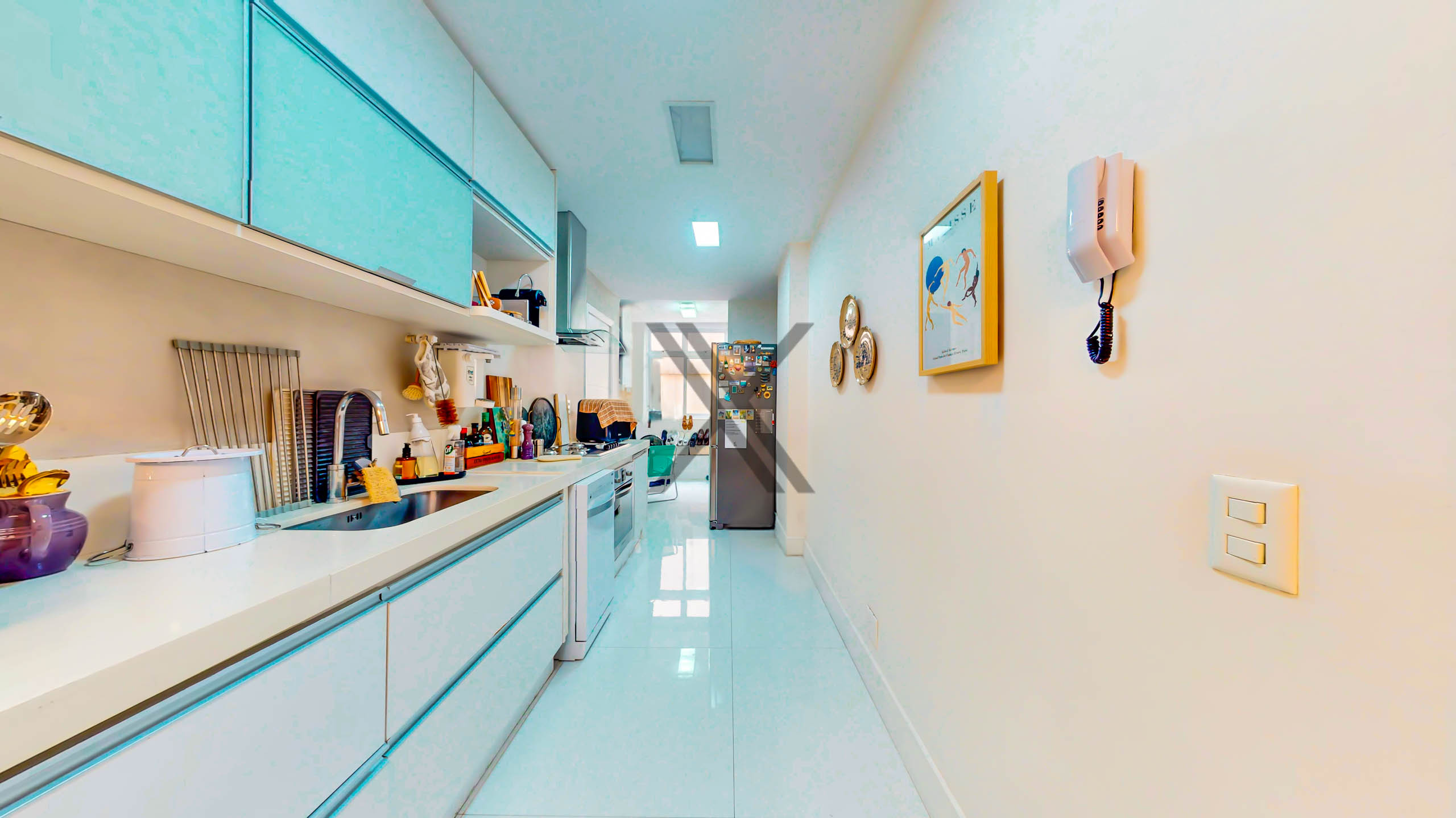 A cozinha está integrada à sala e possui bom tamanho, armários e bancada longa para apoio e organização. Ao lado, temos a área de lavanderia, com bastante espaço de armazenagem, além de espaço para máquina de lavar e tanque.