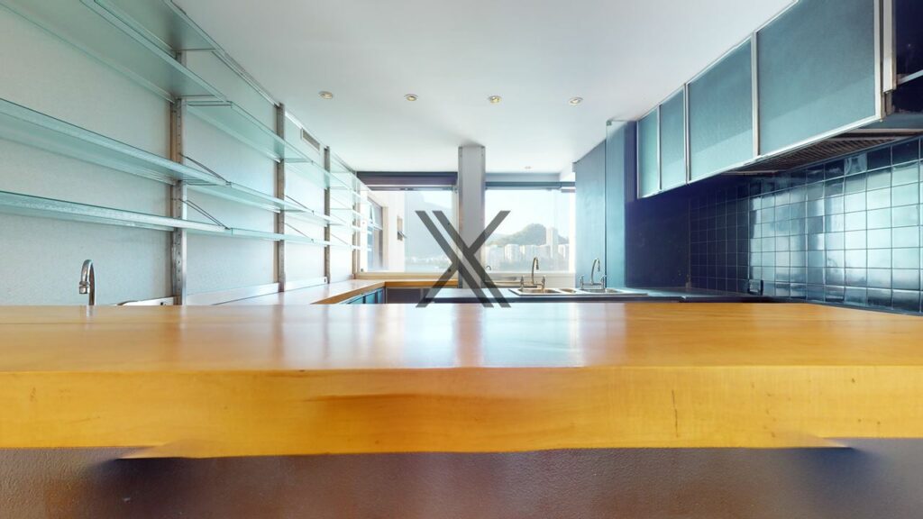 A cozinha está ampliada e aberta para a sala, montada com muitos armários, bancada de apoio, ilha central, iluminação e ventilação natural, além de uma vista incrível e totalmente livre para a Lagoa e o Cristo Redentor.