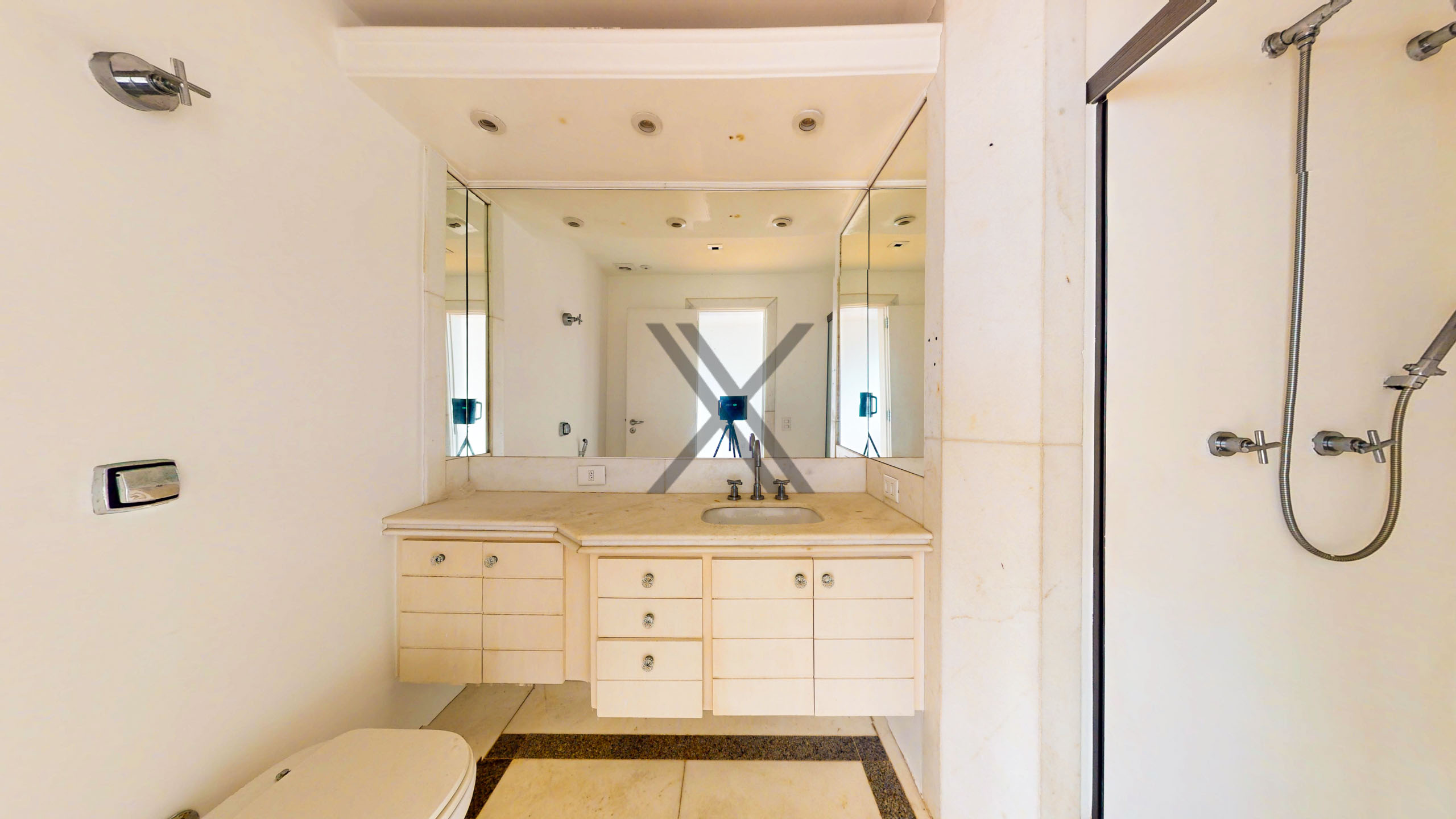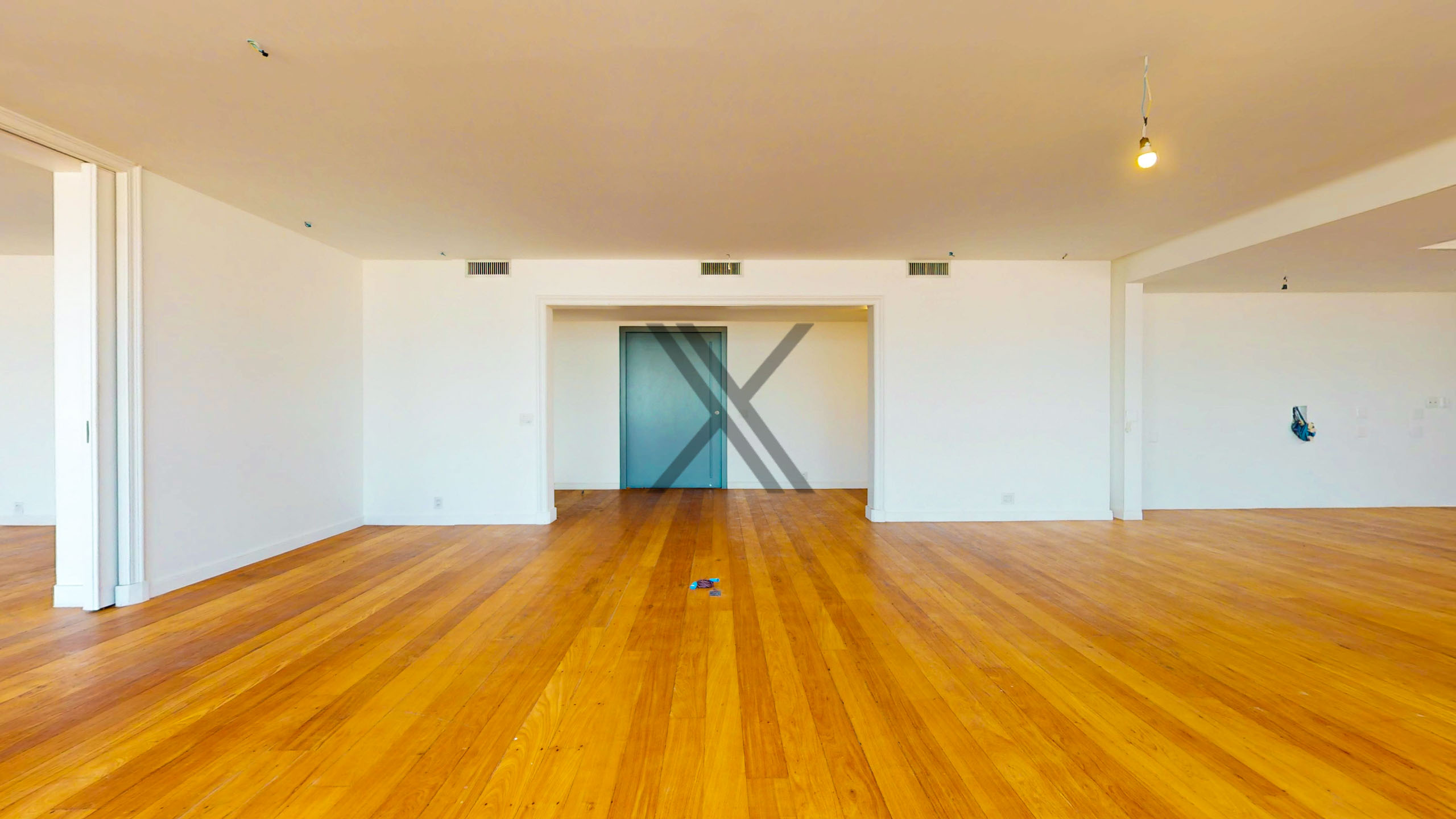 Na parte social, temos um belo hall de entrada ligado a uma sala de mais de 120 m², com piso de madeira, possibilidade de integração para até 4 ambientes, além de uma linda vista para a praia de Ipanema e Ilhas Cagarras. Um lavabo de apoio às visitas complementa o ambiente.