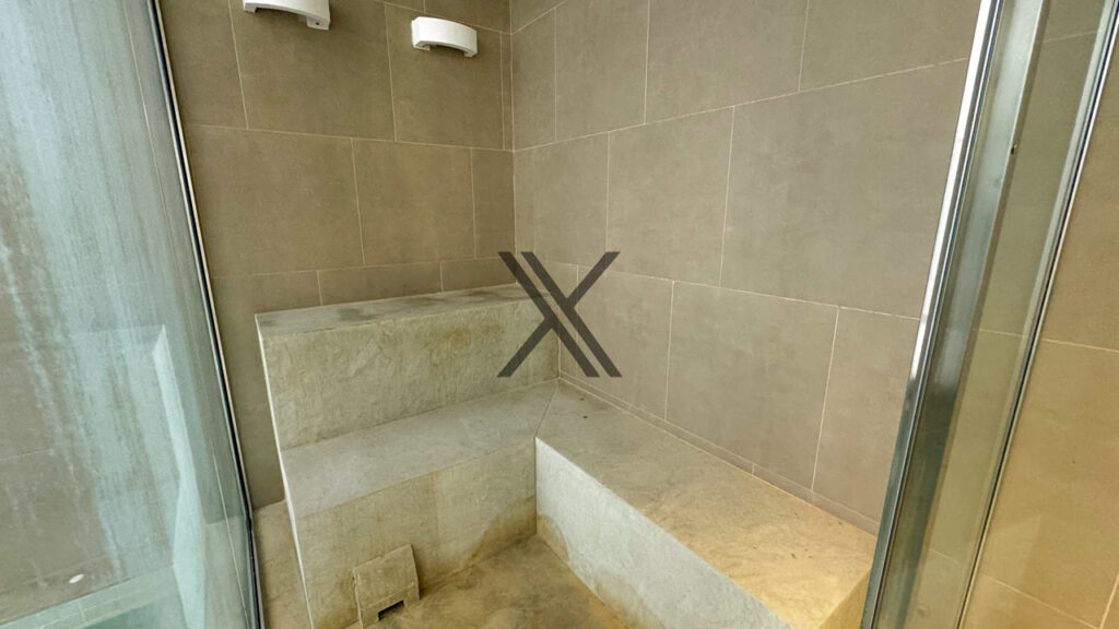 Na parte social, o imóvel possui uma sala de 80 m² para 3 ou 4 ambientes, com um excelente pé-direito, piso de mármore travertino e varanda já nivelada. Ainda na sala, há um lavabo de apoio às visitas.