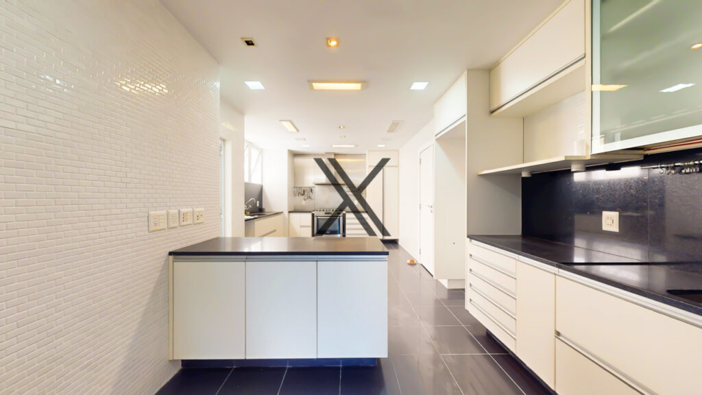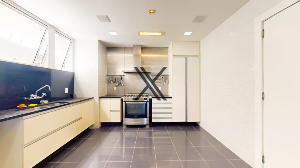 A cozinha está totalmente montada, contando com espaço para copa, grande quantidade de armários, coifa, bancadas amplas, despensa, refrigeração e ótimo espaço de circulação. Em anexo, estão a área de serviço, 2 quartos e banheiro para funcionários.