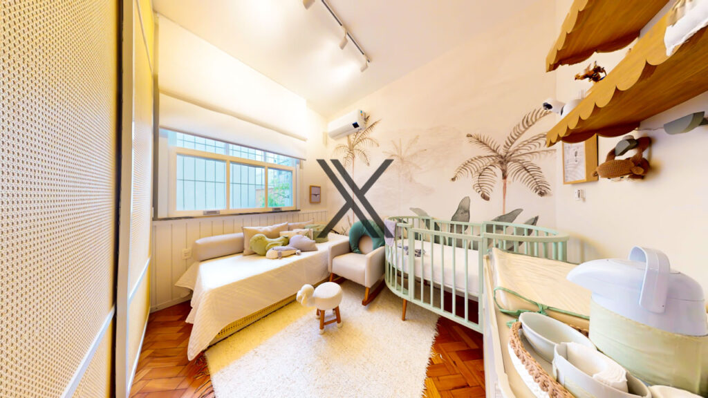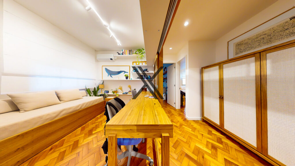 Na área privativa, originalmente, o apartamento tinha 3 quartos e hoje possui 2, o antigo terceiro quarto pode ser usado como um escritório integrado à sala ou como um dormitório, sendo fechado através de portas venezianas que trazem essa possibilidade com muita comodidade.