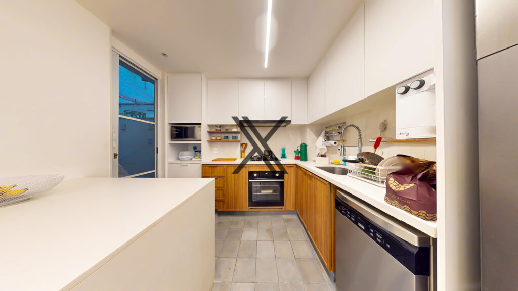 A cozinha é belíssima, está aberta e integrada à sala, contando com mesa para refeições, cooktop, coifa, forno, filtro, bancada ampla e muito armários. Em anexo, está a área de serviço.