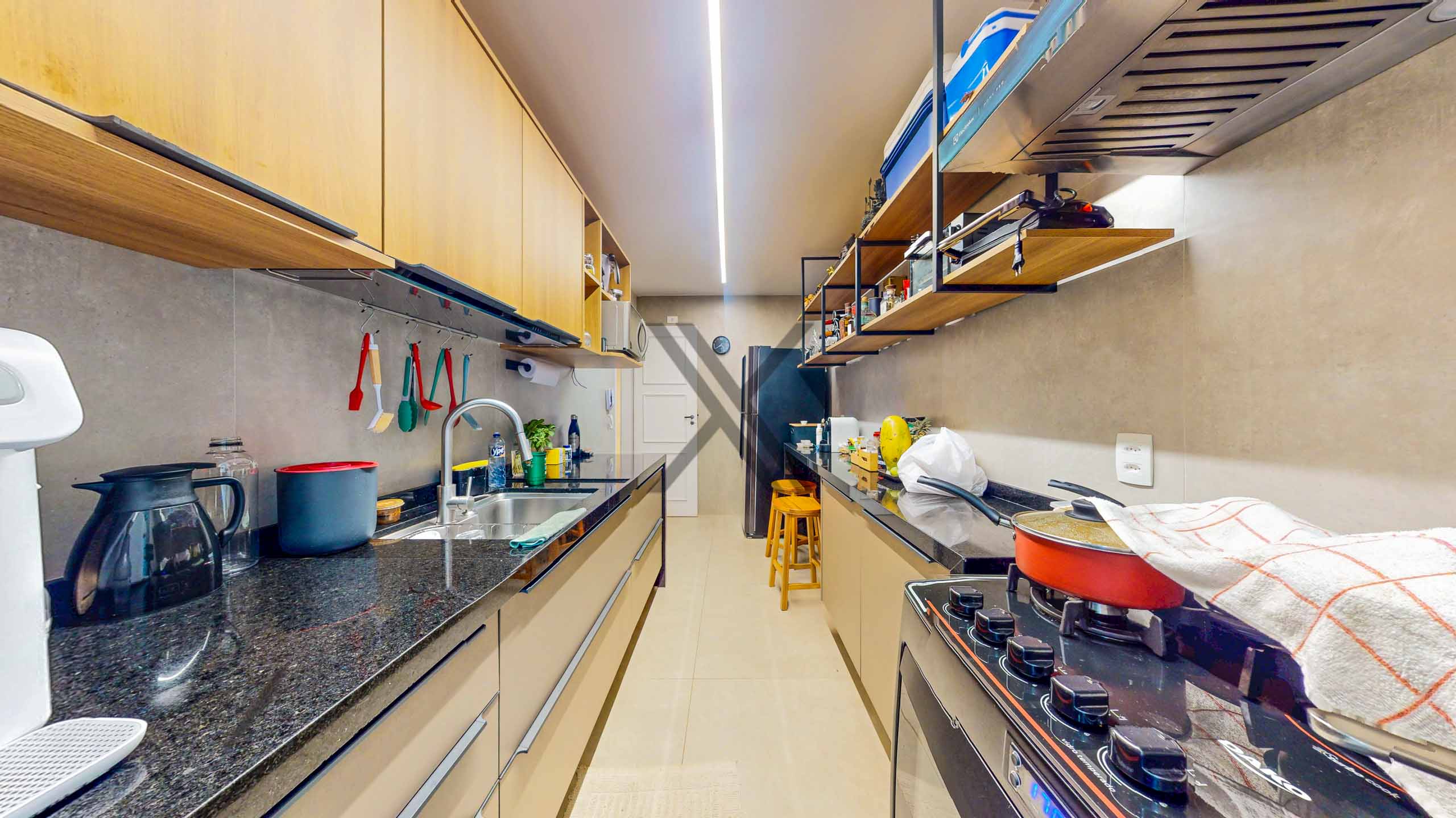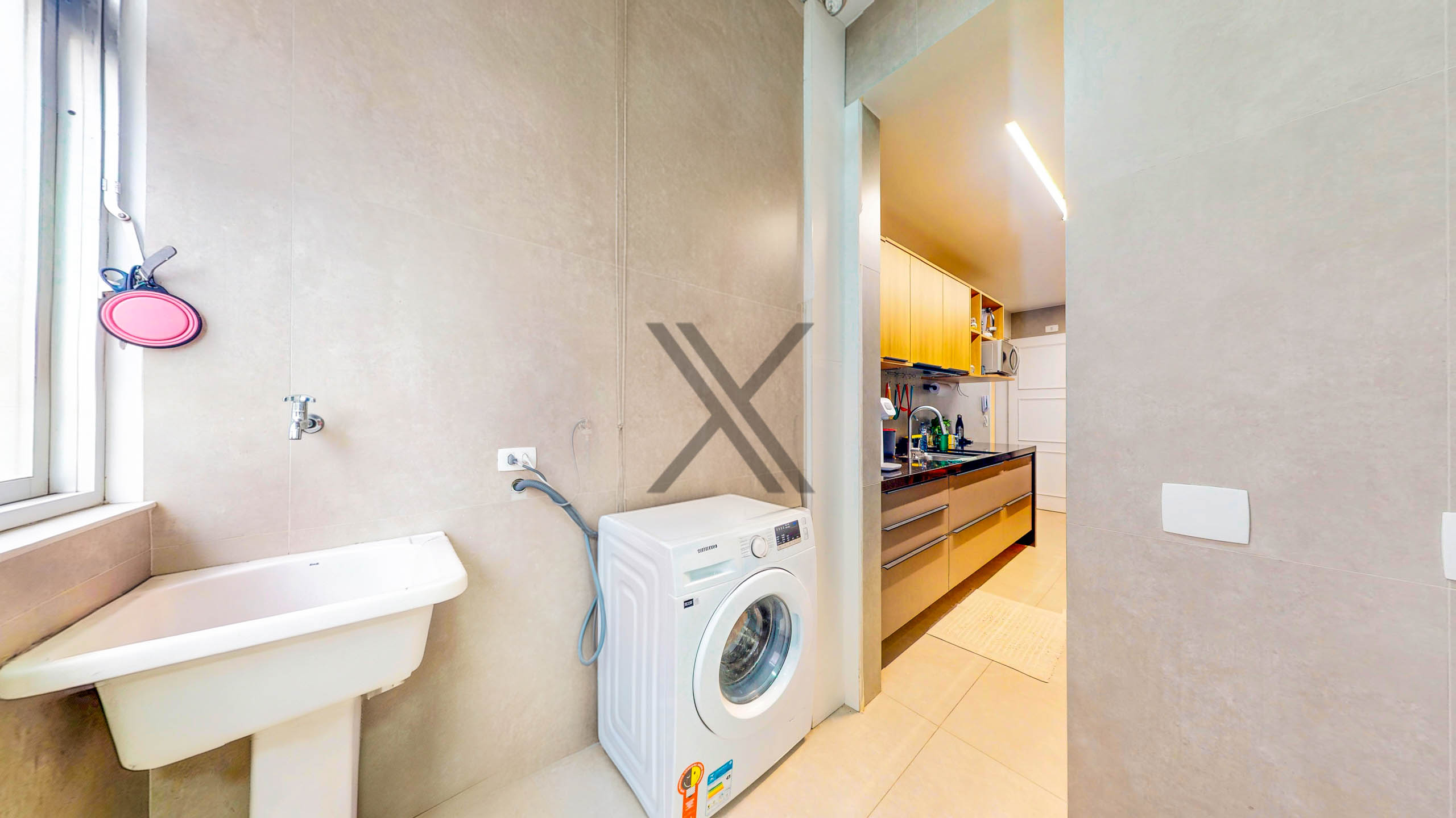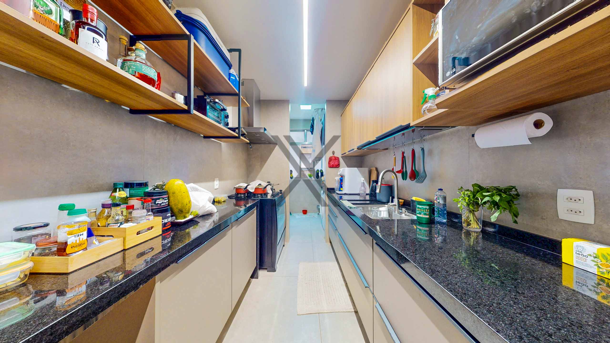 A cozinha, possui um bom tamanho, é bem iluminada, repleta de armários e bancadas para apoio e organização. Em anexo, estão a área de serviço e uma dependência completa para funcionário.