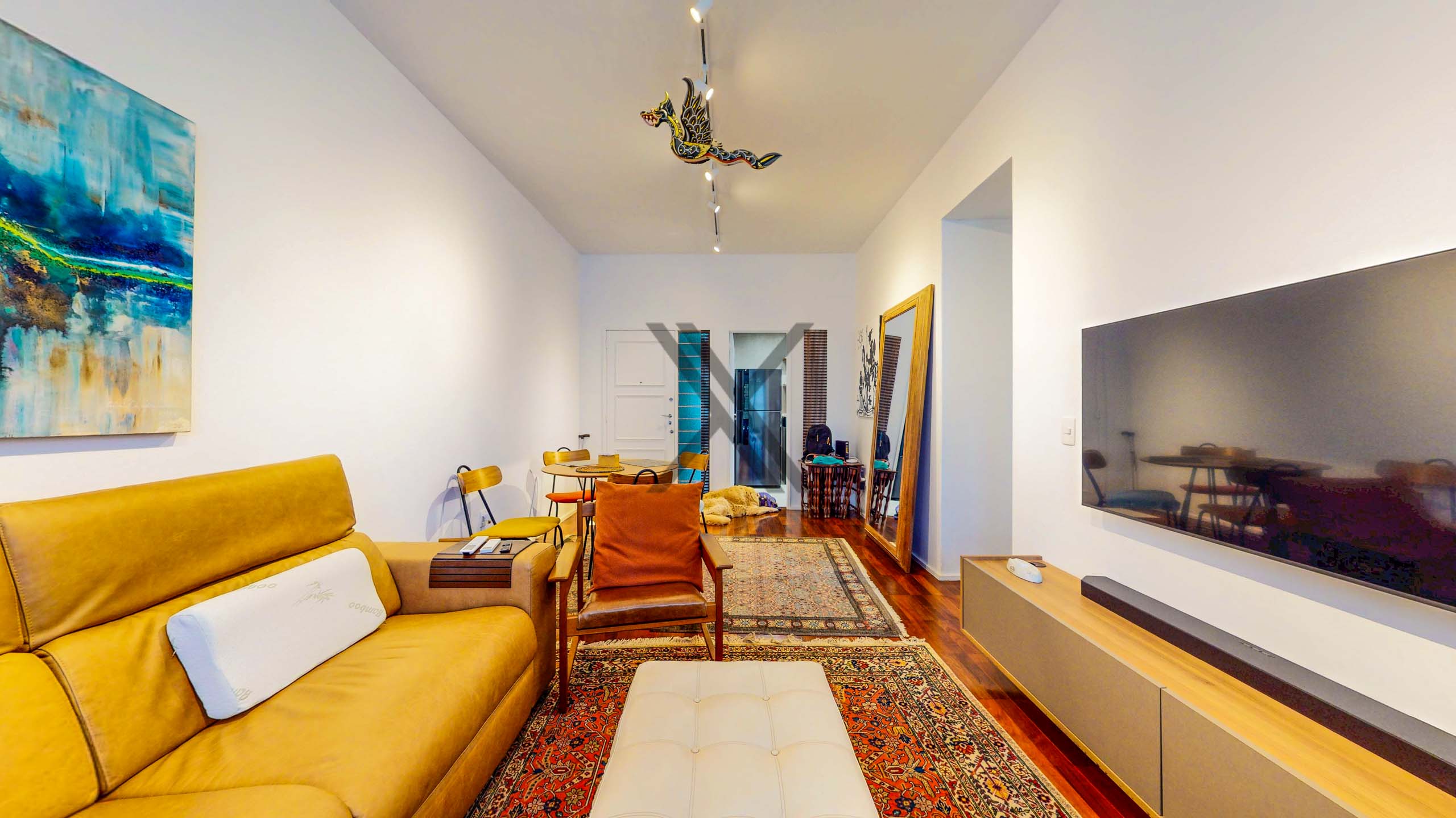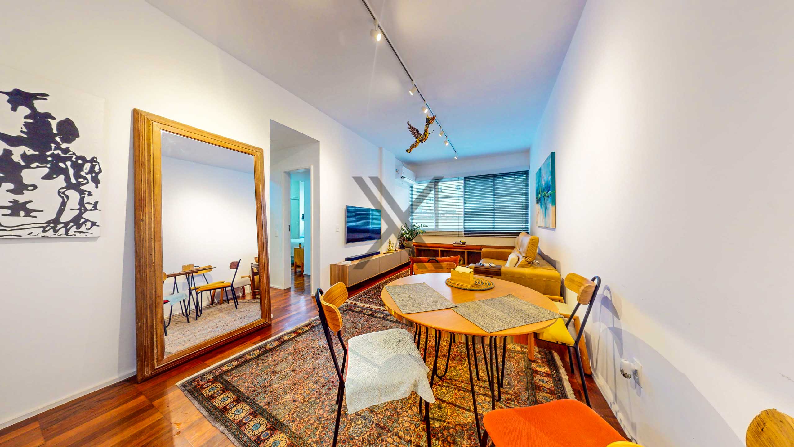 A área social apresenta sala de estar dividida em 2 belos ambientes, com piso de madeira em tábua corrida, projeto luminotécnico, ar condicionado split e amplas janelas que trazem bastante luz e ventilação naturais.