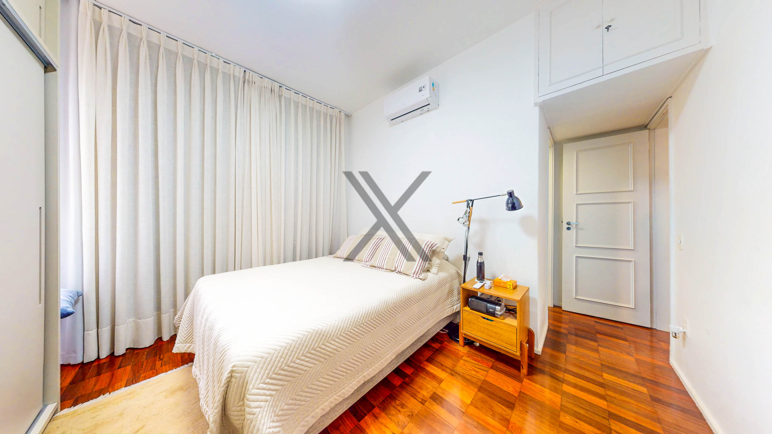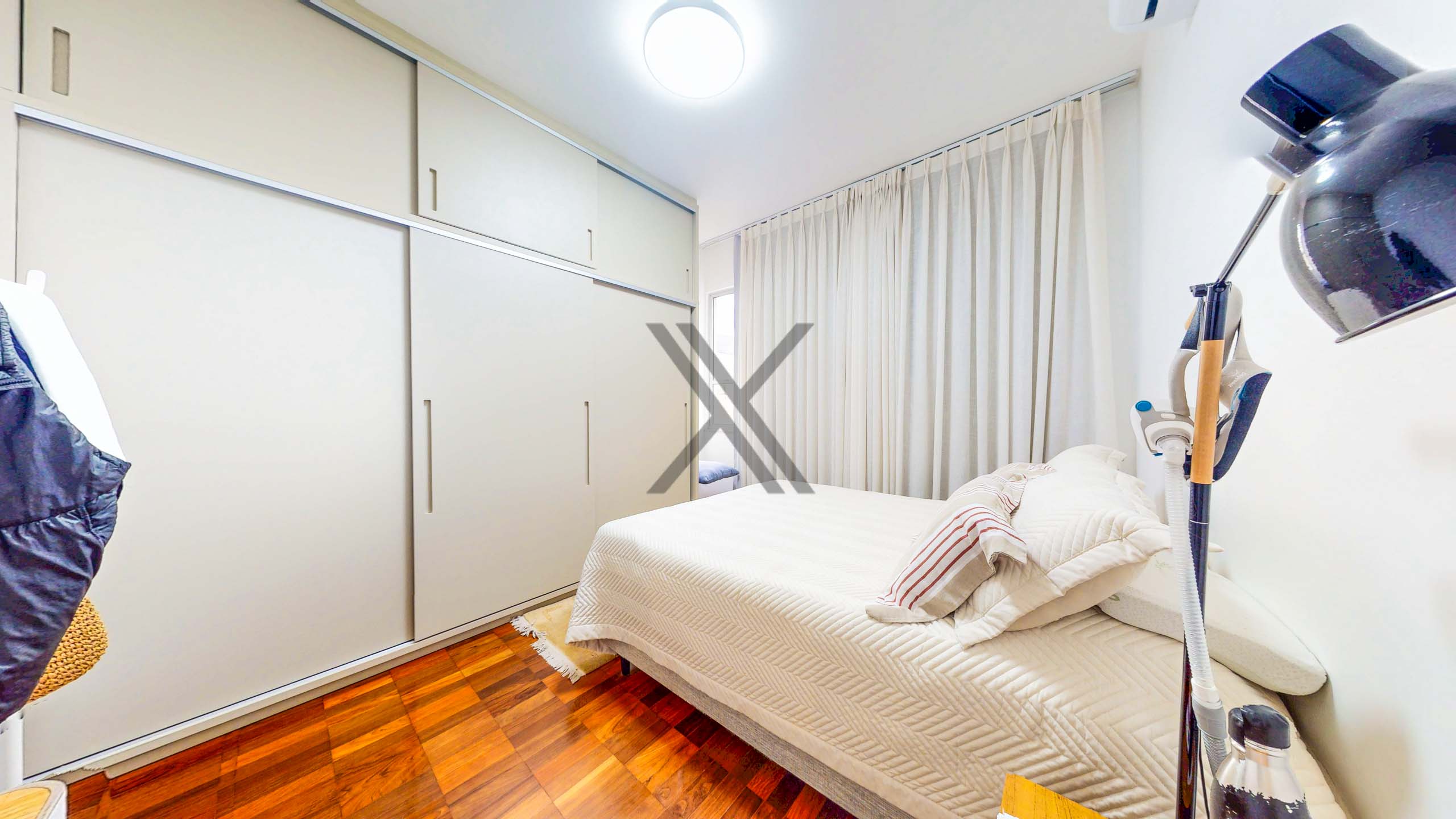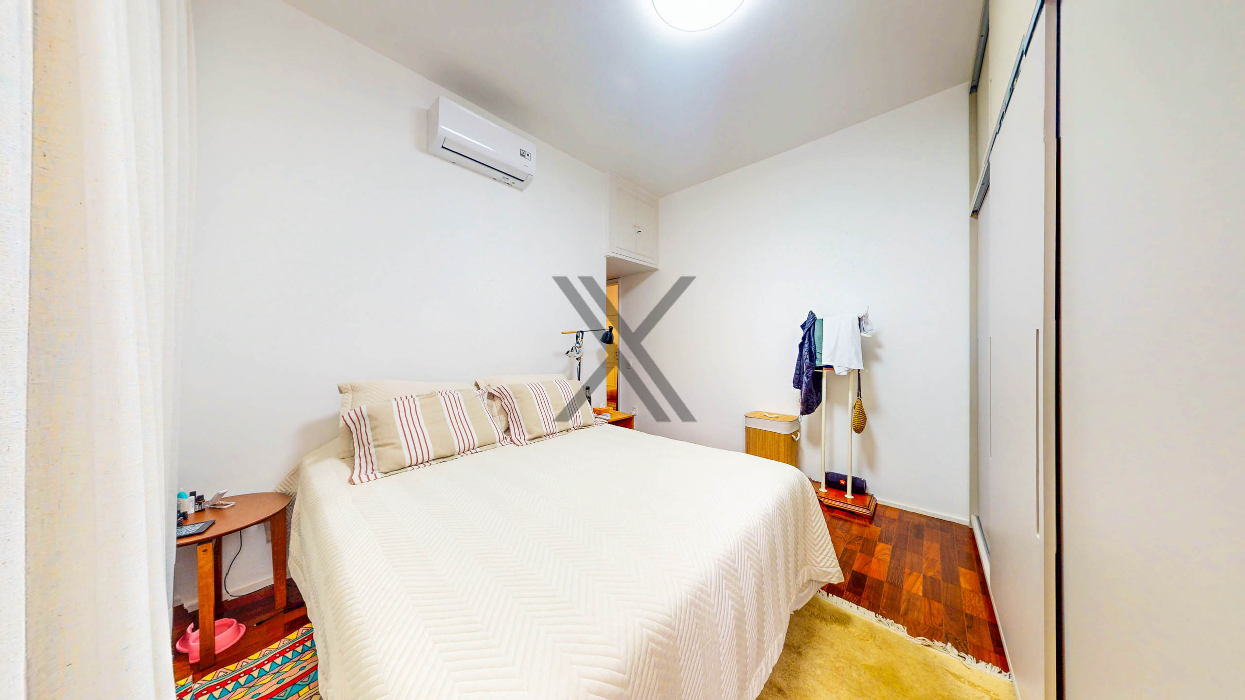 Na área privativa, são 2 quartos, sendo 1 suíte, todos de excelente tamanho, projeto de marcenaria e ar condicionado instalados. Há também um banheiro social que atende tanto o quarto que não é suíte quanto à sala.