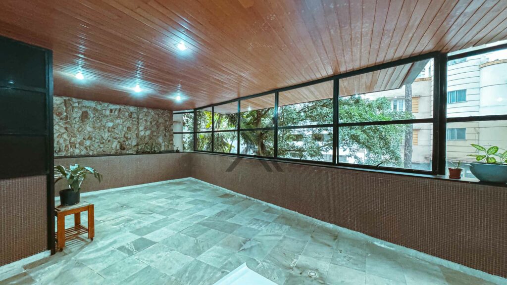 A área social possui uma sala em dois ambientes, sendo sala de estar/TV e jantar para 8 lugares, com iluminação trabalhada e split instalado. A varanda tem excelente tamanho, com espaço para a criação de um pequeno refúgio com sofás e pufes, além de uma vista agradável a copa das árvores e lateral para a Lagoa Rodrigo de Freitas.