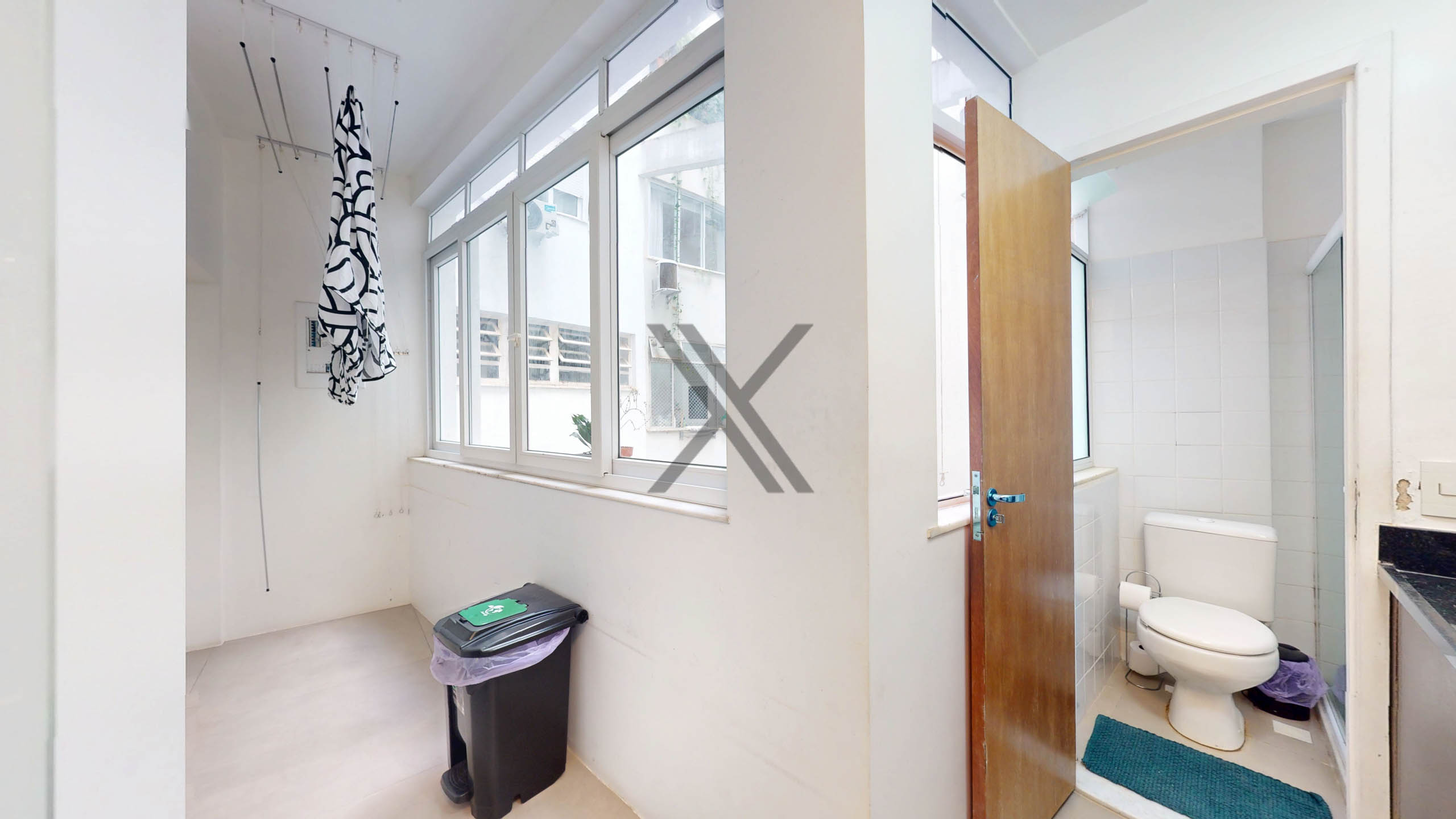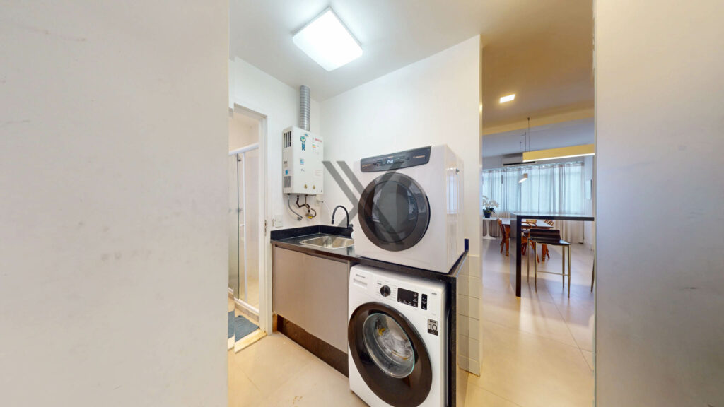 A área de lavanderia está separada e conta com duas máquinas front load de lavar e secar, bom espaço de circulação, além de um banheiro de serviço todo reformado.
