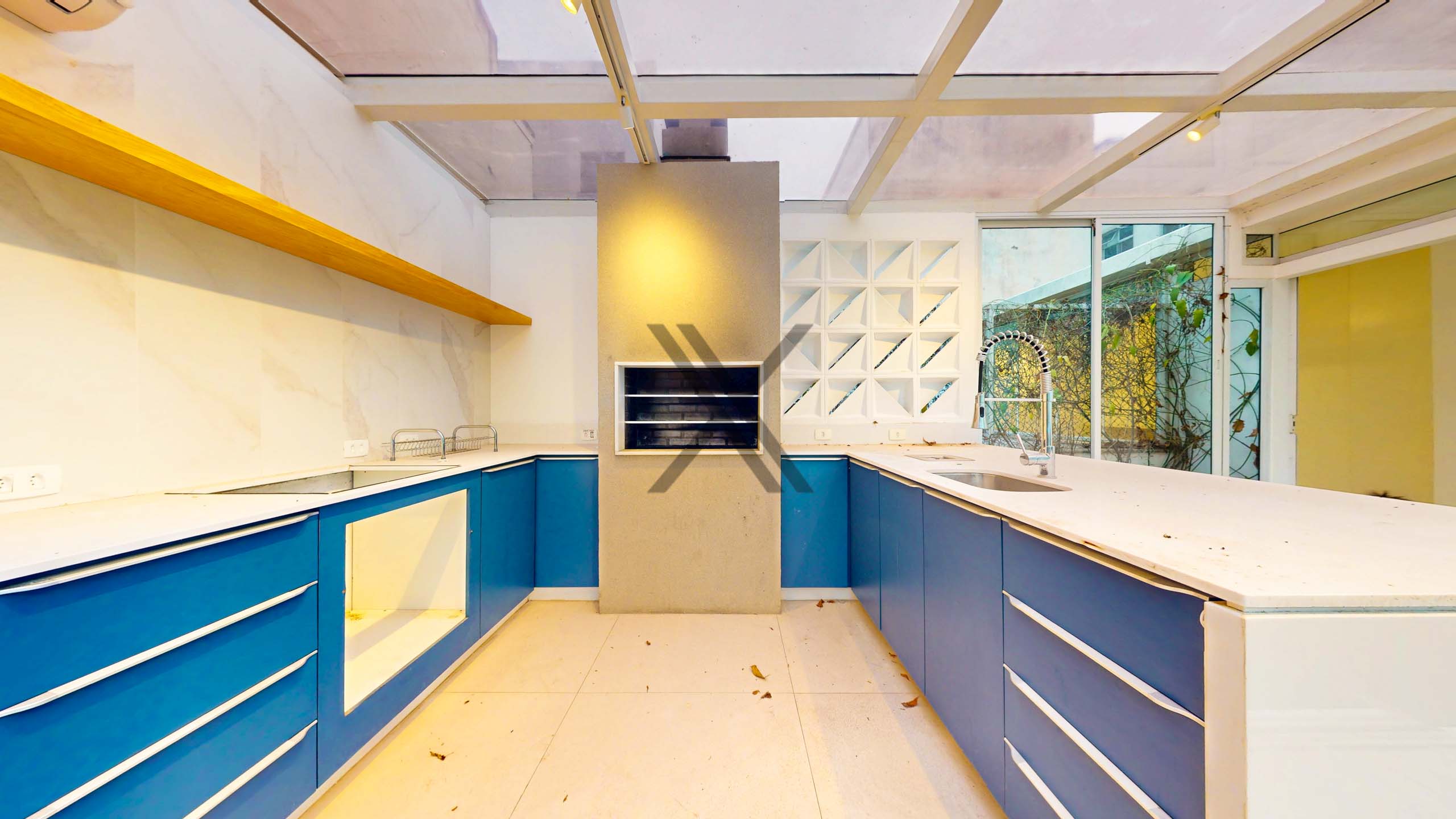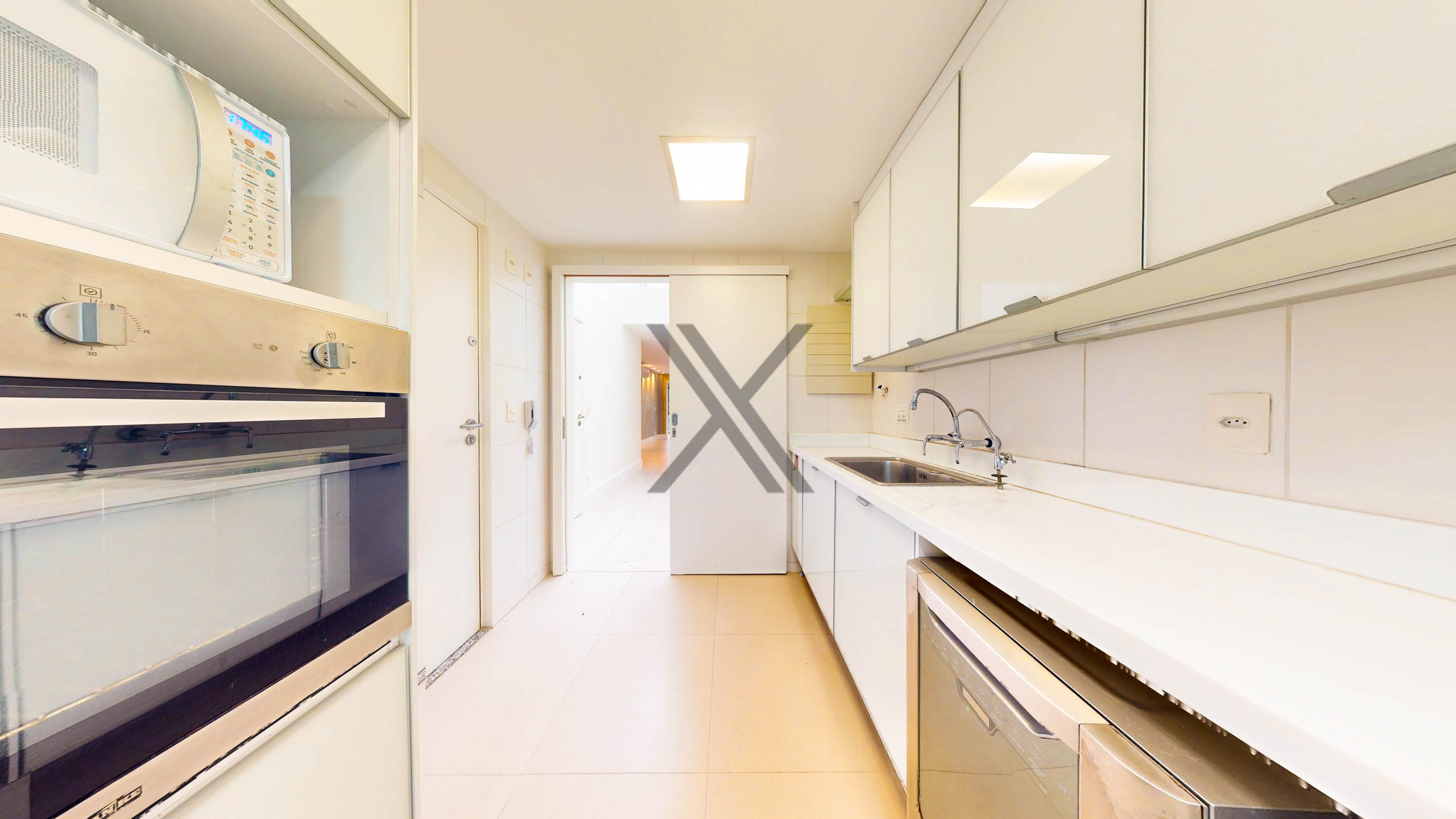 A cozinha tem um bom tamanho, bastante espaço de armazenagem e bancadas para apoio e organização. Em anexo, está a área de serviço completa com uma dependência completa para funcionários.