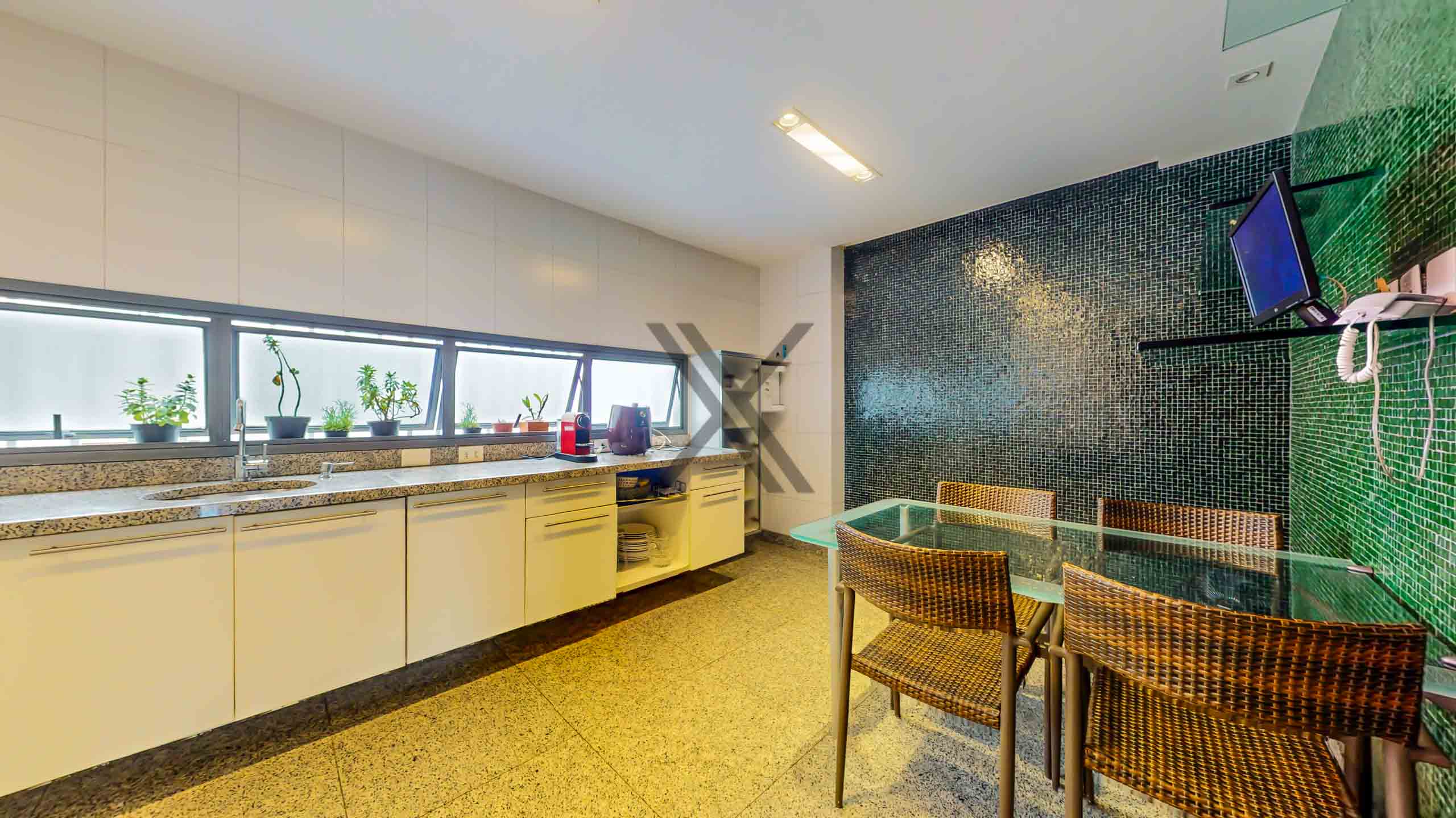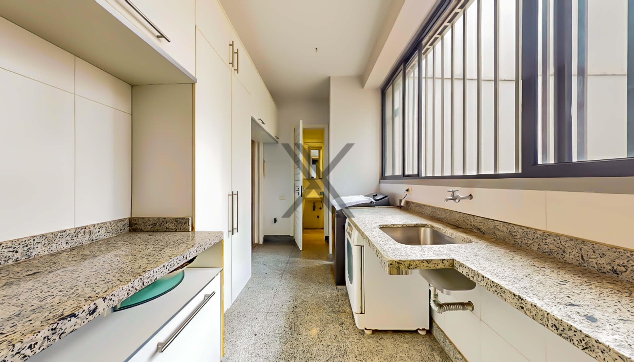 A cozinha tem um ótimo tamanho e conta com copa para praticidade do dia a dia dos moradores, grande quantidade de armários e longas bancadas para apoio e organização, os quais garantem bastante espaço de armazenagem. A área de serviço está separada da cozinha e apresenta armários, além de dependência completa para funcionários.
