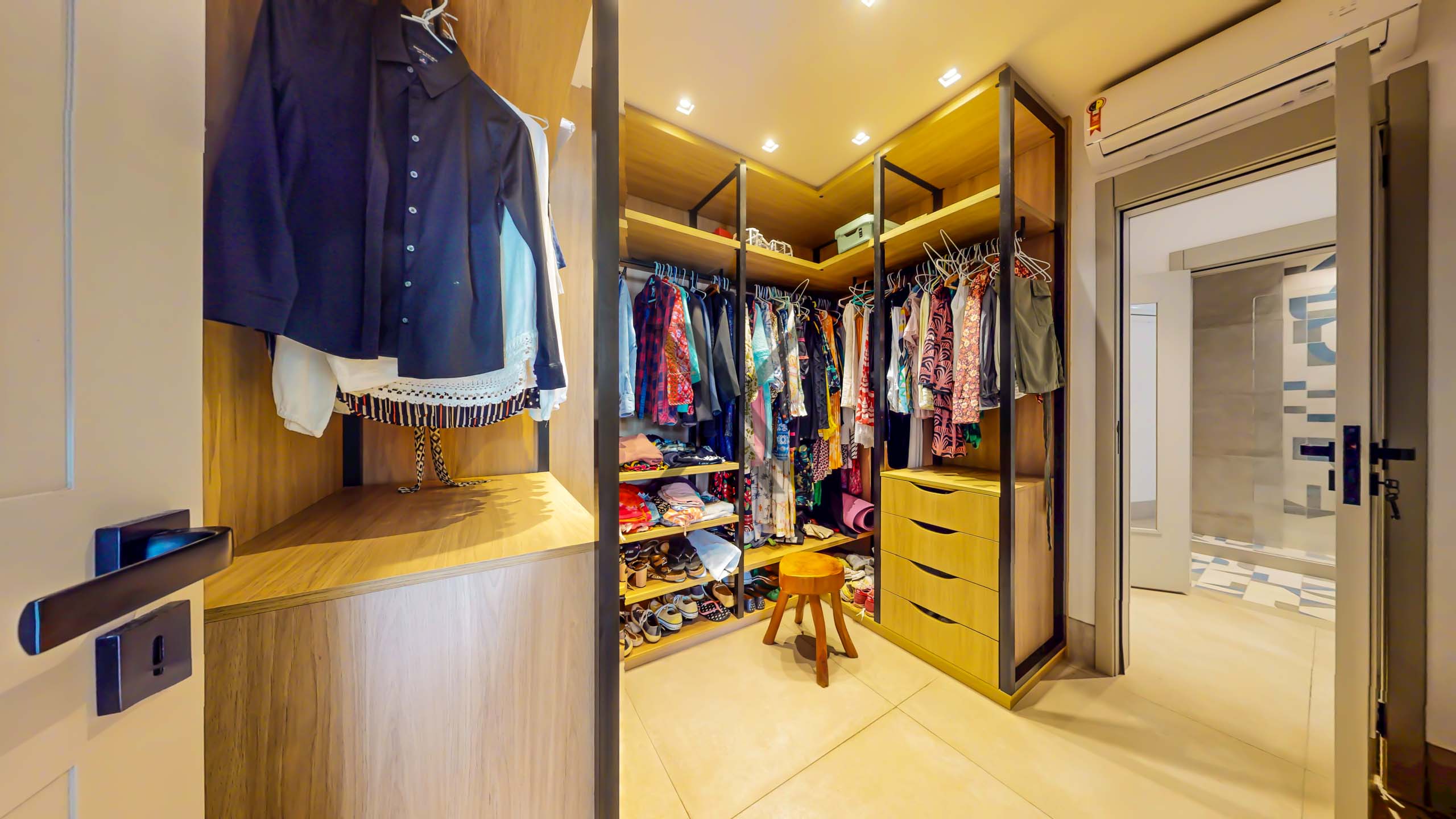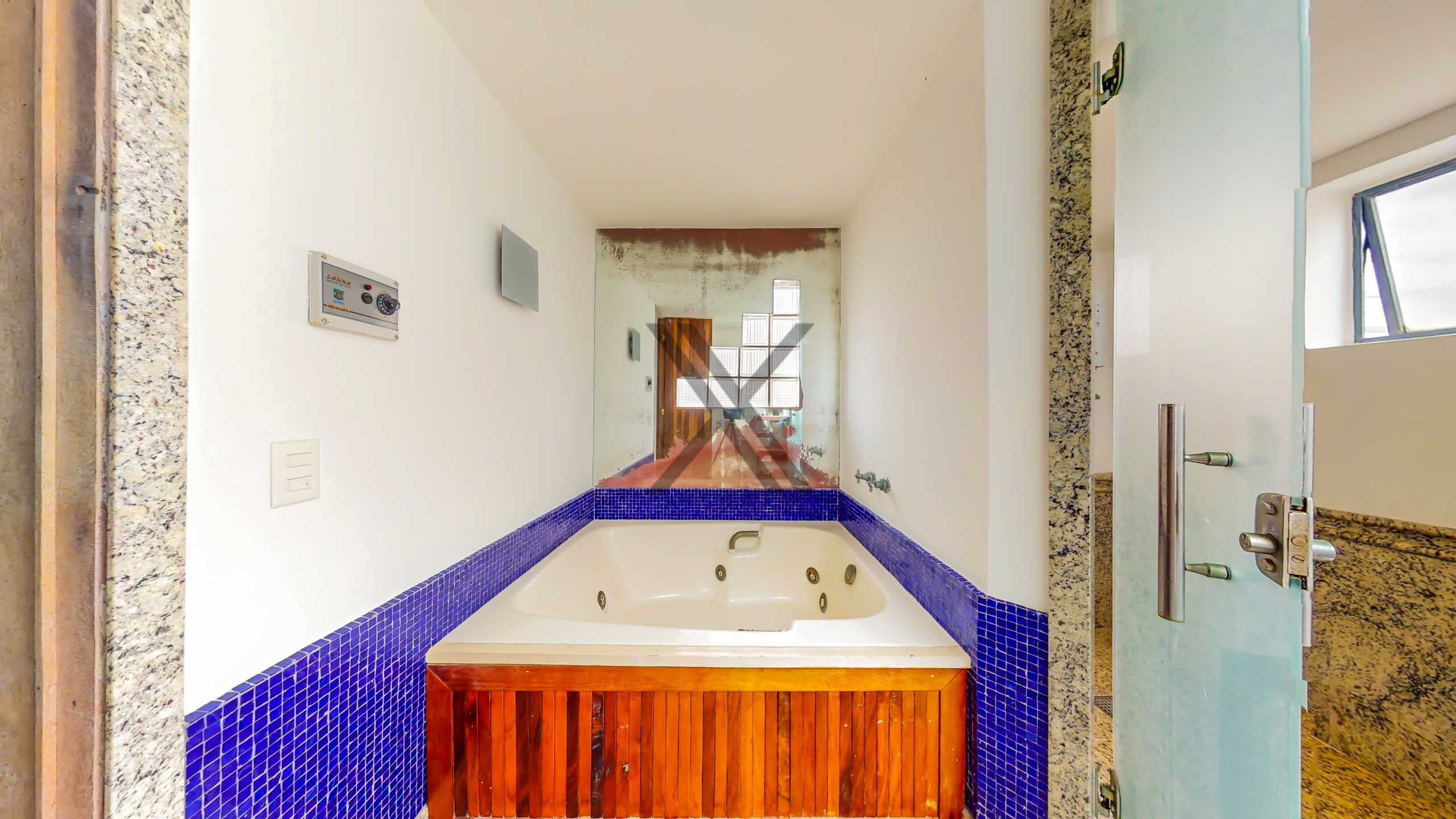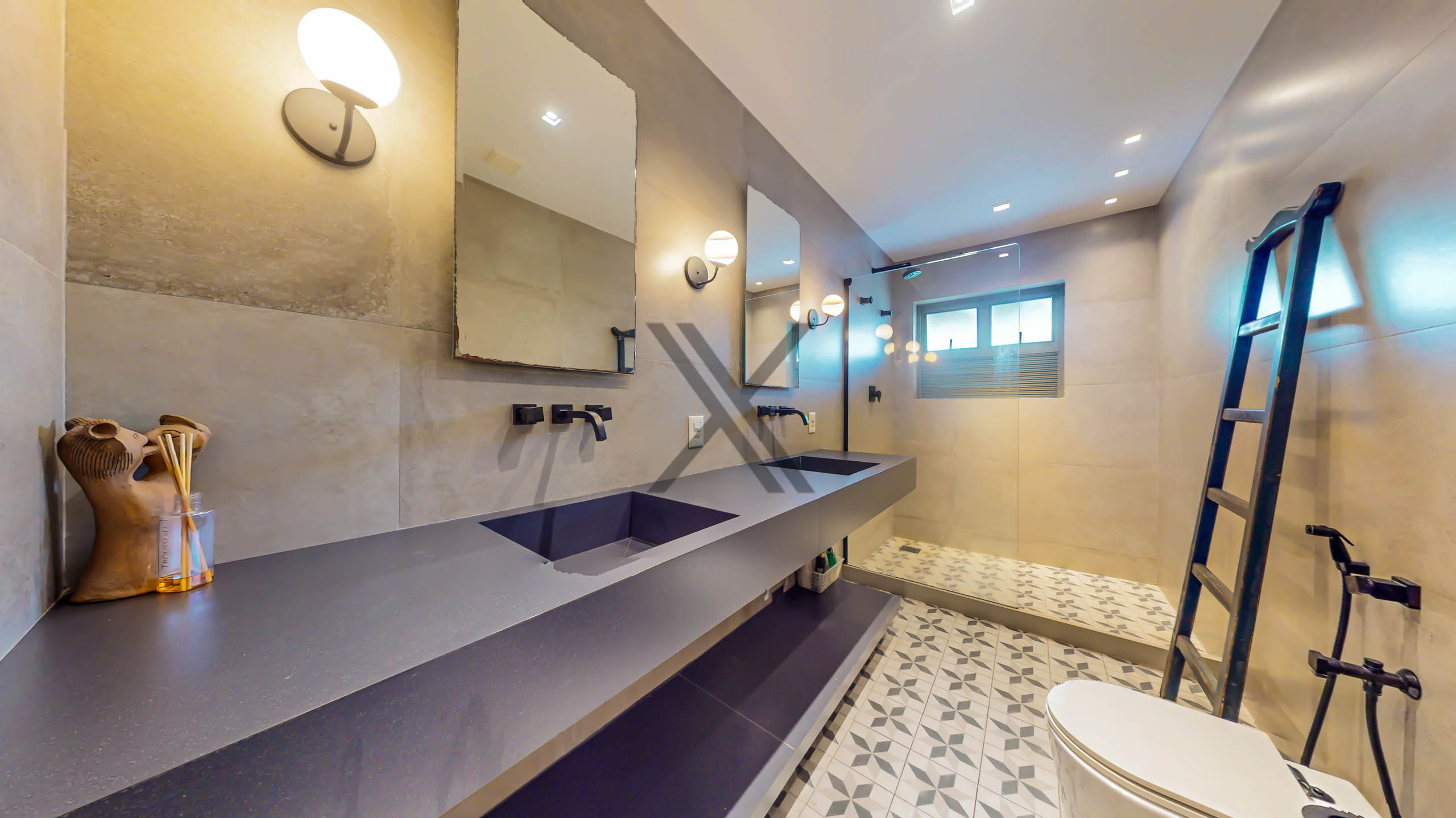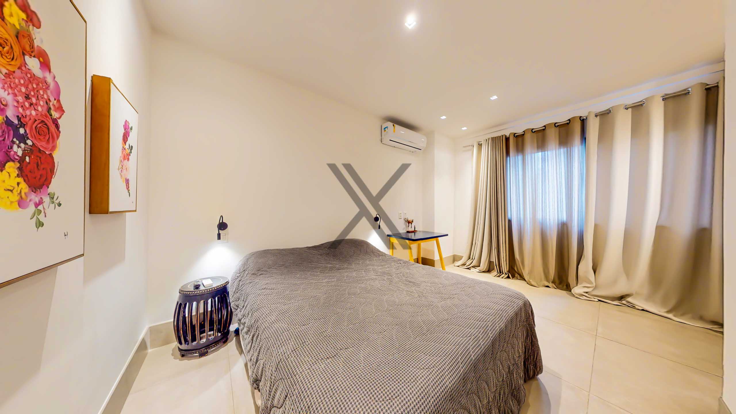Ao descermos as escadas, nos deparamos com a área privativa, que se encontra no primeiro pavimento. Ela está totalmente reformada e apresenta 4 suítes de ótimos tamanhos, todas com ar-condicionado split instalados, sendo 2 delas com acesso à varanda privativa e excelente walk-in closet.