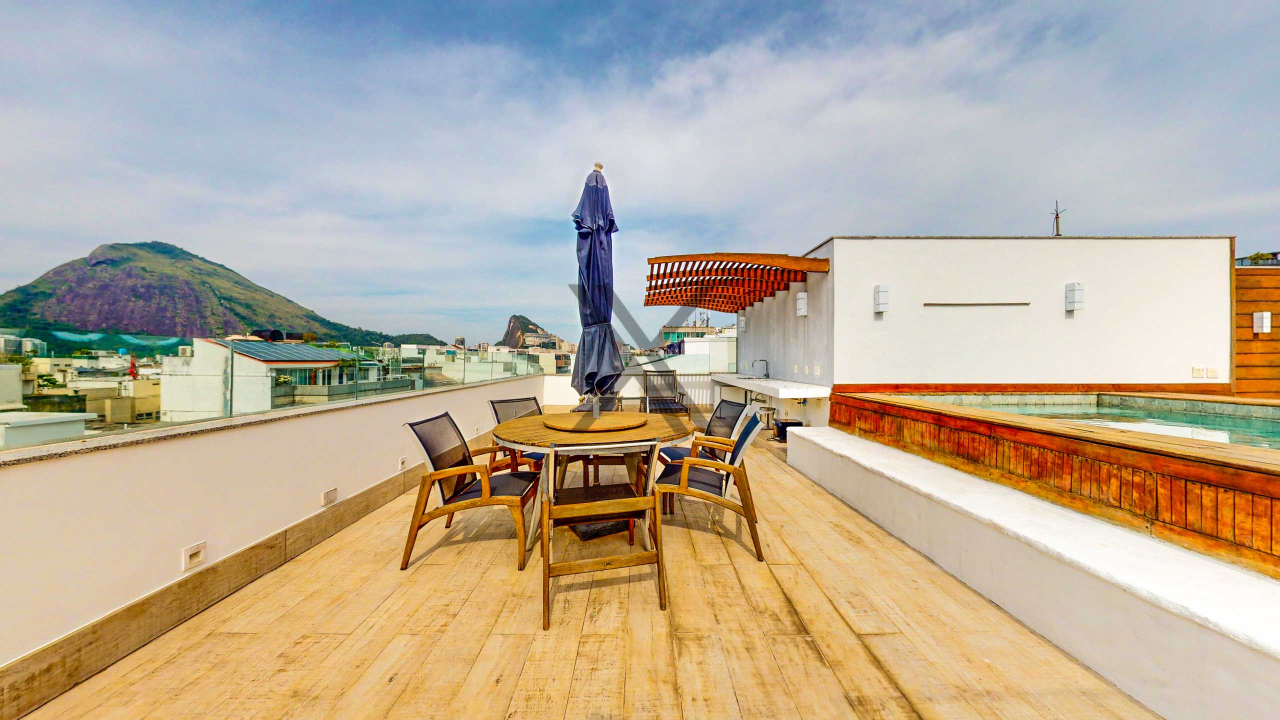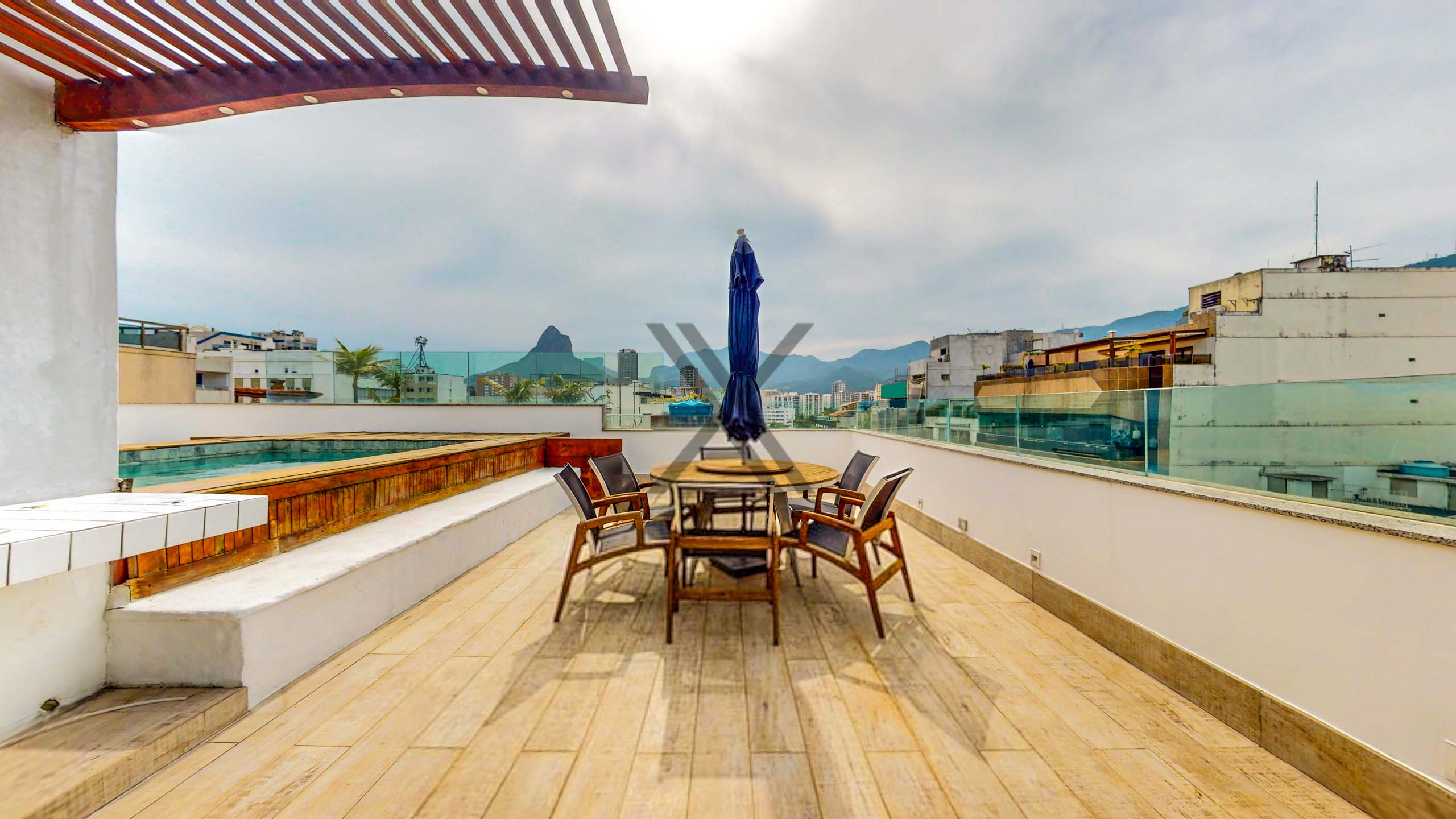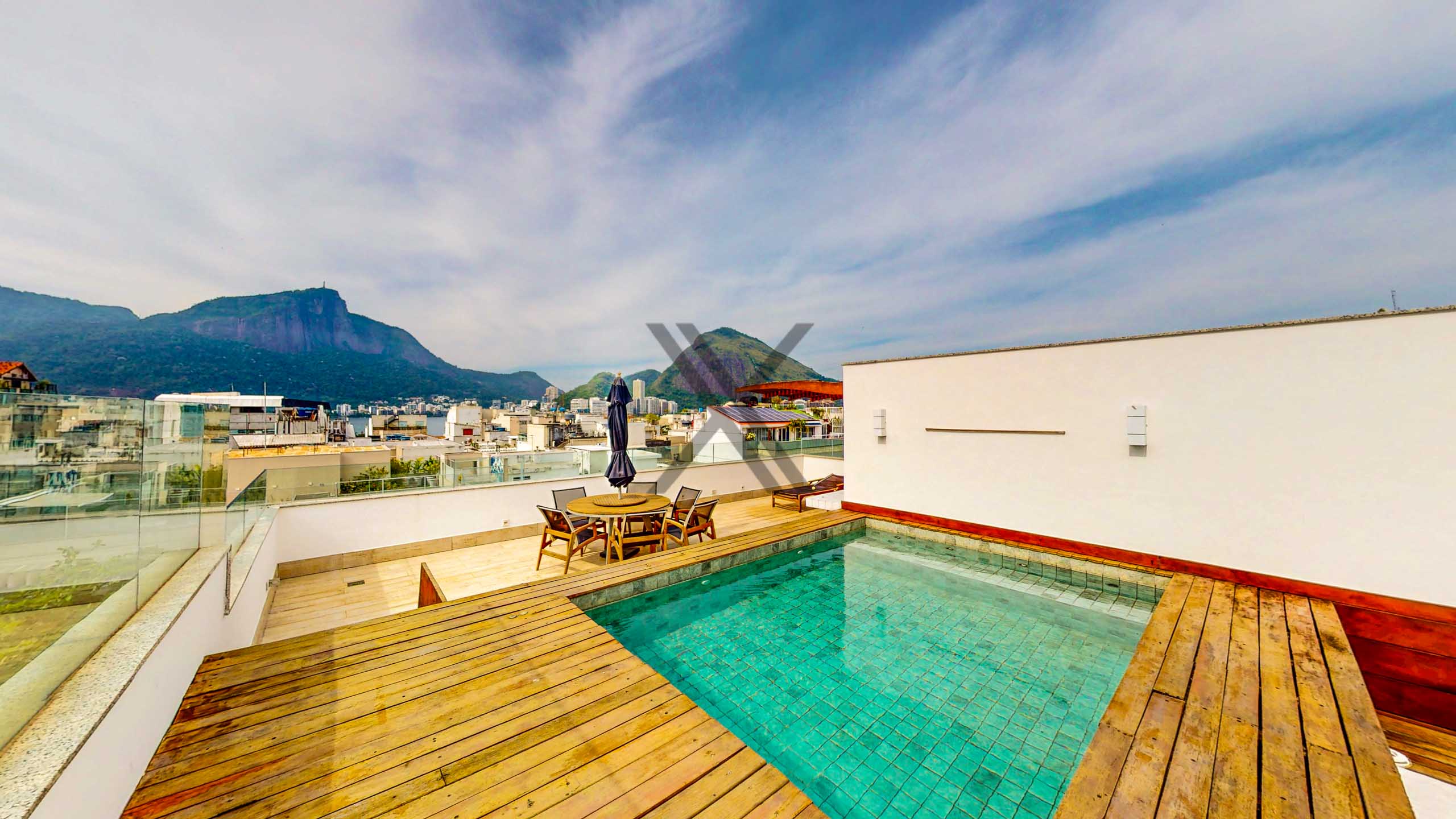 O acesso ao quarto e último pavimento se dá por uma bela escada em madeira. Nele, temos uma piscina, chuveirão, área de descanso e bancada com pia que possibilita a criação de uma segunda área gourmet. Também conta com uma linda vista para a Lagoa, Cristo, Pedra da Gávea e Morro Dois Irmãos que coroa este belo espaço.