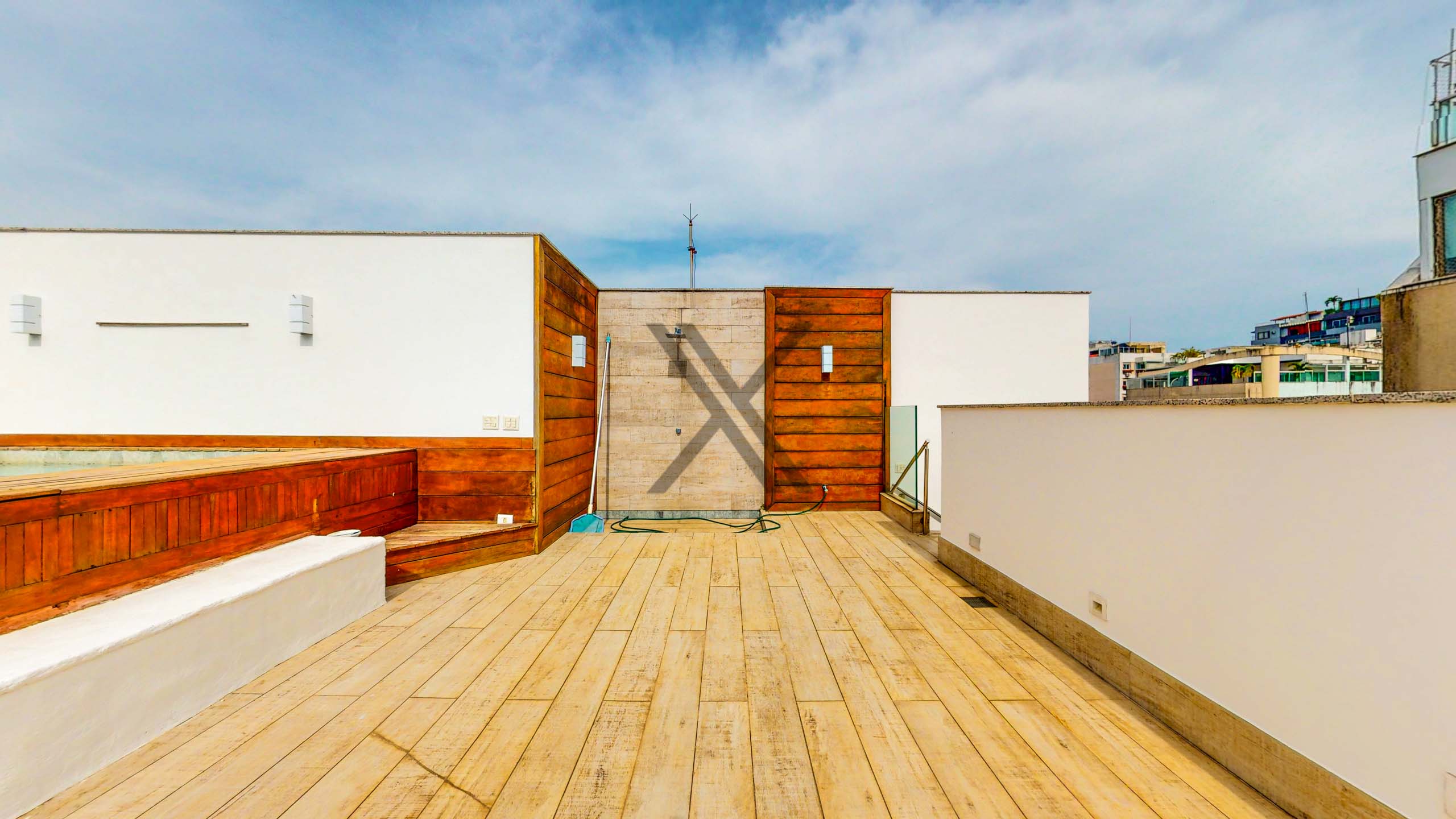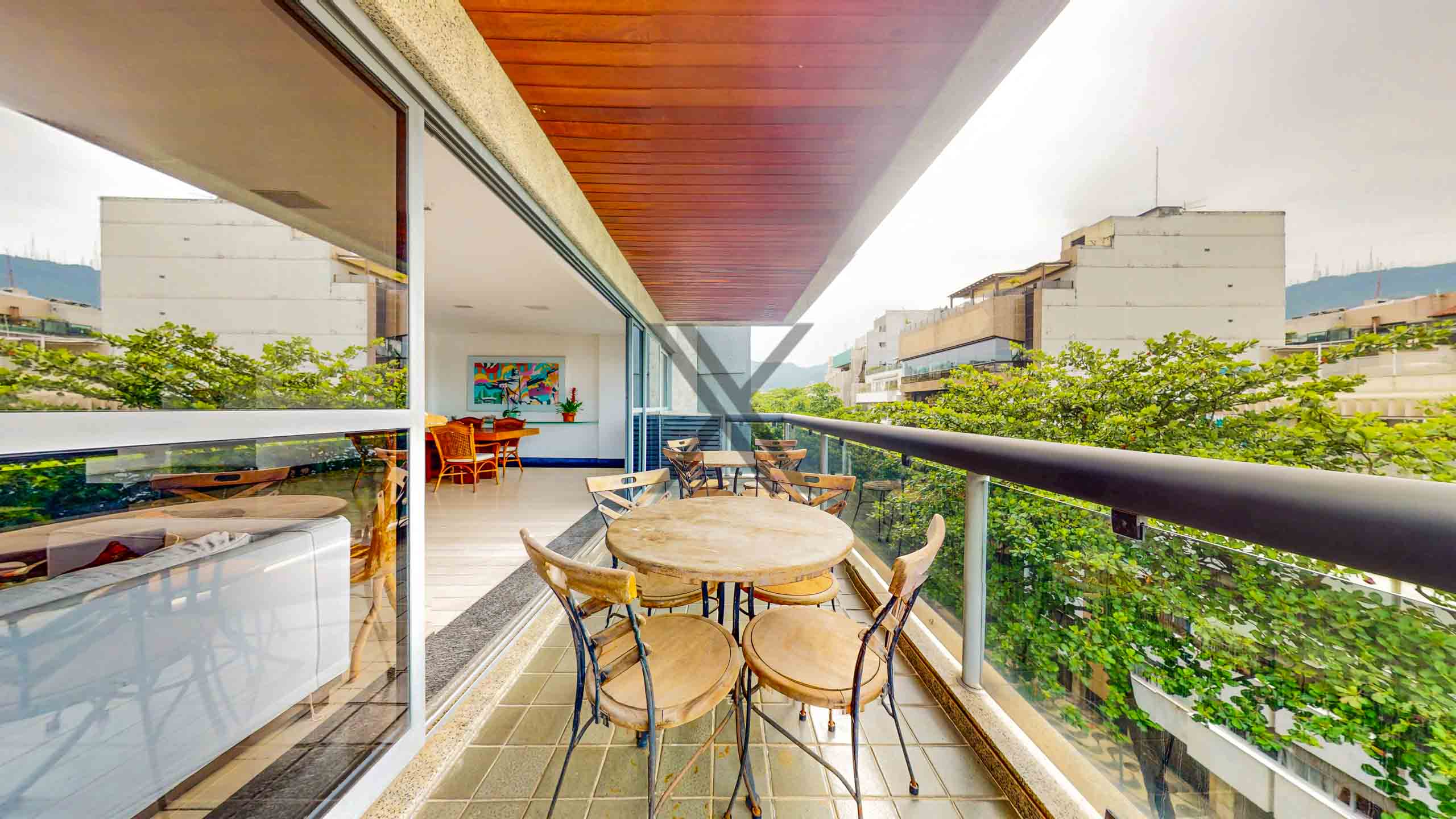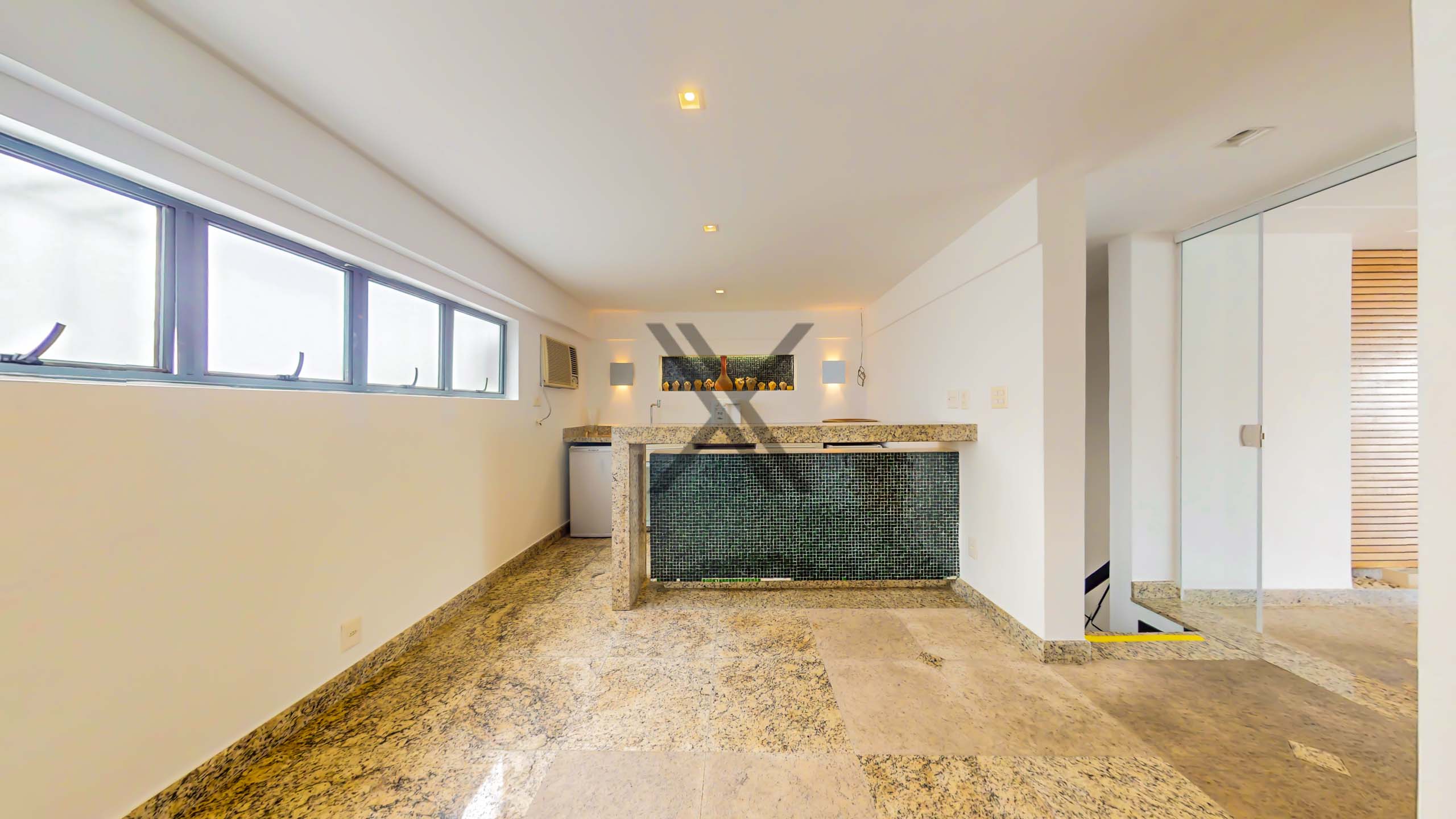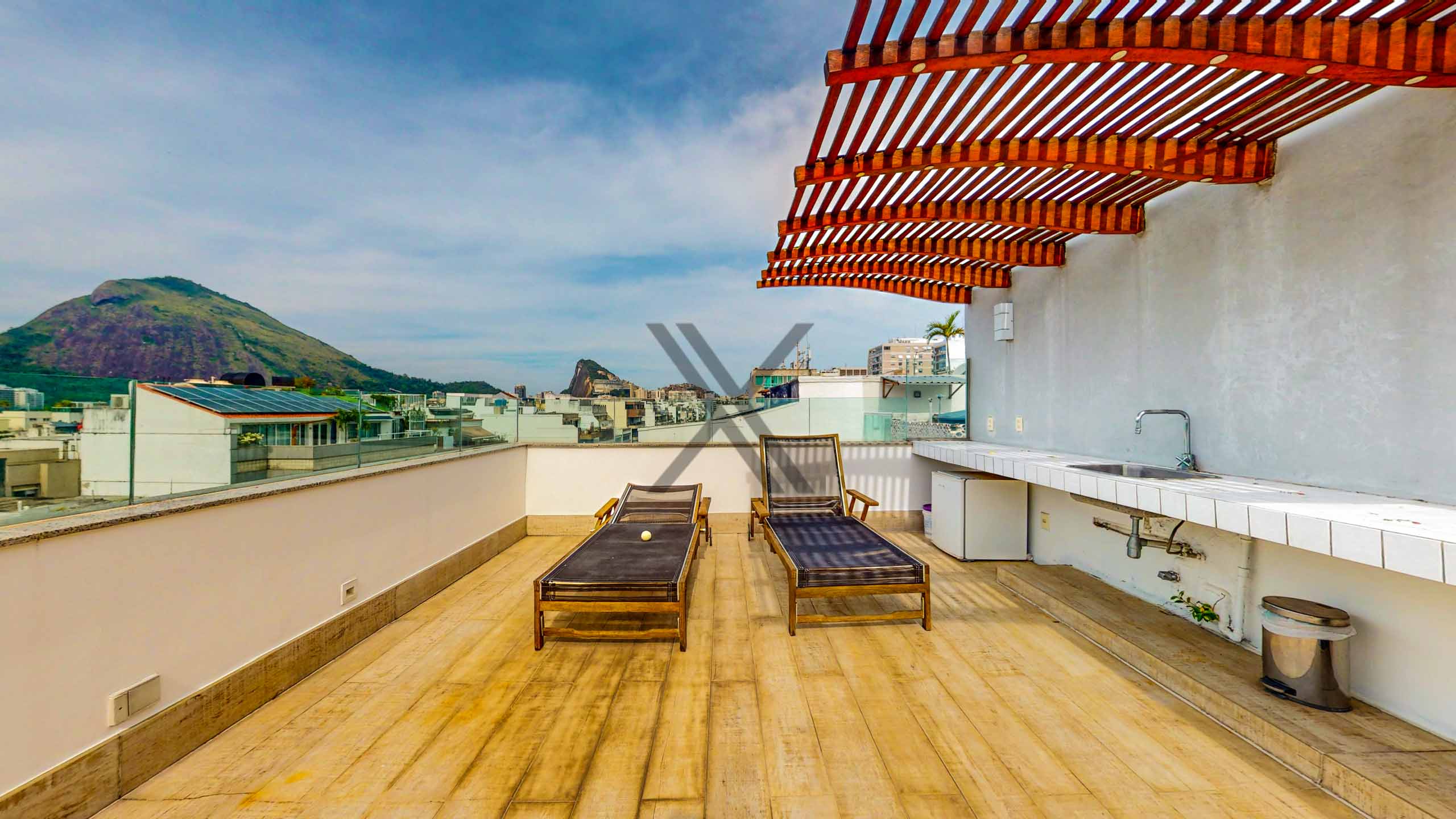 O acesso ao quarto e último pavimento se dá por uma bela escada em madeira. Nele, temos uma piscina, chuveirão, área de descanso e bancada com pia que possibilita a criação de uma segunda área gourmet. Também conta com uma linda vista para a Lagoa, Cristo, Pedra da Gávea e Morro Dois Irmãos que coroa este belo espaço.