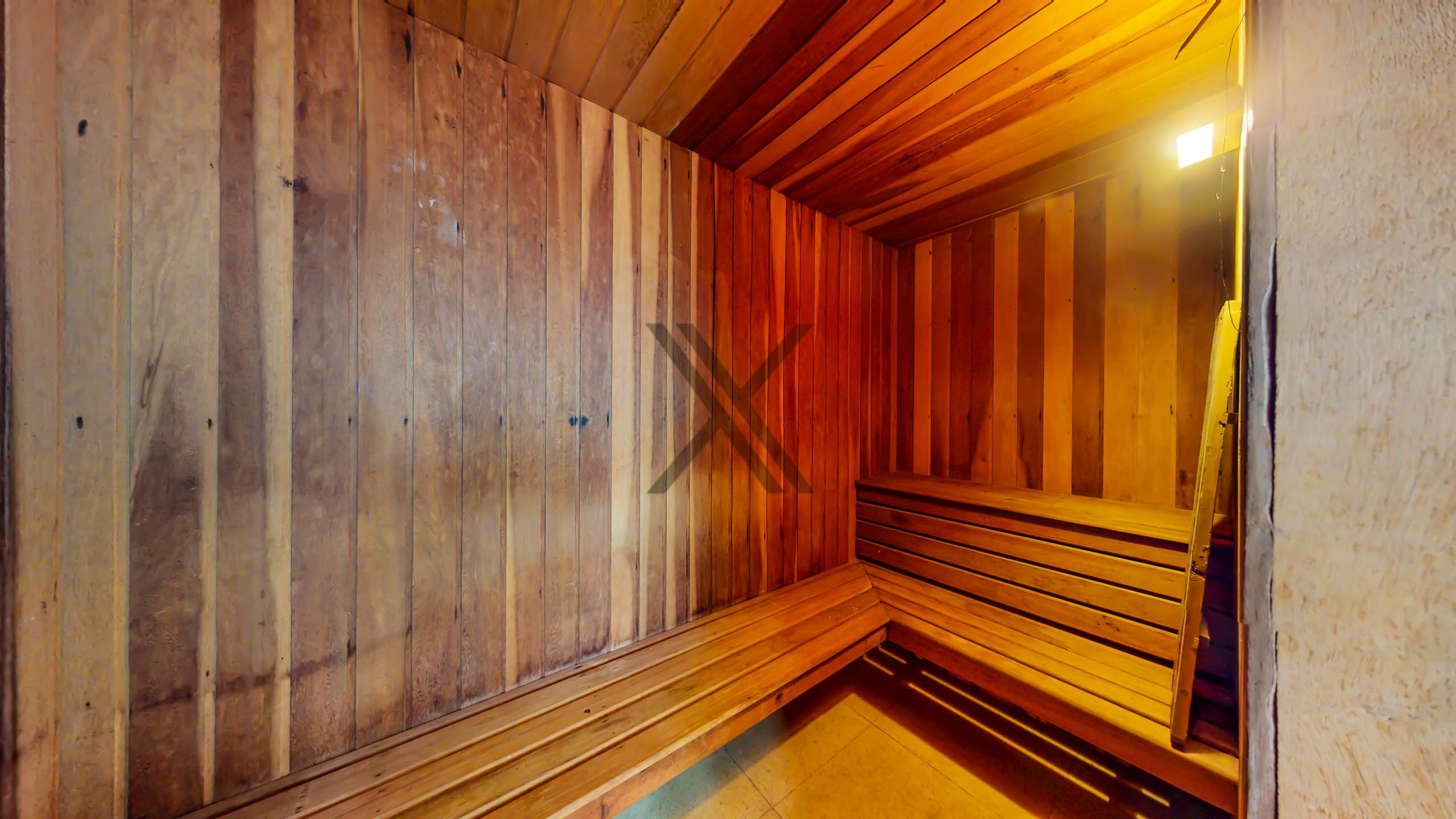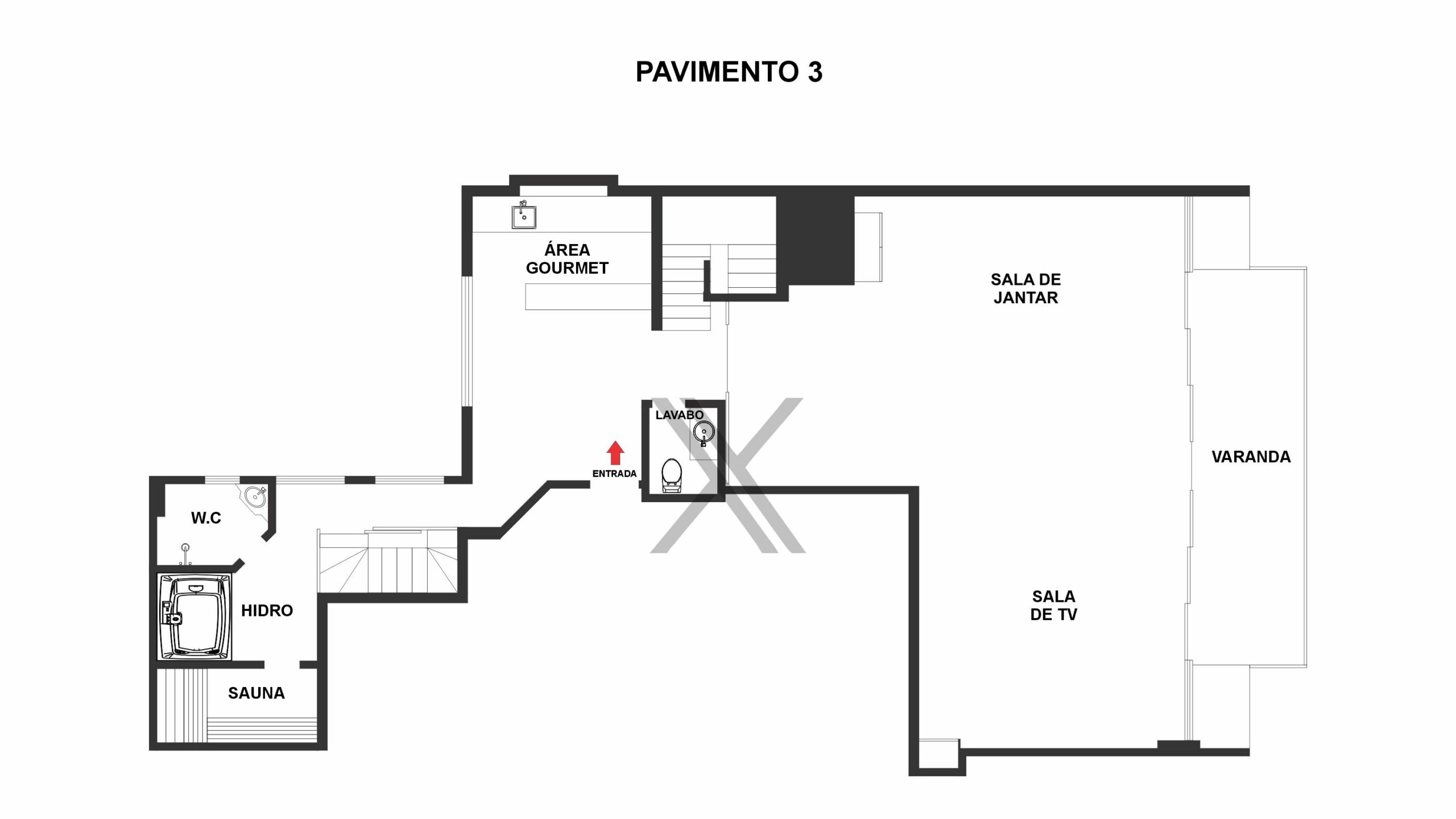 O terceiro pavimento está configurado como área de convívio e lazer. De um lado, ampla sala de TV, com varandão e lavabo. Do outro, uma sauna, hidromassagem e espaço gourmet.