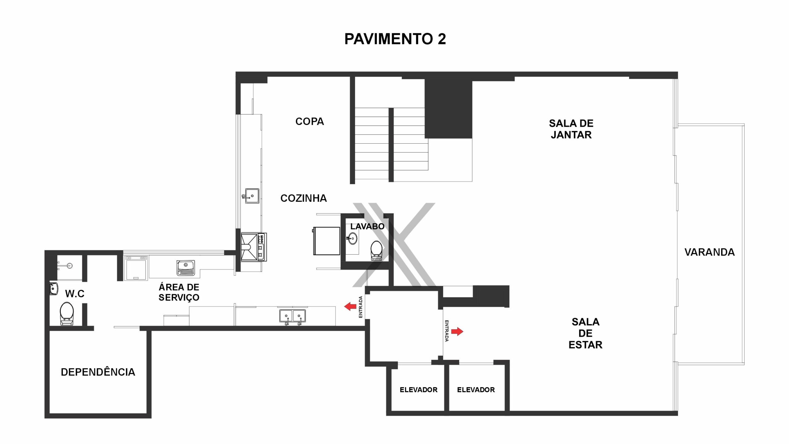 A cobertura possui 4 pavimentos em formato de casa suspensa. Em 2 deles há acesso direto pelo elevador: sendo o primeiro pavimento, onde estão as suítes e o segundo pavimento, onde está a parte social, de cozinha e serviço.