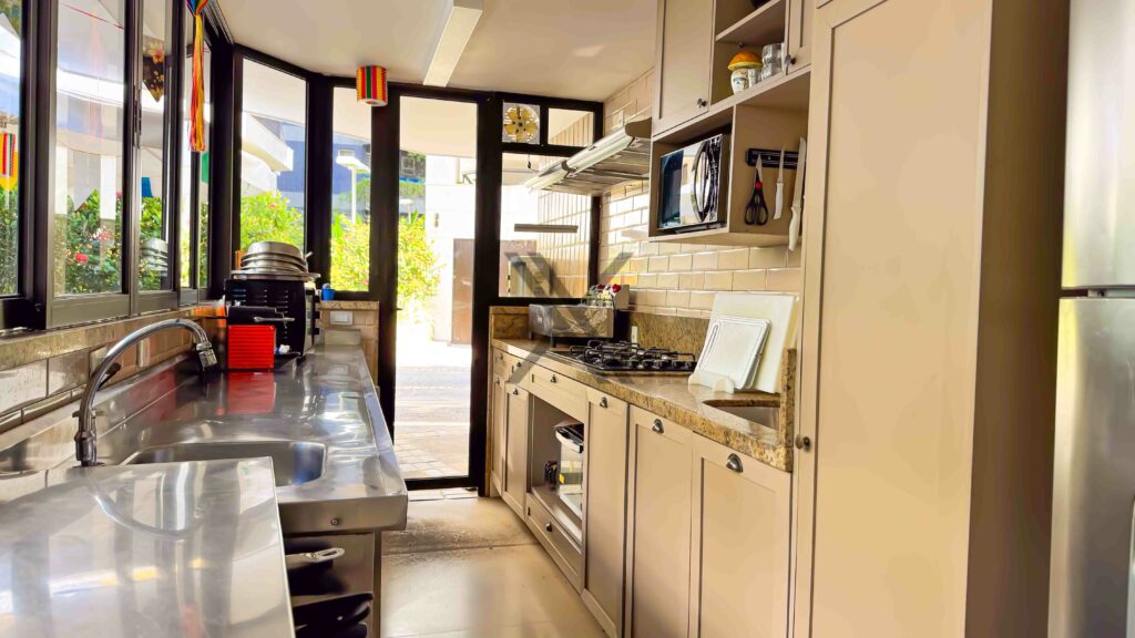 A cozinha é ampla, bem iluminada e repleta de armários planejados. O espaço ainda conta com copa de apoio, área de serviço espaçosa, 3 dependências completas e um depósito de rouparia com acabamento em mármore.
