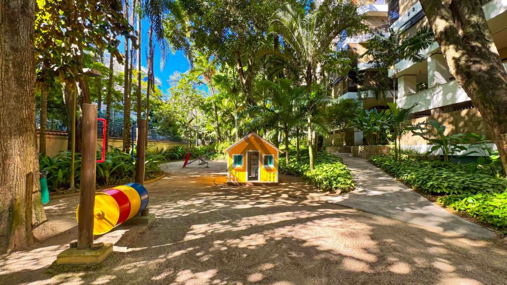 O condomínio é um capítulo à parte: com segurança armada, portaria 24 horas, infraestrutura com piscina, quadra esportiva e um parque com paisagismo exuberante, com o Cristo e a mata atlântica como cenário.