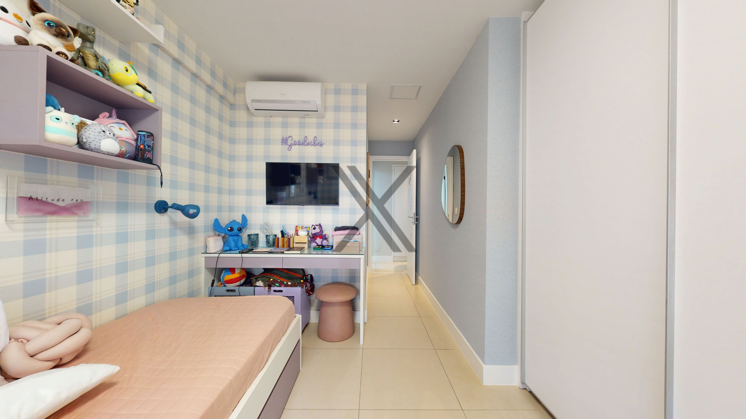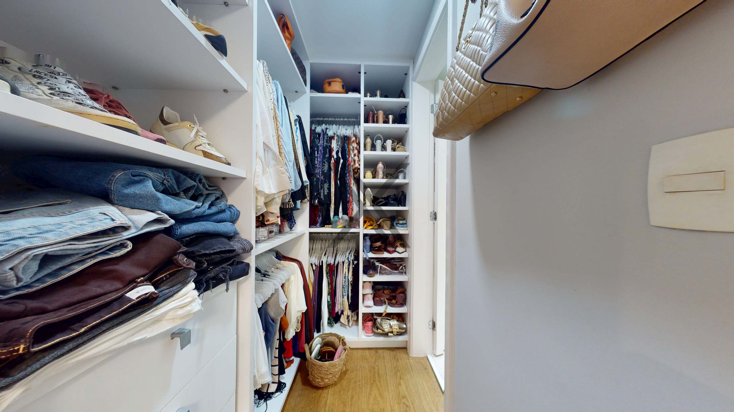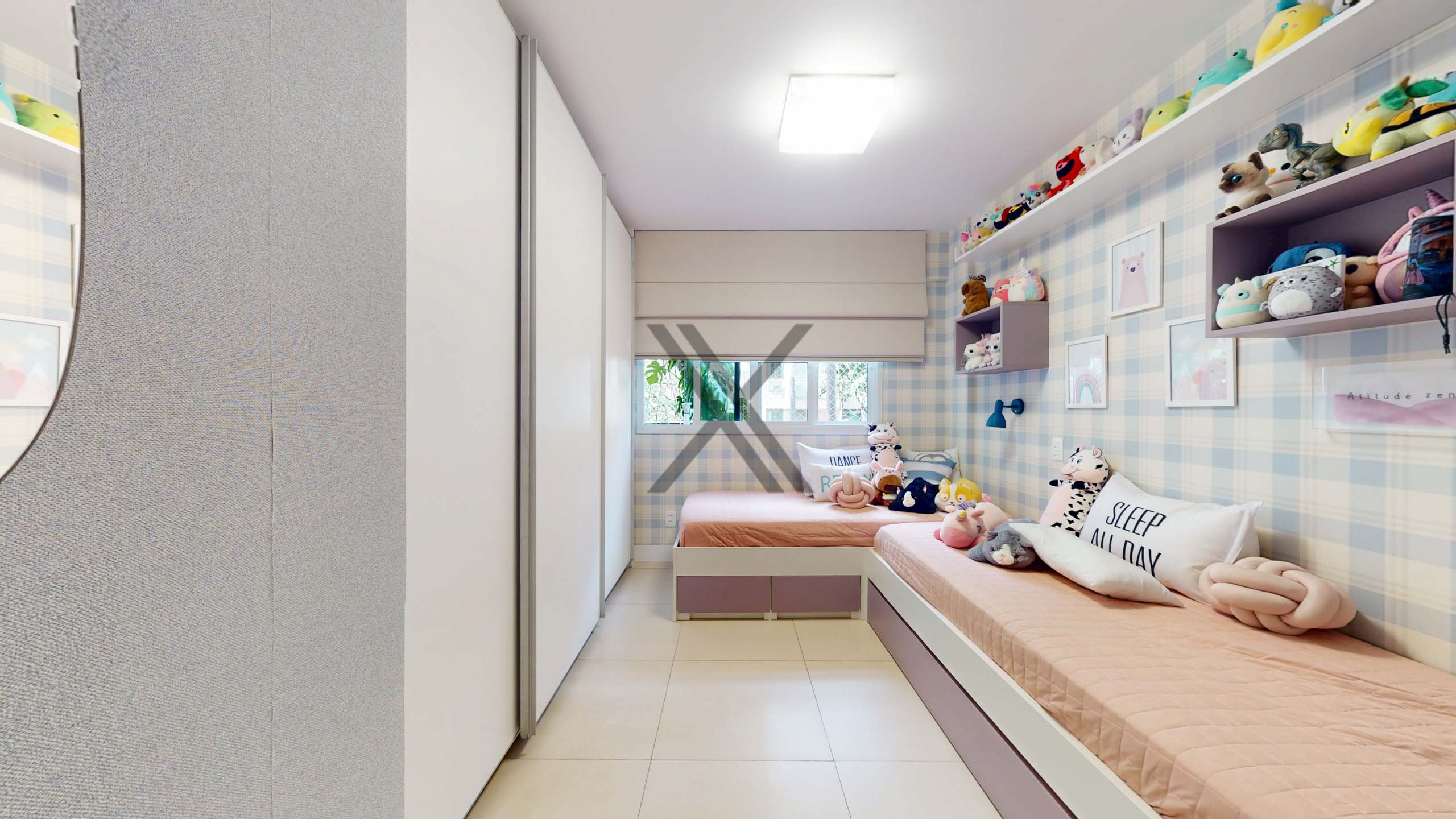 A parte privativa apresenta 3 quartos, sendo 1 suíte com walk-in closet, todos com splits e armários em boa quantidade e de excelente qualidade, facilitando a vida dos futuros compradores deste imóvel. Também, por serem de fundos, os quartos são totalmente silenciosos e privativos. Um banheiro social de apoio complementa o ambiente.