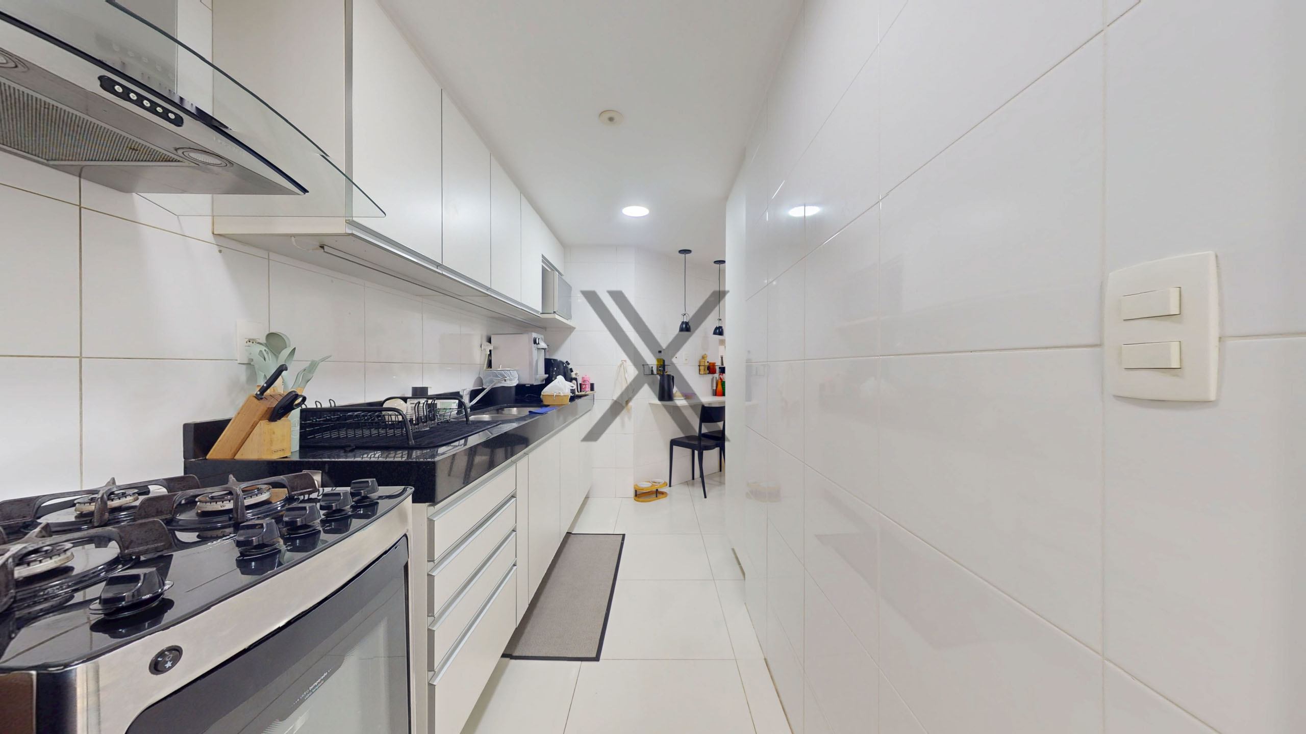 A cozinha possui bom tamanho, com muitos armários, bancadas para apoio e organização e uma área para pequenas refeições. Em anexo, estão a área de serviço com espaço de armazenamento e dependência completa para funcionários.