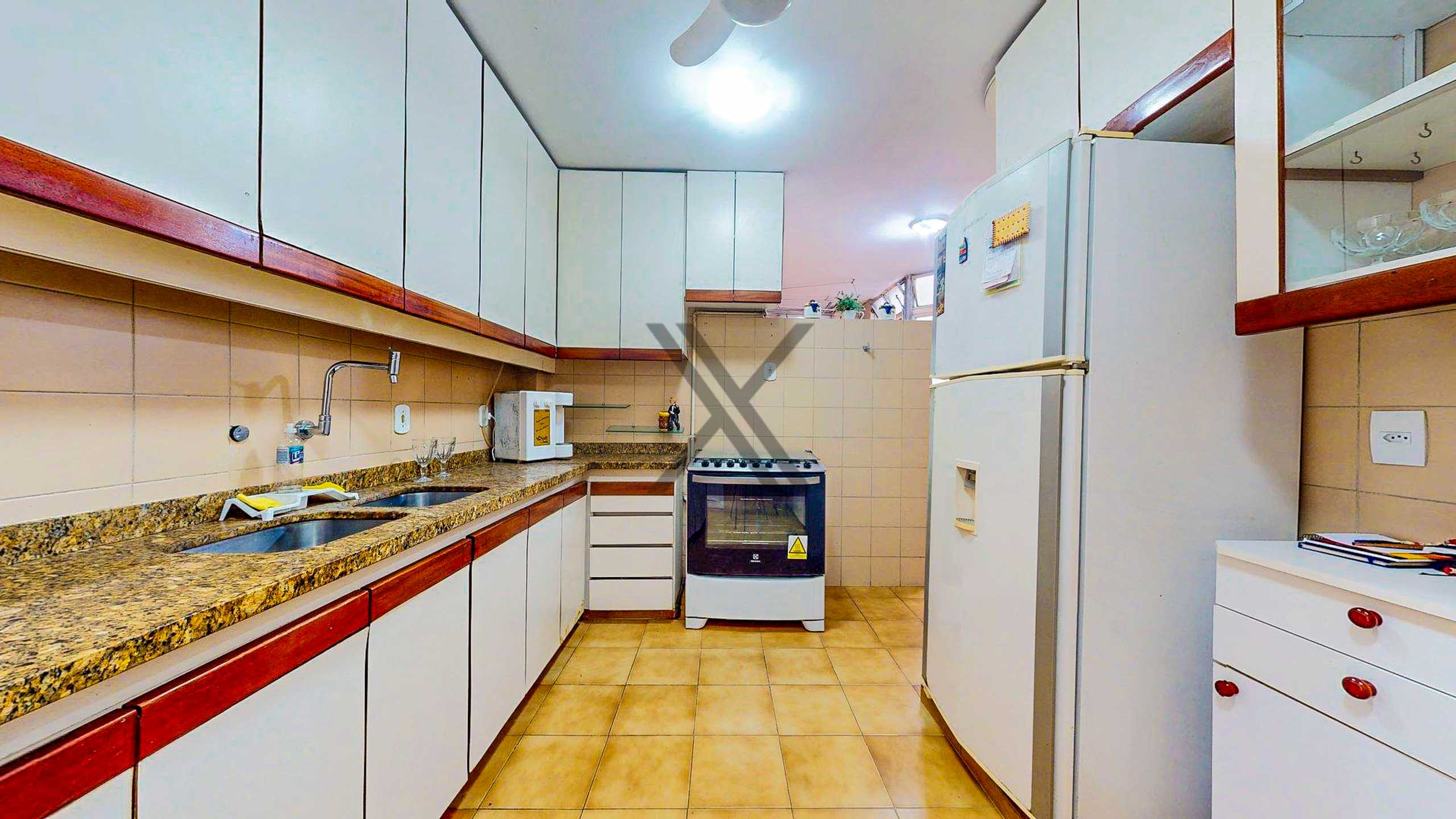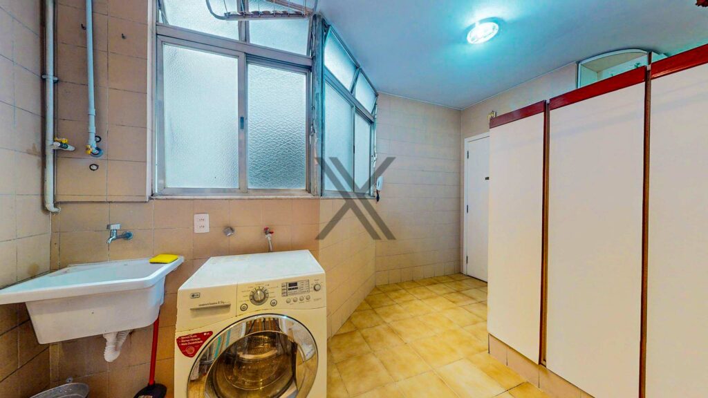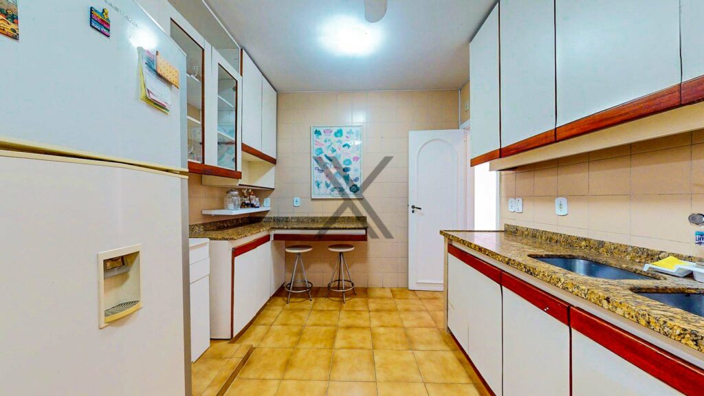 A cozinha apresenta bastante espaço de armazenagem, bancadas para apoio e organização e bom espaço de circulação. Em anexo, temos uma área de serviço com uma dependência completa para funcionários.