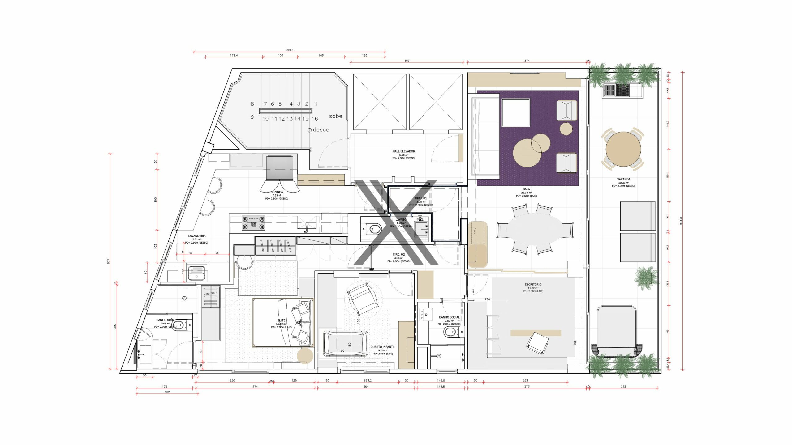 A área social apresenta uma incrível sala em dois ambientes e ótima varanda, que também pode ser dividida em dois ambientes, a qual oferece vista para a Lagoa e para o Cristo Redentor. Em anexo à sala, lavabo de apoio.