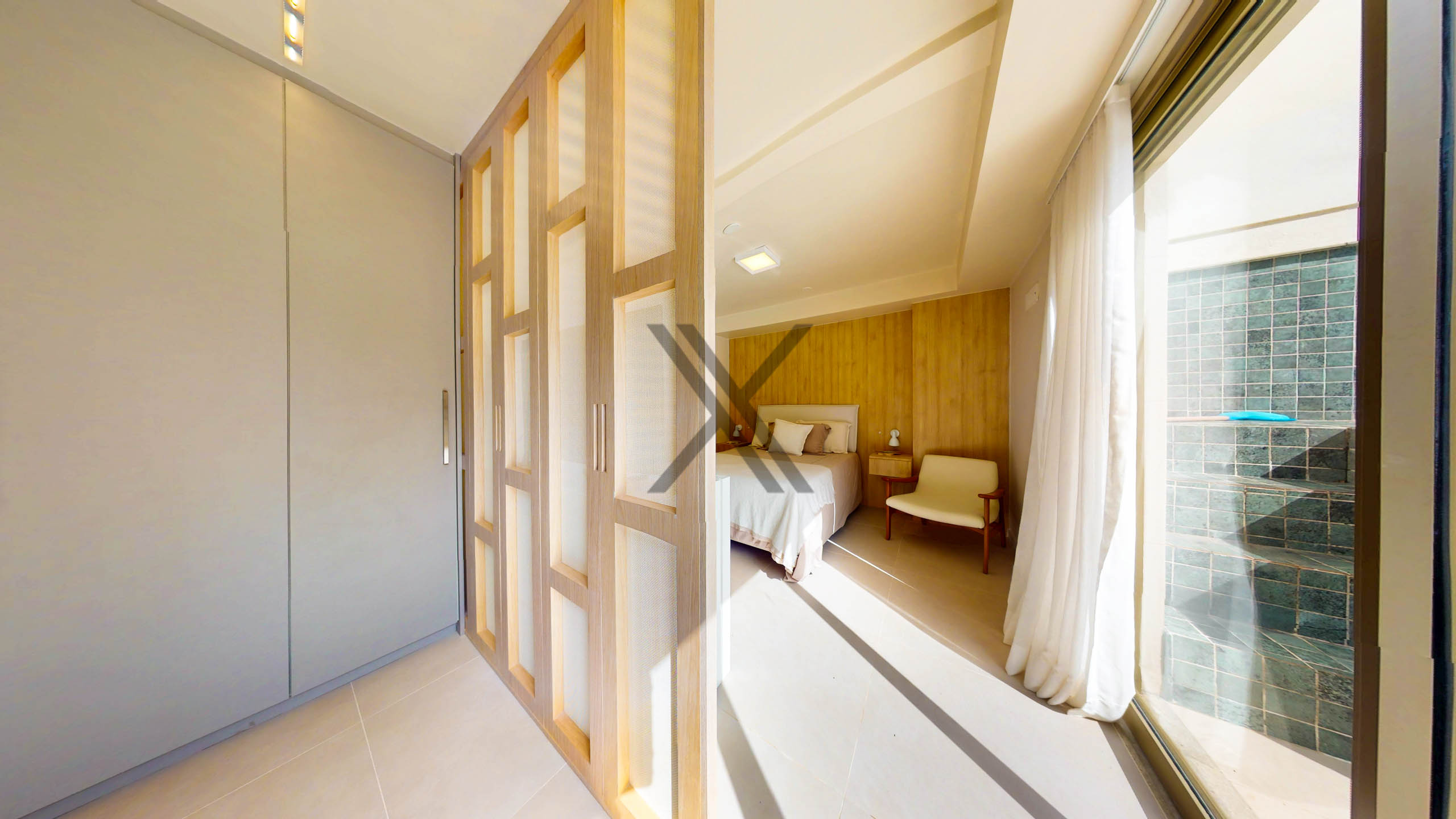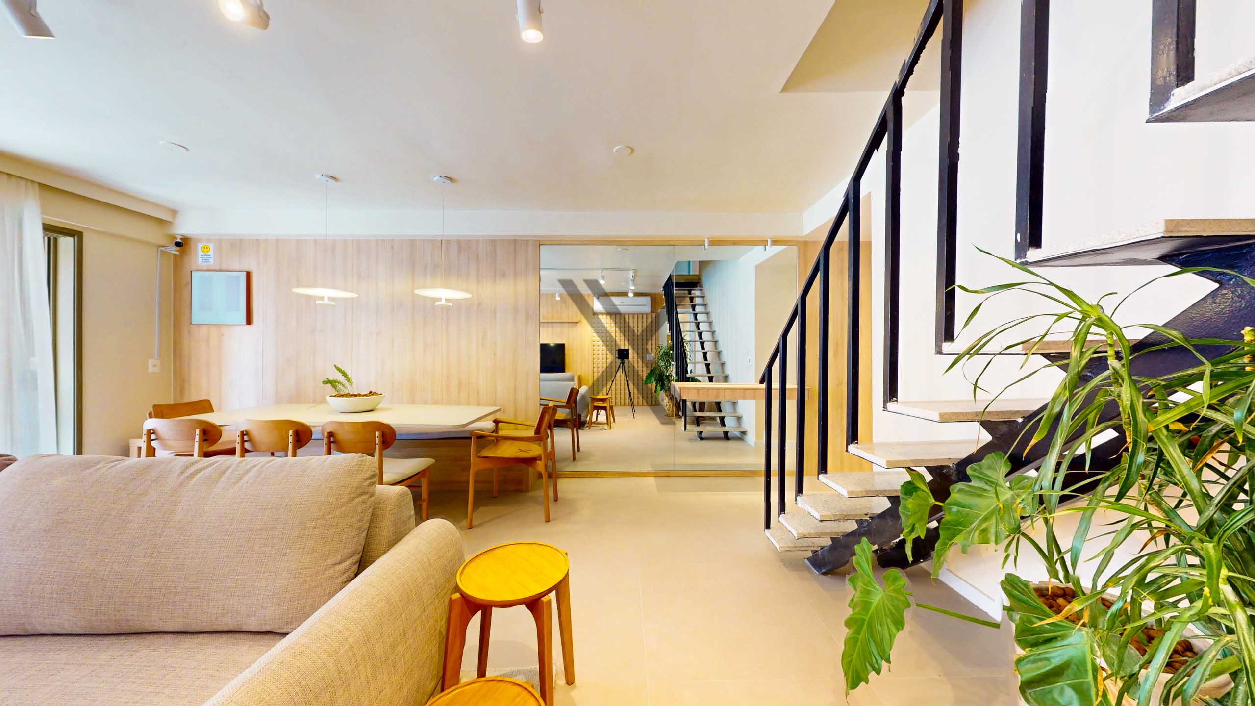 No primeiro pavimento, ao entrarmos, temos uma sala em 2 ambientes, com belos projetos de marcenaria e luminotécnico. A aconchegante varanda proporciona um espaço de interação social, com área gourmet e área de descanso. Um lavabo de apoio às visitas complementa o ambiente. A área privativa deste pavimento conta com 3 suítes, todas com bom tamanho e linda marcenaria, sendo 2 delas com acesso à varanda principal.