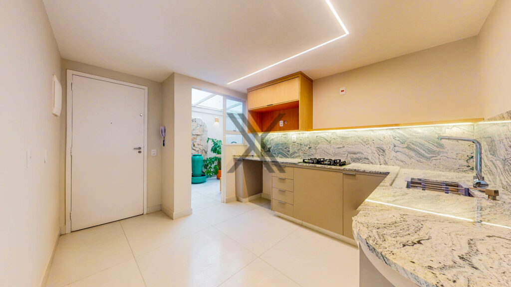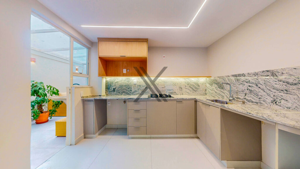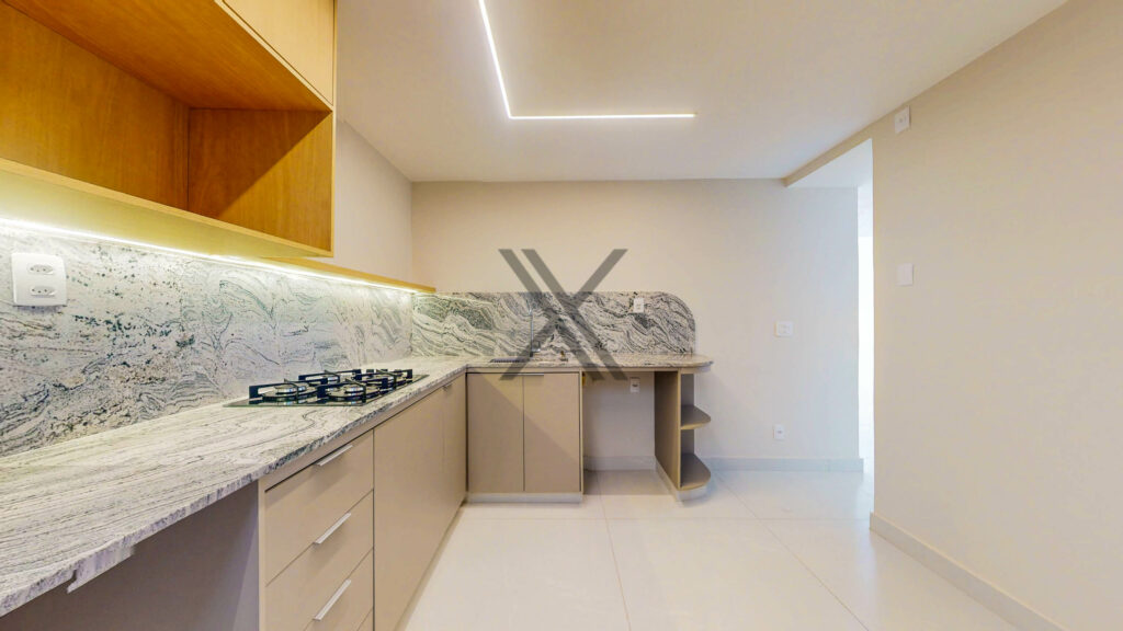 A cozinha, conta com armários planejados, bancadas para apoio e organização, cooktop e uma linda bancada para pequenas refeições.