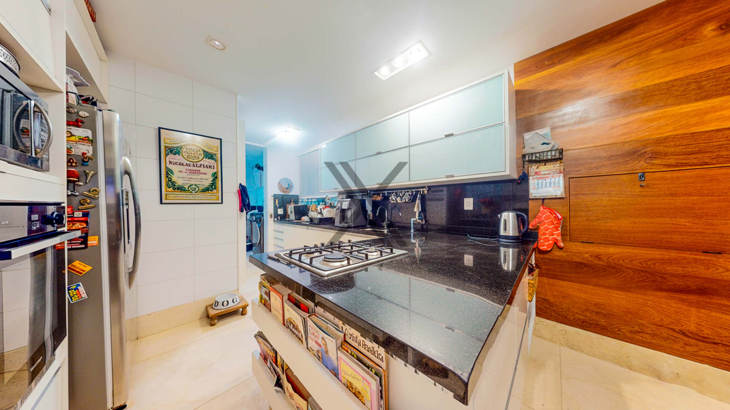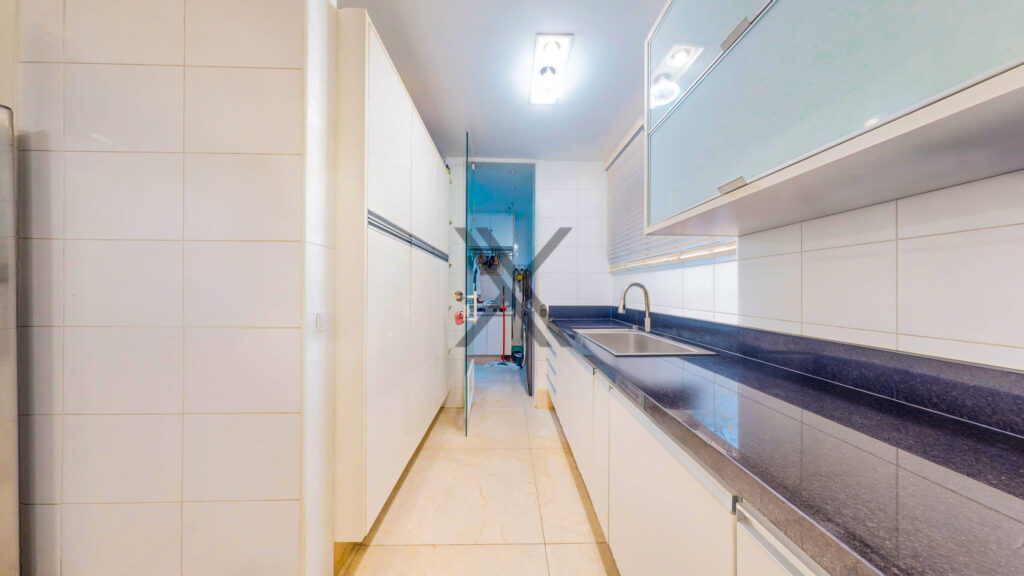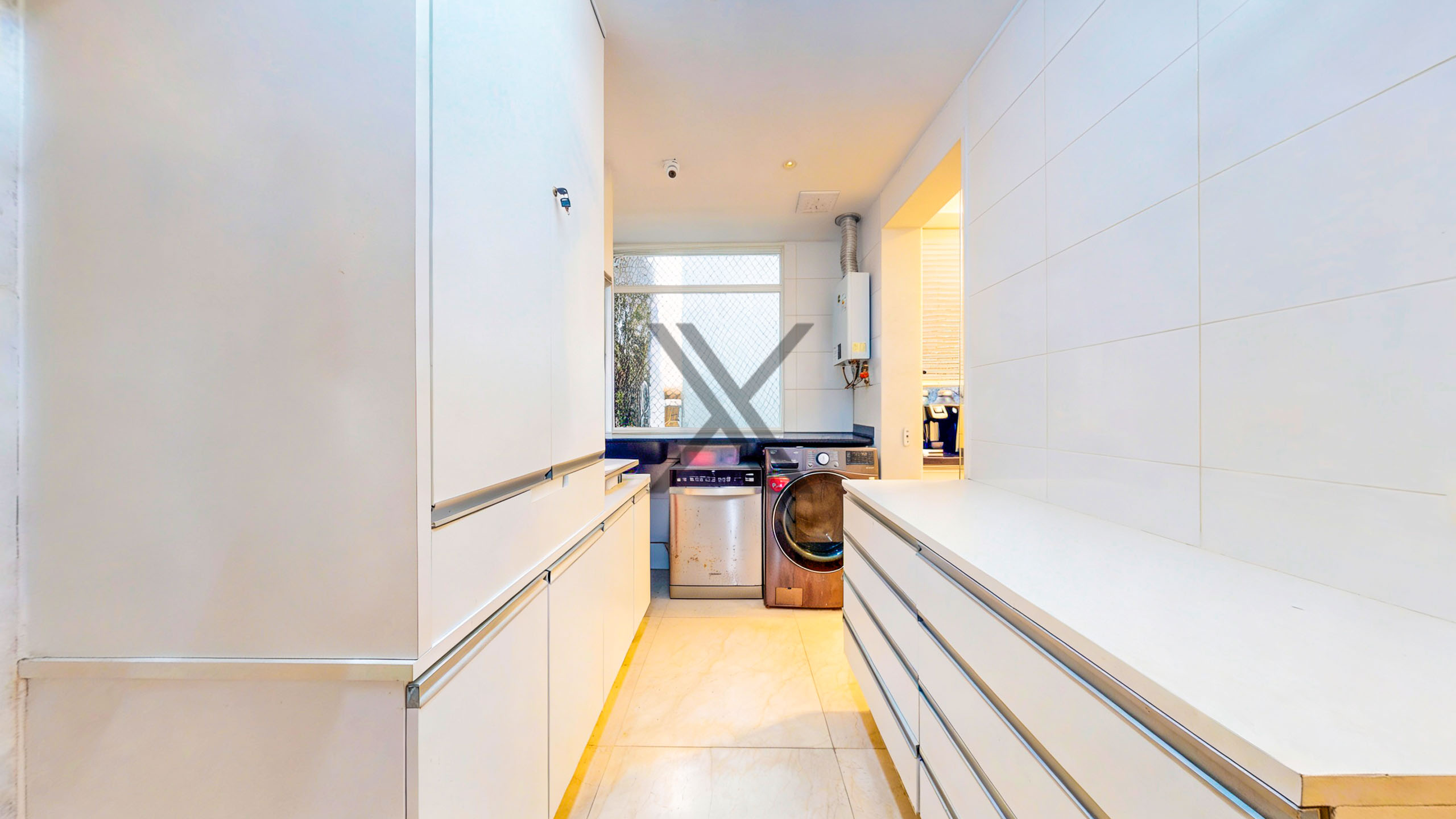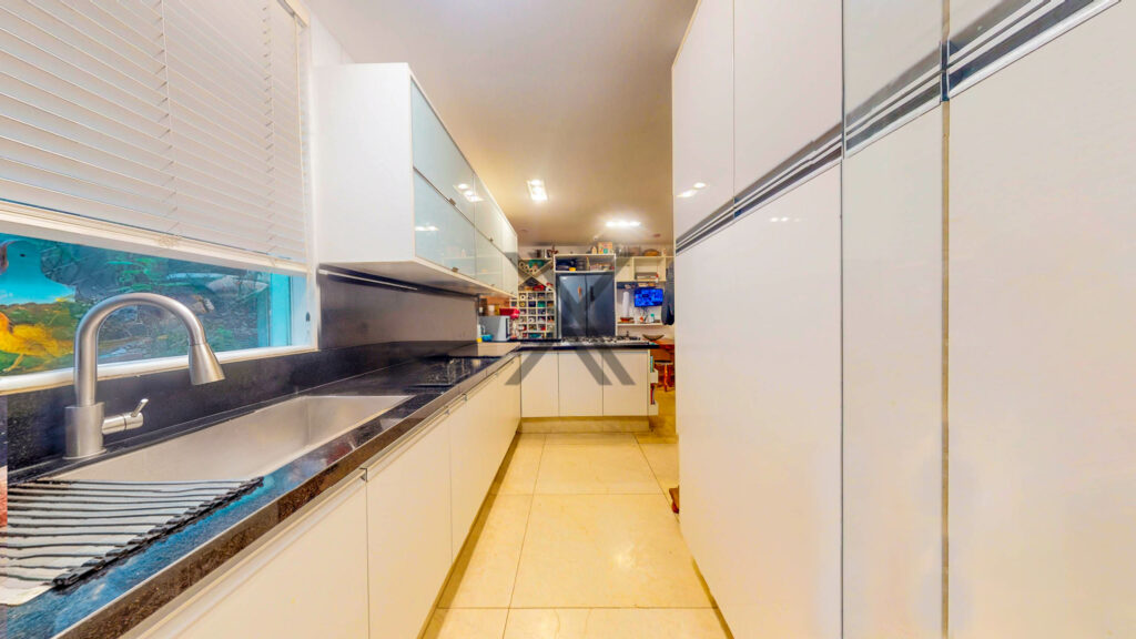 A cozinha traz comodidade e versatilidade para o dia a dia dos moradores, com farta quantidade de armários e longas bancadas para apoio e organização, as quais garantem bastante espaço de armazenagem. A área de lavanderia está separada da cozinha e possui armários e espaço para máquinas lava e seca. Uma dependência completa para funcionários complementa o ambiente.