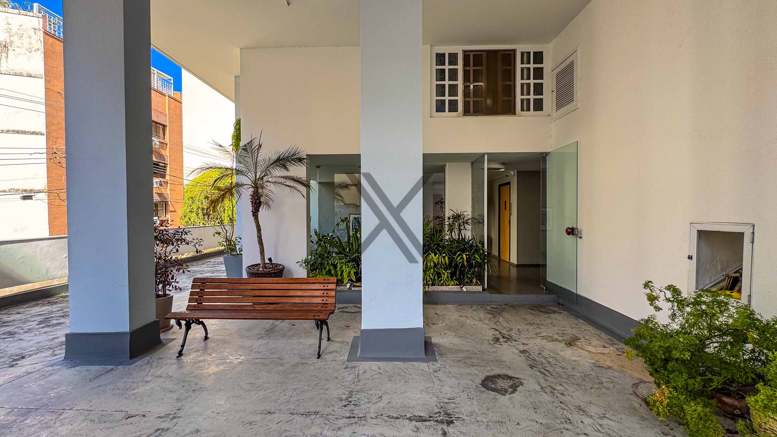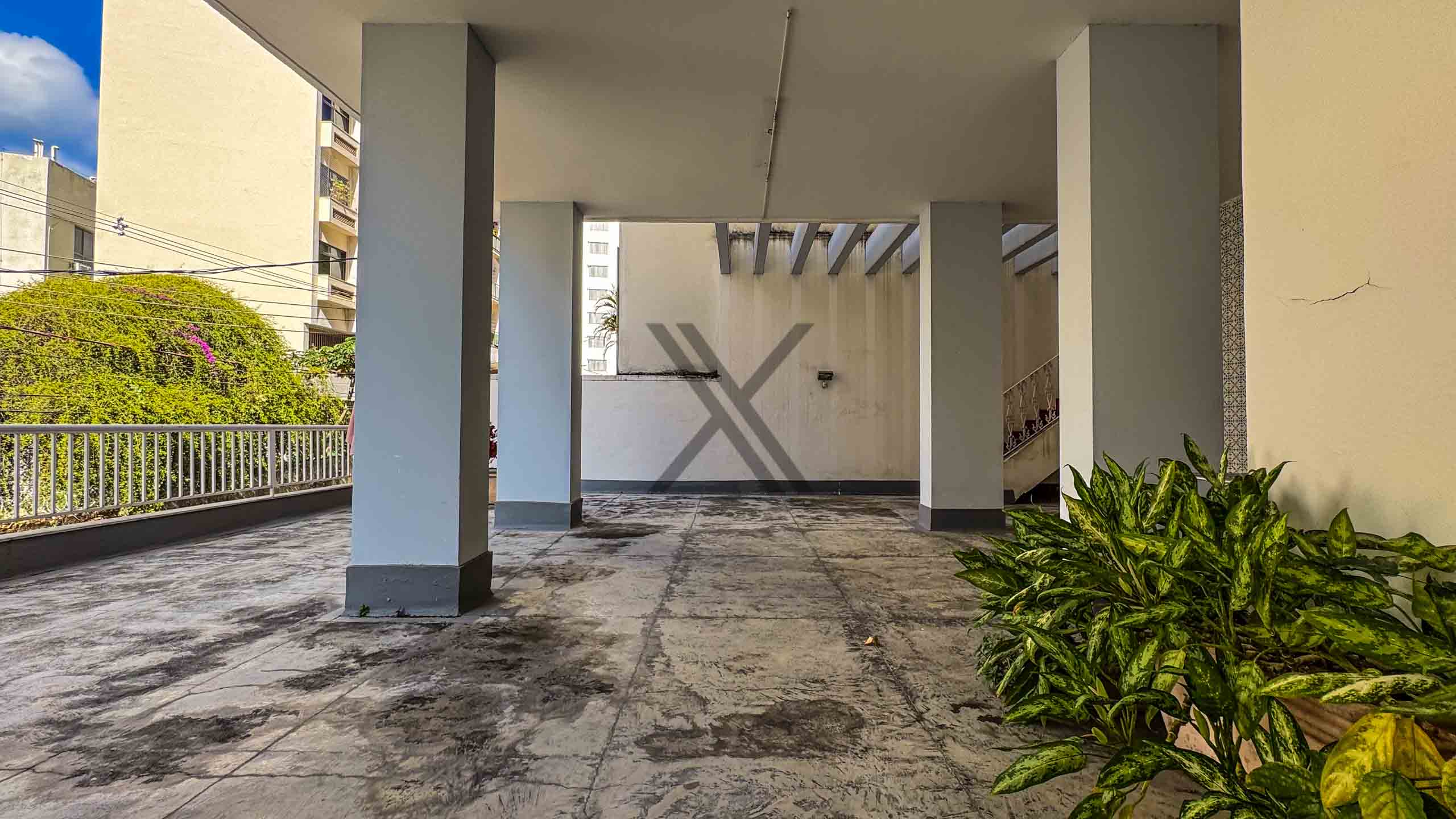 A área externa é bem espaçosa, dando uma aparência de casa a este simpático apartamento.