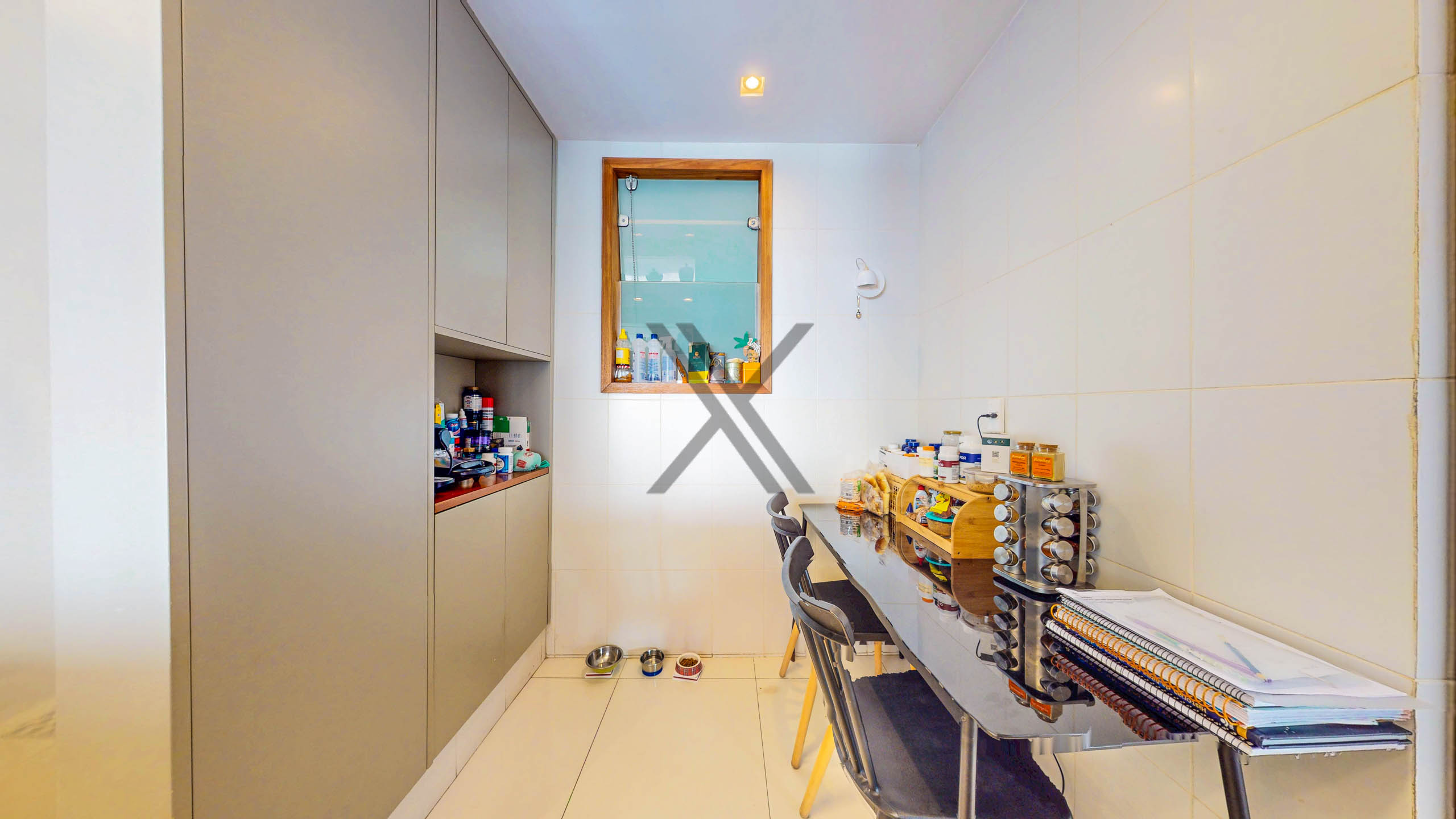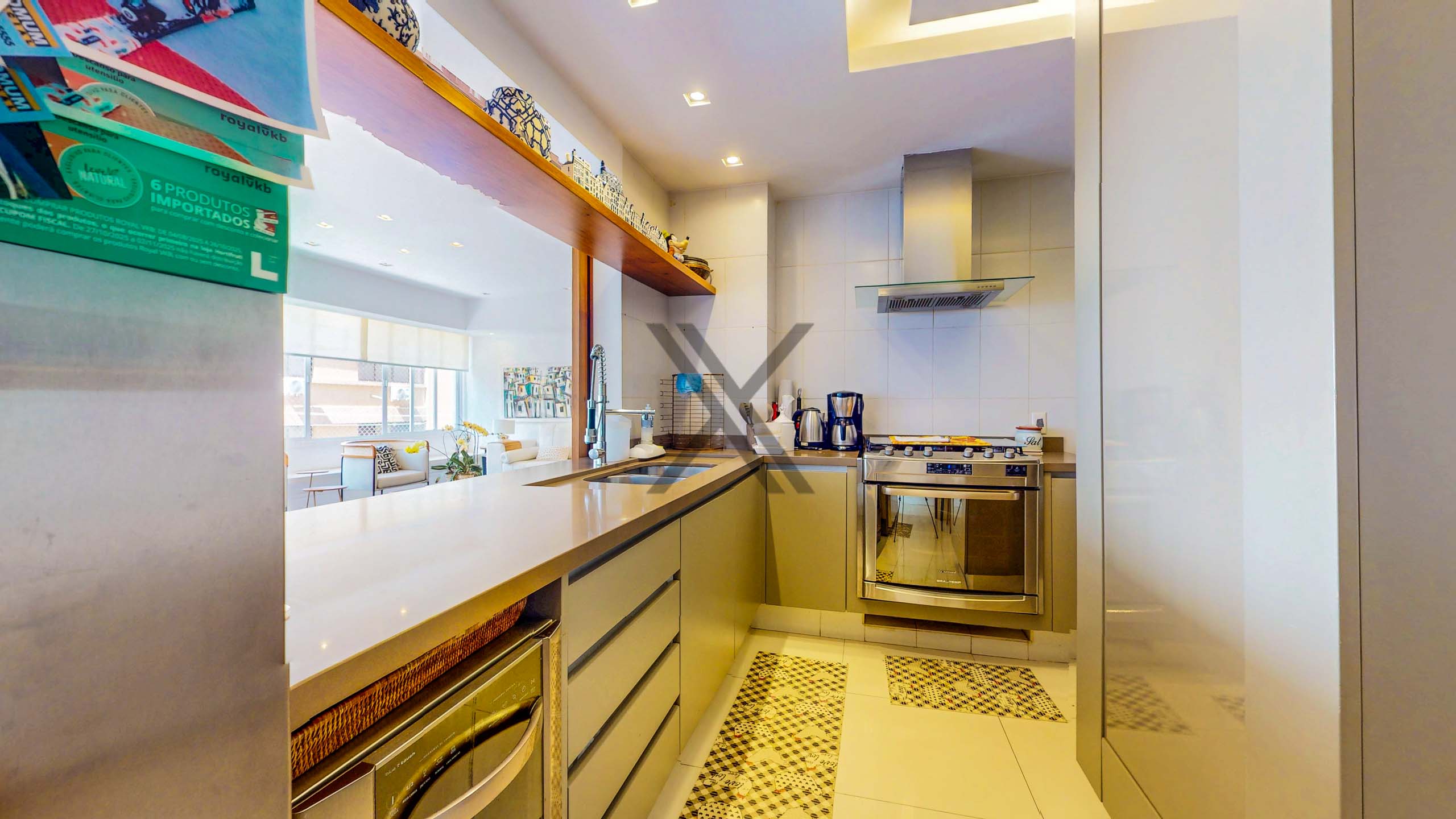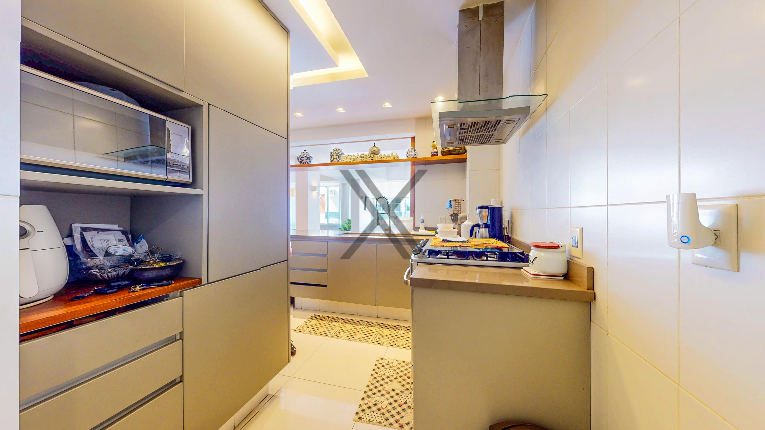 A cozinha, em conceito semiaberto, conta com uma copa para pequenas refeições, armários planejados, pia em inox com cuba dupla, coifa e espaço para geladeira 2 portas. Em anexo, está uma grande área de serviço, com dependência completa para funcionários.