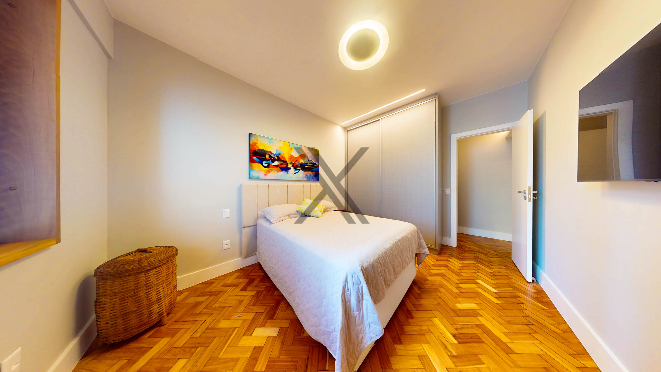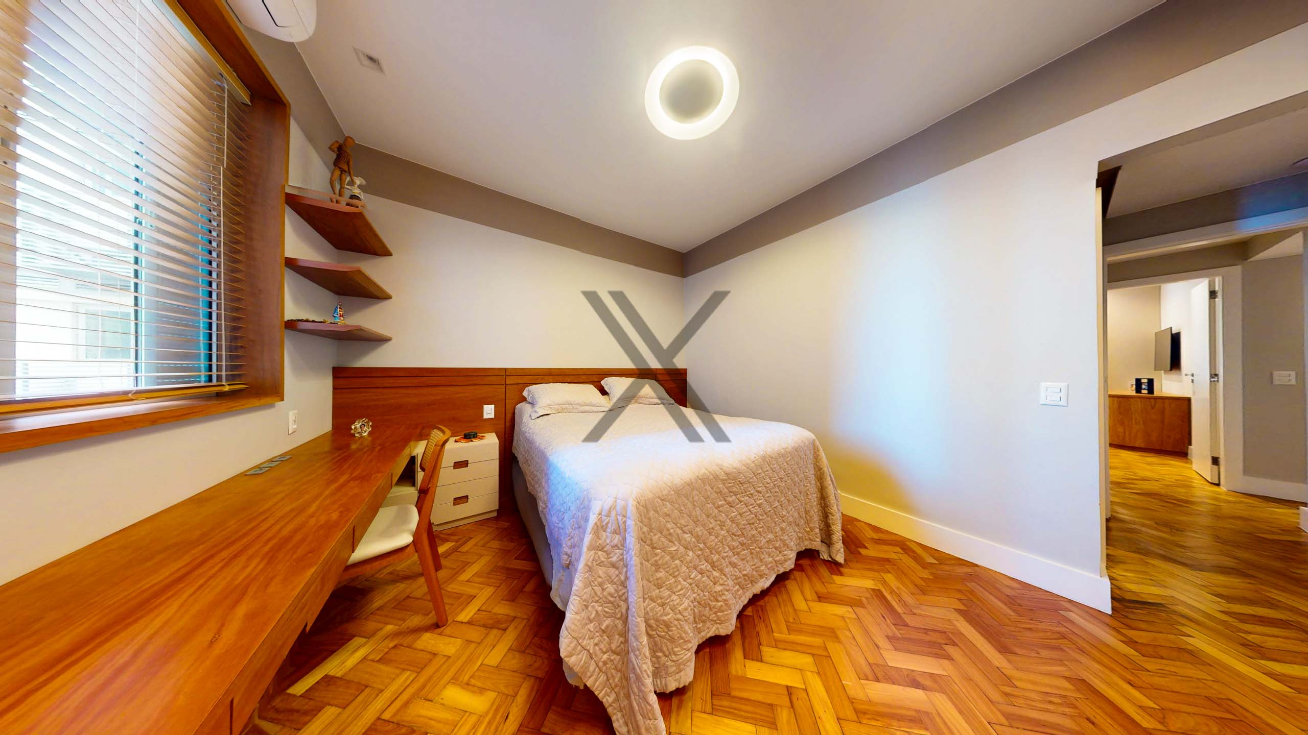 A área privativa é composta por 3 quartos, sendo 2 suítes, todos com ótimas metragens, projeto de marcenaria, ares-condicionados e excelente iluminação natural, além de um banheiro social. O piso original em madeira está em perfeito estado, realçando as características clássicas deste belo apartamento.