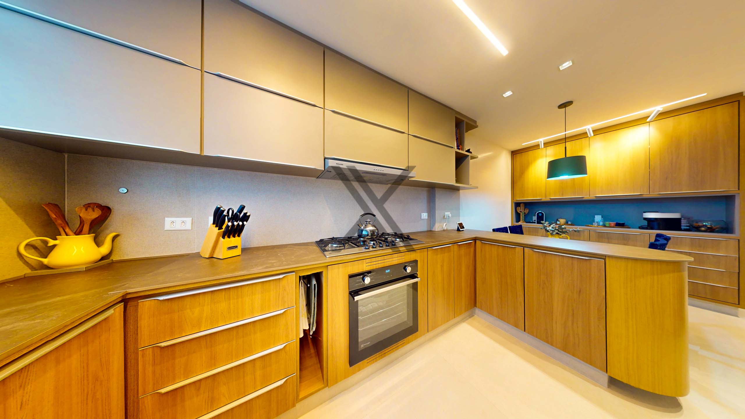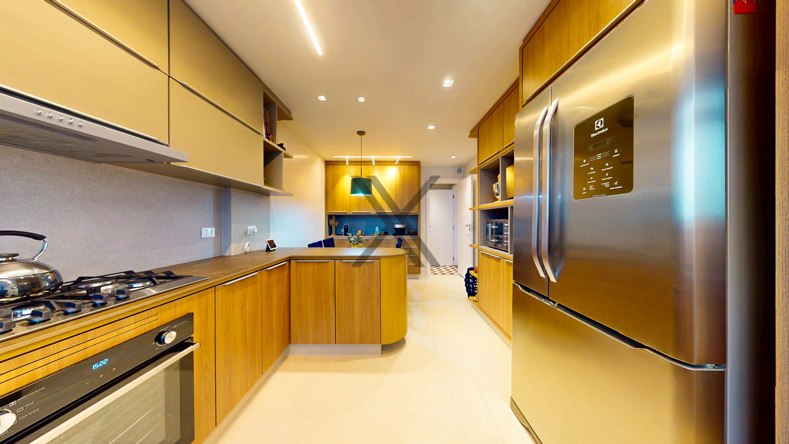 A cozinha possui uma copa, para a praticidade do cotidiano, e conta com uma grande quantidade de armários, além de ter bancadas longas para apoio e organização. Além disso, conta com o que tem de mais moderno em eletrodomésticos, com cooktop, forno embutido, cuba dupla em aço inox e escorredor embutido, também em inox. A área de serviço é separada da cozinha e oferece acesso a uma despensa e dependência completa para funcionários.