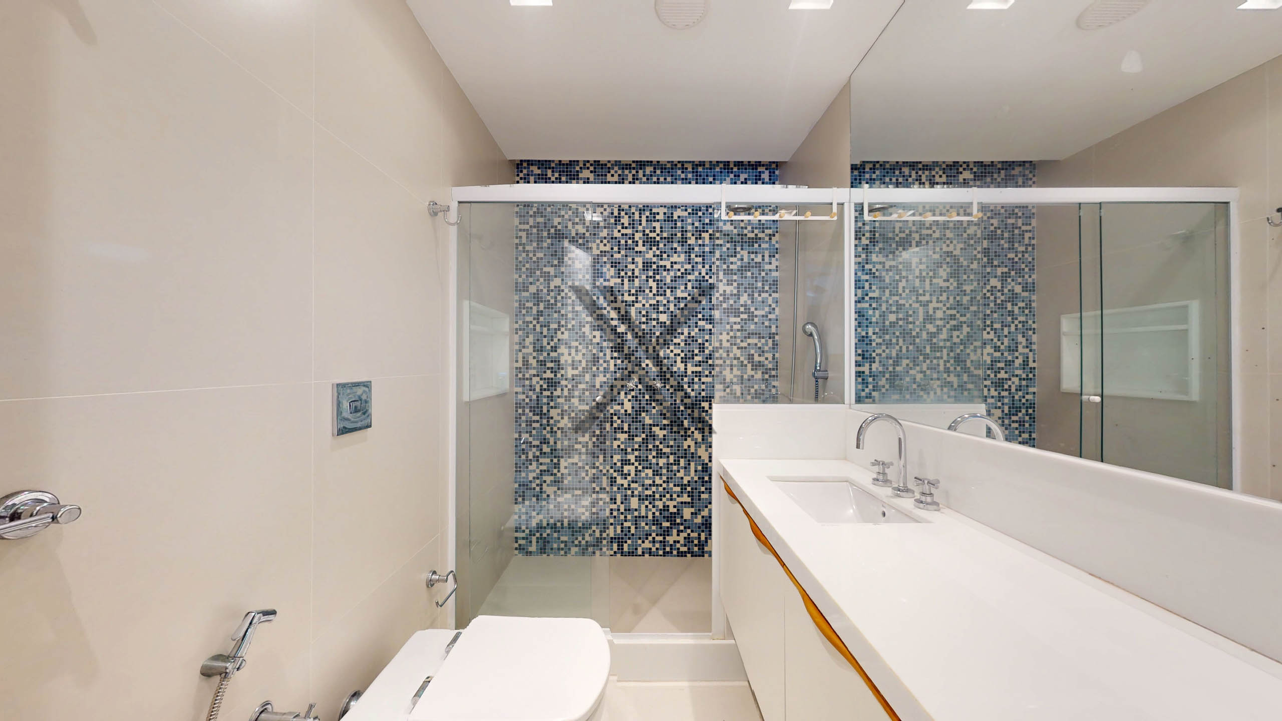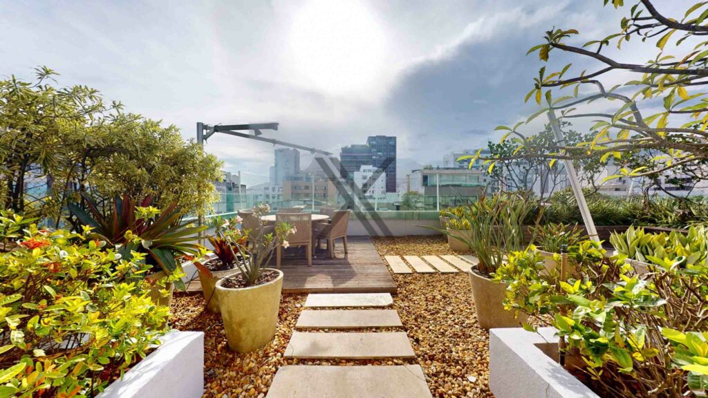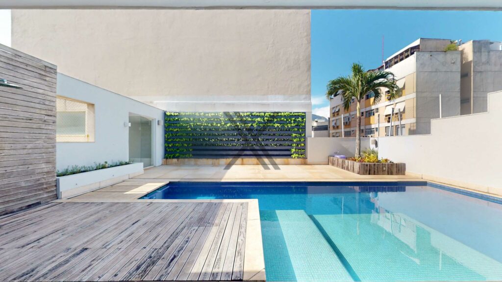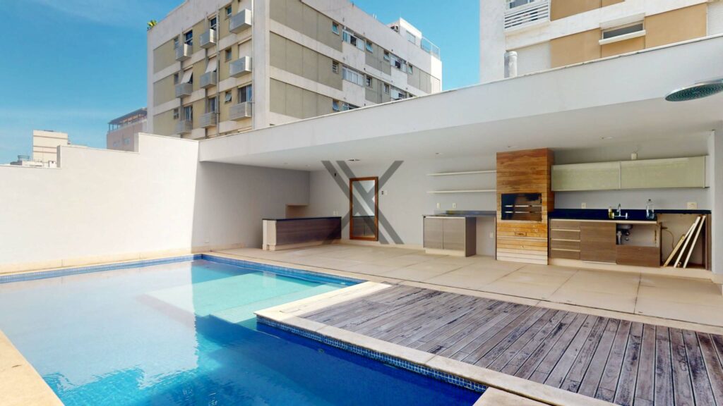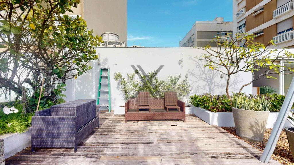 No segundo pavimento temos a área de lazer do imóvel, com sala de TV, piscina com chuveirão, espaço gourmet com churrasqueira, sauna e banheiro completo. Um lindo jardim privativo com vista para a praia do Leblon e para o Morro Dois Irmãos coroam esse belo espaço.